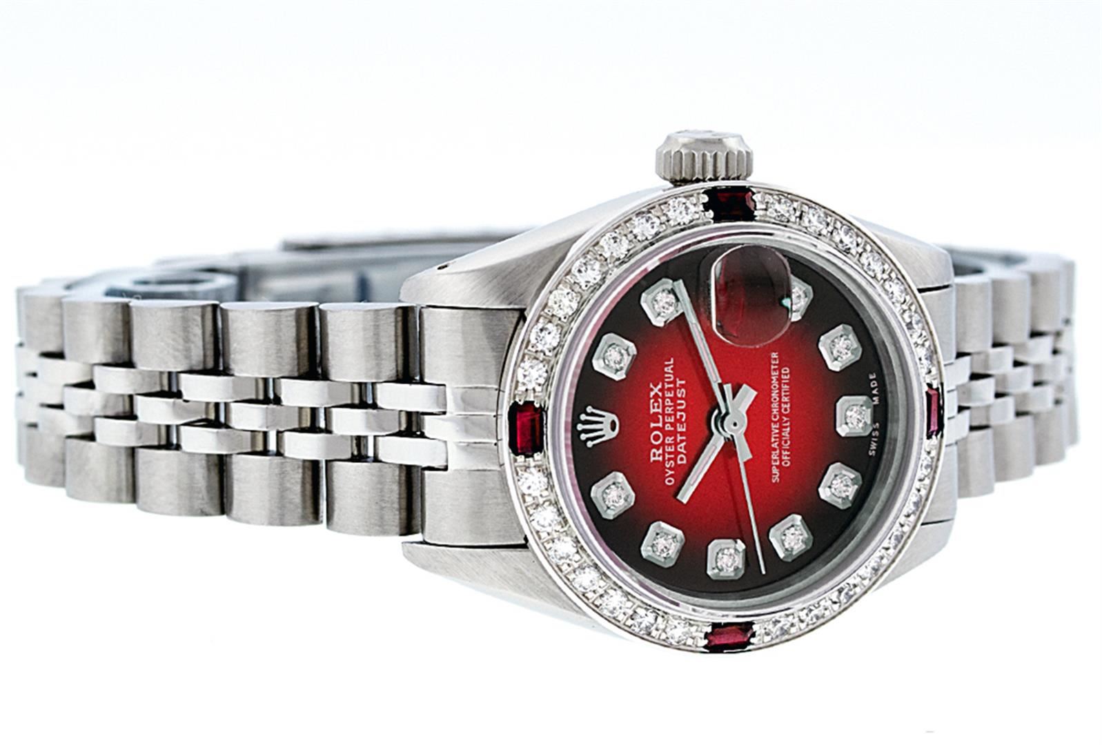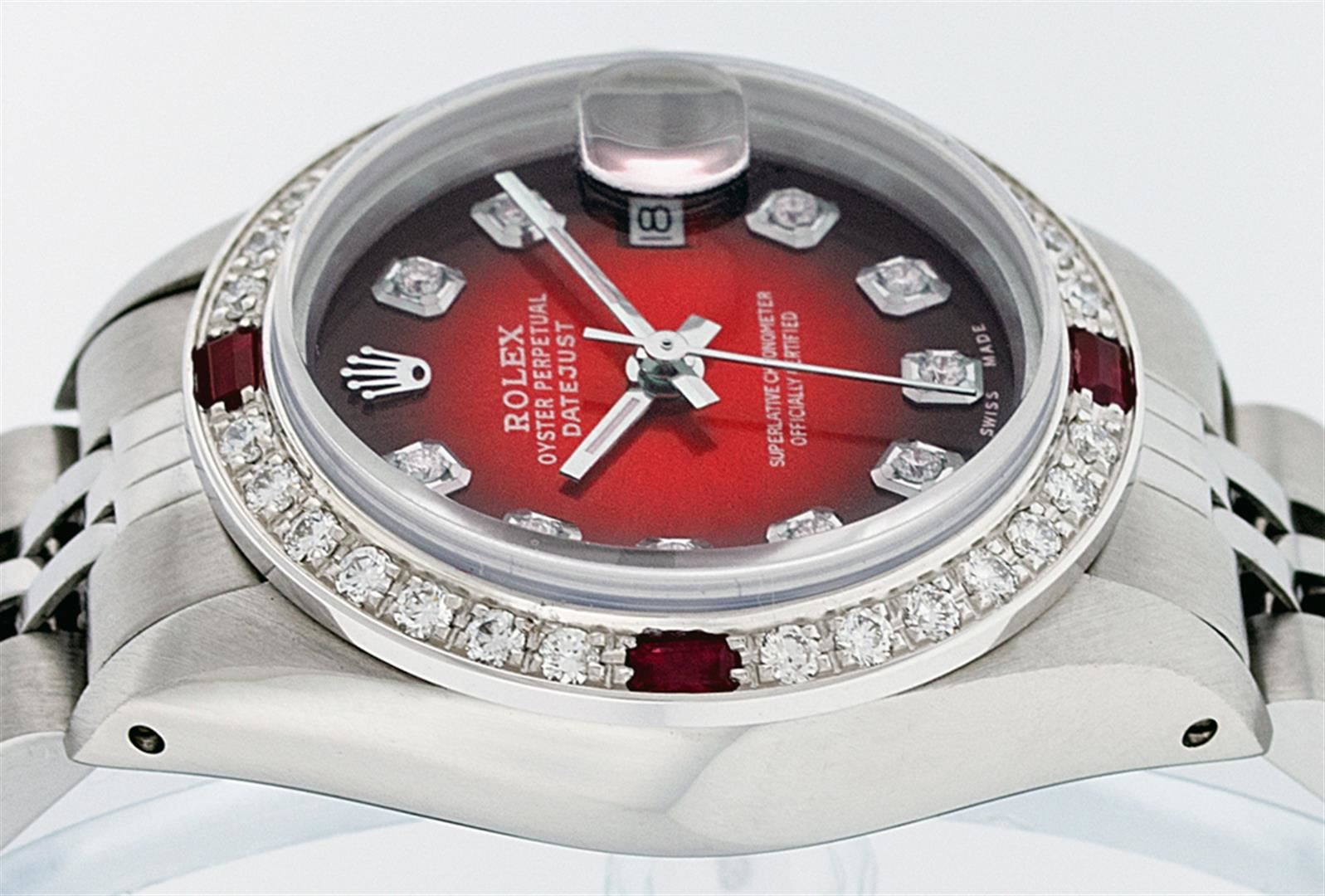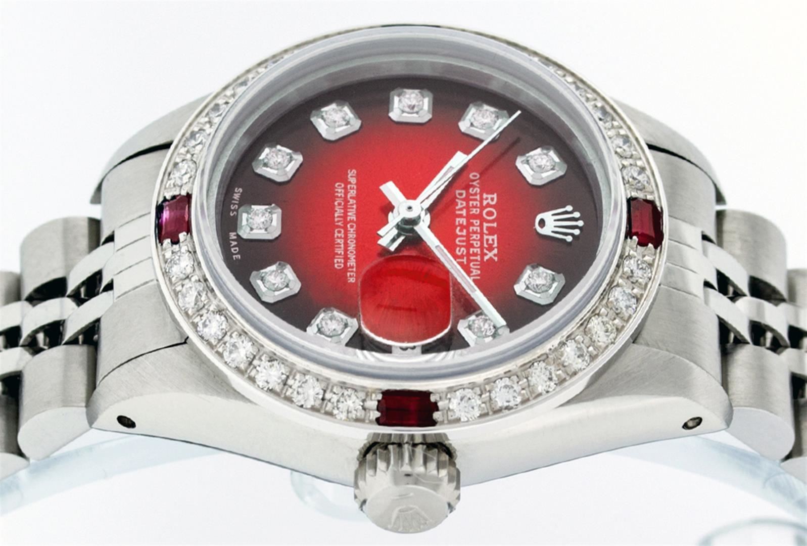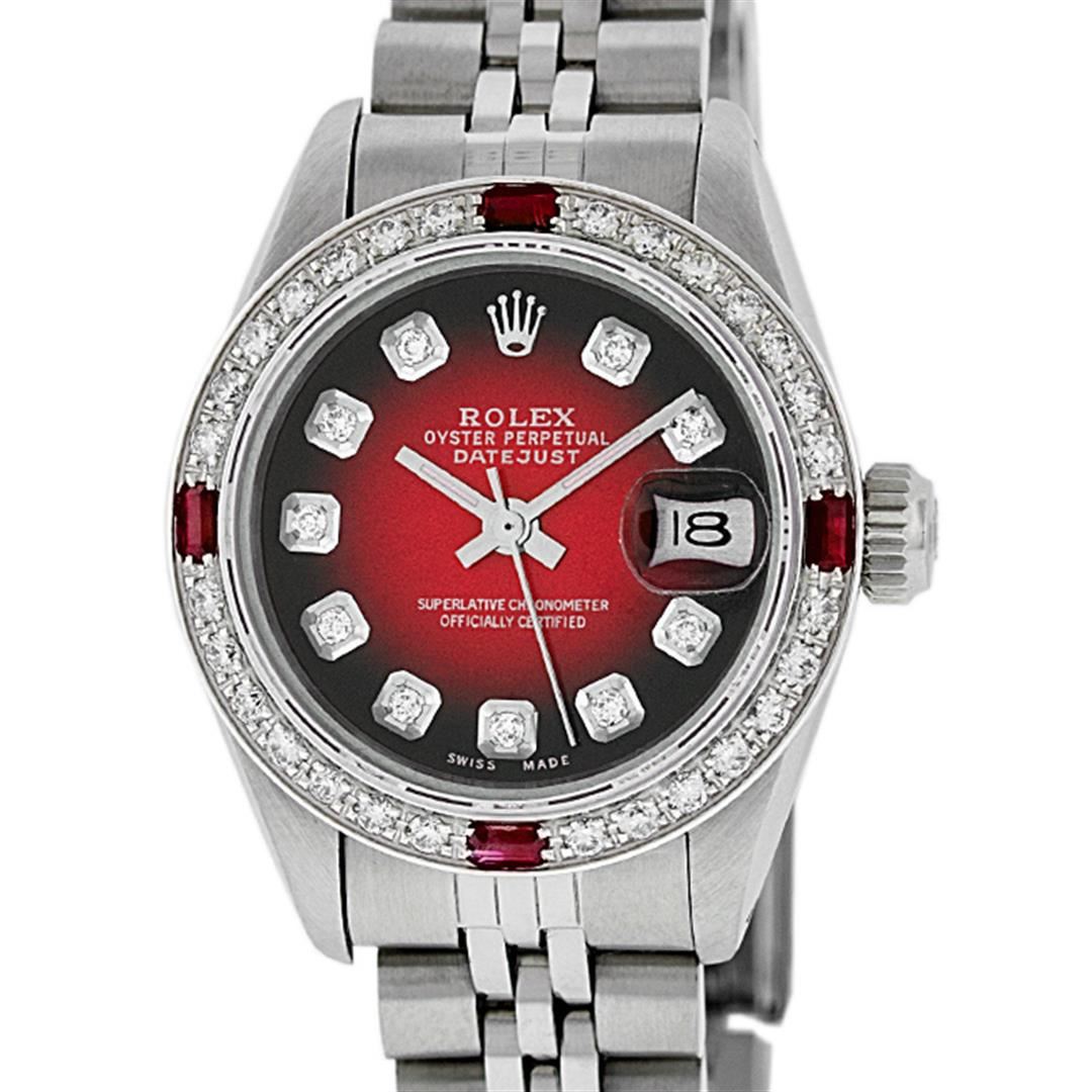 One Ladies Stainless Steel Rolex Datejust Polished Bright with Satin Finish, Serviced & Electronically Tested, Stainless Steel Case: 26mm, Stainless Steel Crown, Custom Bezel: New 18K White Gold Ruby Beadset Diamond Bezel, Diamond + Gem Count: 28 Diamonds + 4 Rubies. Total Weight .70 Carat, Clarity: SI-VS, Color: G to H. Custom Crystal: New Synthetic Sapphire Cyclops Lens. Custom Hands: New Luminescent Hands. Movement: Automatic Winding Movement. Custom Dial: Refinished Red Vignette With Diamond Hour Markers, 10 Diamond in Dial G To H In Color, Clarity: SI-VS. Date Window: 3 O'Clock Position Date Display, Model: Datejust. Condition: G-6 Extra Fine. Bracelet: Stainless Steel Jubilee. Bright Polish & Satin Finish. 6.0 Inch Length, Adjustable. Standard Clasp, With Rolex Logo. This Watch Has Been Serviced Time Tested And Is In Excellent Condition It Is Free Of All Scratches And Dents.