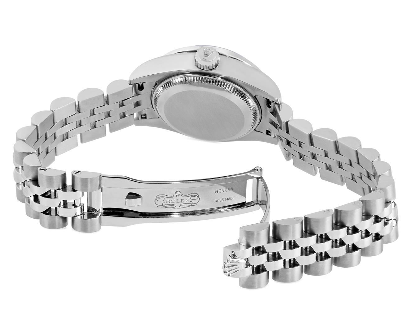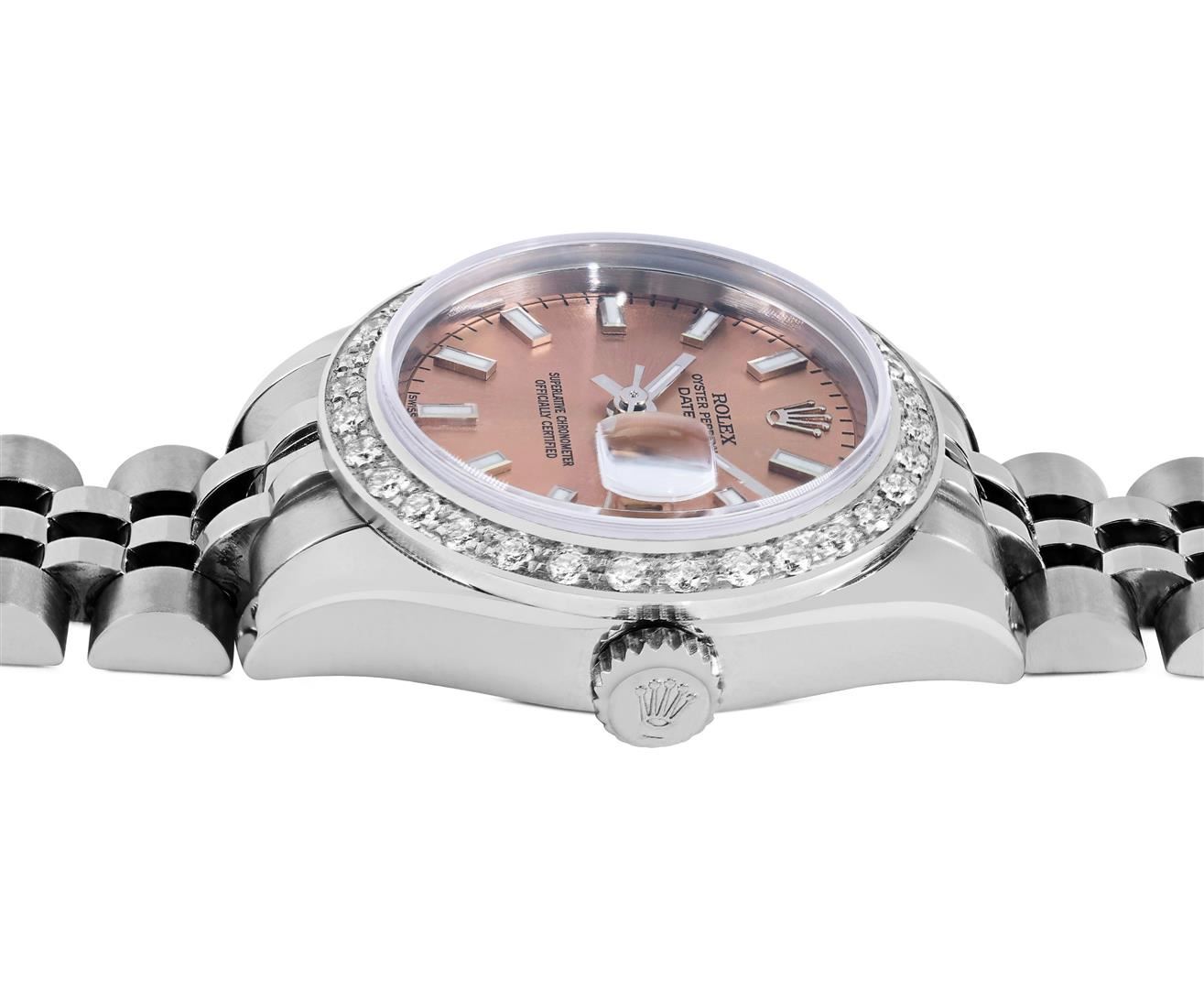 One Rolex Ladies Pre Owned Stainless Steel Datejust Wristwatch Polished Bright with Satin Finish, Serviced & Electronically Tested, Stainless Steel Case: 26mm, Stainless Steel Crown, Custom Bezel: New 18K White Gold Beadset Diamond Bezel, Diamond Count: 32 Diamonds, Total Weight .70 Carat, Clarity: SI-VS, Color: G to H. Crystal: Sapphire With Magnified Date Window. Custom Hands: Luminescent Hands. Rolex Movement: 2235 Automatic Winding Movement. Rolex Dial: Factory Salmon Luminescent Index Hour Markers. Date Window: 3 O'Clock Position Date Display, Model: Sapphire Quickset Datejust. Condition: G-6 Extra Fine. Rolex Bracelet: Stainless Steel Jubilee Band With Hidden Clasp. Bright Polish & Satin Finish. 6.0 Inch Length, Adjustable. Hidden Clasp, With Rolex Logo. This Watch Has Been Serviced And Time Tested. It Is In Excellent Condition, Free Of All Scratches And Dents.