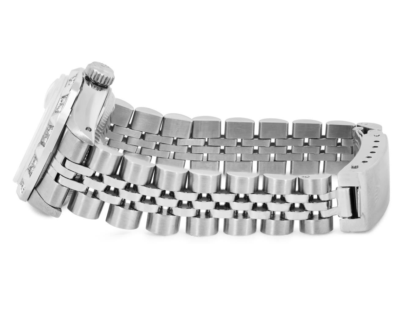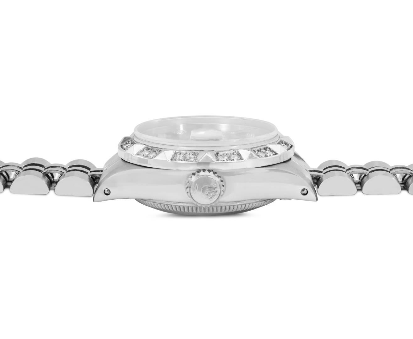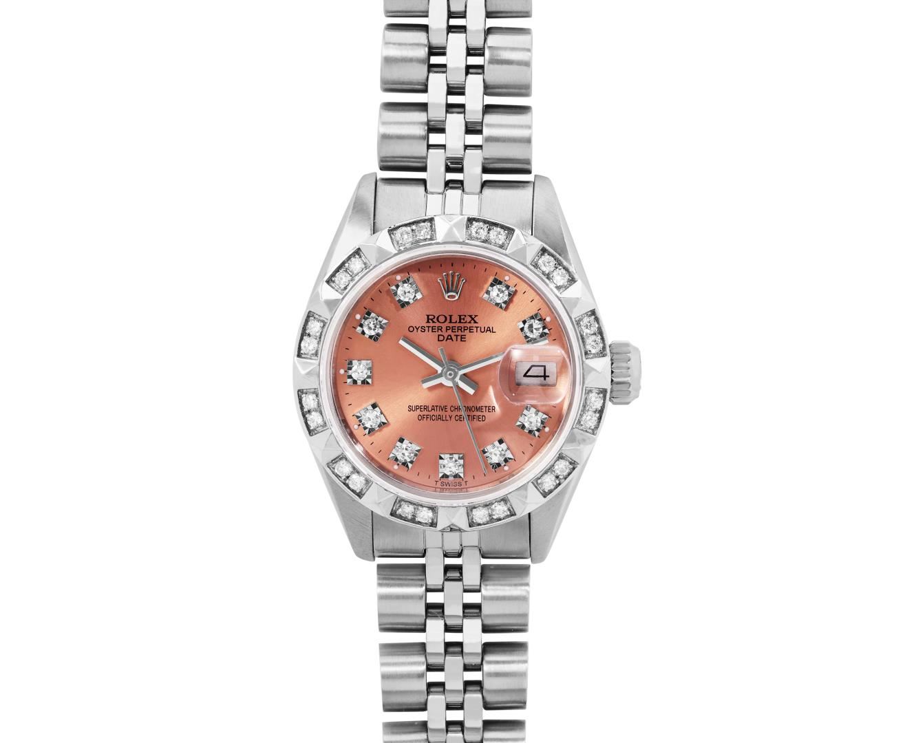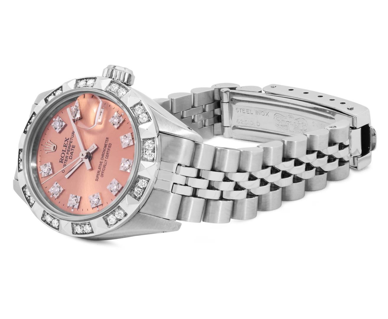 One Rolex Ladies Pre Owned Stainless Steel Date Wristwatch Polished Bright with Satin Finish, Serviced And Electronically Tested, Stainless Steel Case: 26mm, Stainless Steel Crown, Custom Bezel: New 18K White Gold Pyramid Diamond Bezel, Diamond Count: 24 Diamonds On Bezel. Custom Crystal: New Sapphire With Magnified Date Window. Custom Hands: New Solid Hands. Rolex Movement: Automatic Winding Movement 2035. Custom Dial: Custom Salmon Dial With Added Diamond Hour Markers Dash Track, and Lumi Dots. Date Window: 3 O'Clock Position Date Display, Model: Date. Condition: G-6 Extra Fine. Rolex Bracelet: Stainless Steel Jubilee Band. Bright Polish And Satin Finish. 6.0 Inch Length, Adjustable. Standard Clasp, With Rolex Logo. This Watch Has Been Serviced Time Tested And Is In Excellent Condition. It Is Free Of All Scratches And Dents.