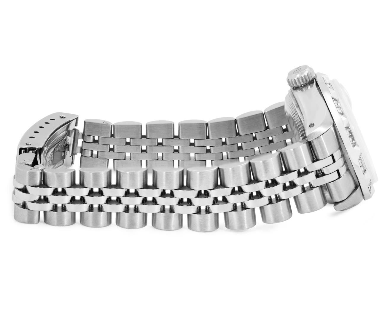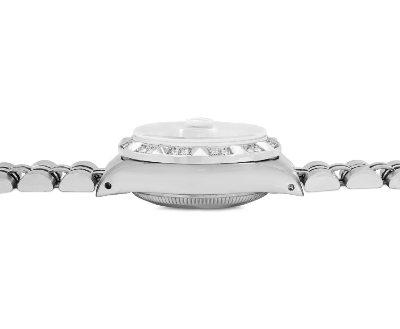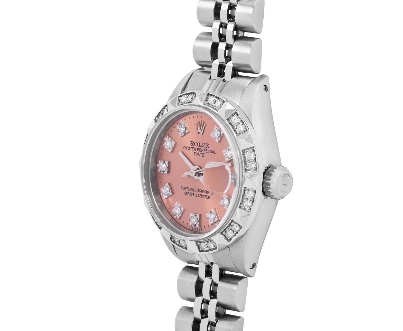 One Rolex Ladies Pre Owned Stainless Steel Date Wristwatch Polished Bright with Satin Finish, Serviced And Electronically Tested, Stainless Steel Case: 26mm, Stainless Steel Crown, Custom Bezel: New 18K White Gold Pyramid Diamond Bezel, Diamond Count: 24 Diamonds On Bezel. Custom Crystal: New Sapphire With Magnified Date Window. Custom Hands: New Solid Hands. Rolex Movement: Automatic Winding Movement 2035. Custom Dial: Custom Salmon Dial With Added Diamond Hour Markers Dash Track, and Lumi Dots. Date Window: 3 O'Clock Position Date Display, Model: Date. Condition: G-6 Extra Fine. Rolex Bracelet: Stainless Steel Jubilee Band. Bright Polish And Satin Finish. 6.0 Inch Length, Adjustable. Standard Clasp, With Rolex Logo. This Watch Has Been Serviced Time Tested And Is In Excellent Condition. It Is Free Of All Scratches And Dents.