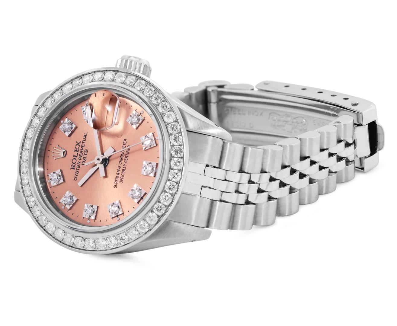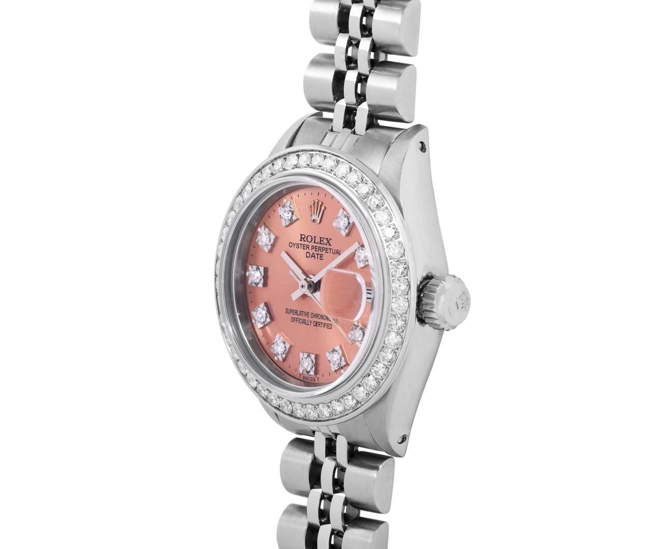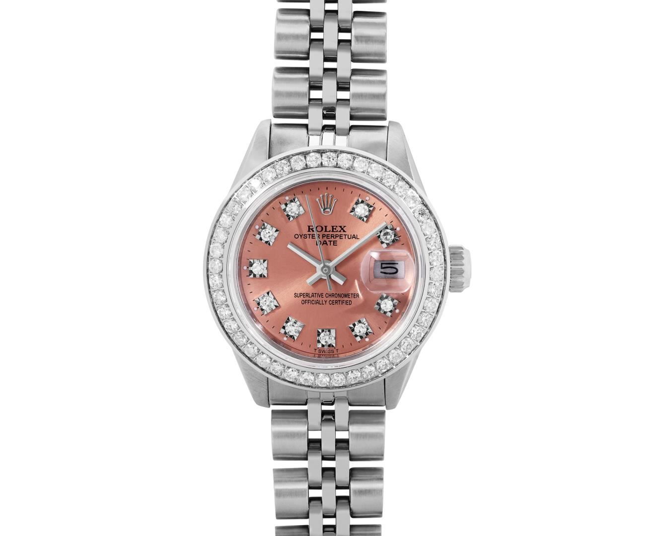 One Rolex Ladies Pre Owned Stainless Steel Date Wristwatch Polished Bright with Satin Finish, Serviced And Electronically Tested, Stainless Steel Case: 26mm, Stainless Steel Crown, Custom Bezel: New Stainless Steel Beadset Diamond Bezel, Diamond Count: 40 Diamonds. Custom Crystal: New Sapphire With Magnified Date Window. Custom Hands: New Solid Hands. Rolex Movement: Automatic Winding Movement 2035. Custom Dial: Custom Salmon Dial With Added Diamond Hour Markers And Lumi Dots, Diamond Count: 10 Diamonds On Dial. Date Window: 3 O'Clock Position Date Display, Model: Date. Condition: G-6 Extra Fine. Rolex Bracelet: Stainless Steel Jubilee Band. Bright Polish And Satin Finish. 6.0 Inch Length, Adjustable. Standard Clasp, With Rolex Logo. This Watch Has Been Serviced And Time Tested. It Is In Excellent Condition, Free Of All Scratches And Dents.