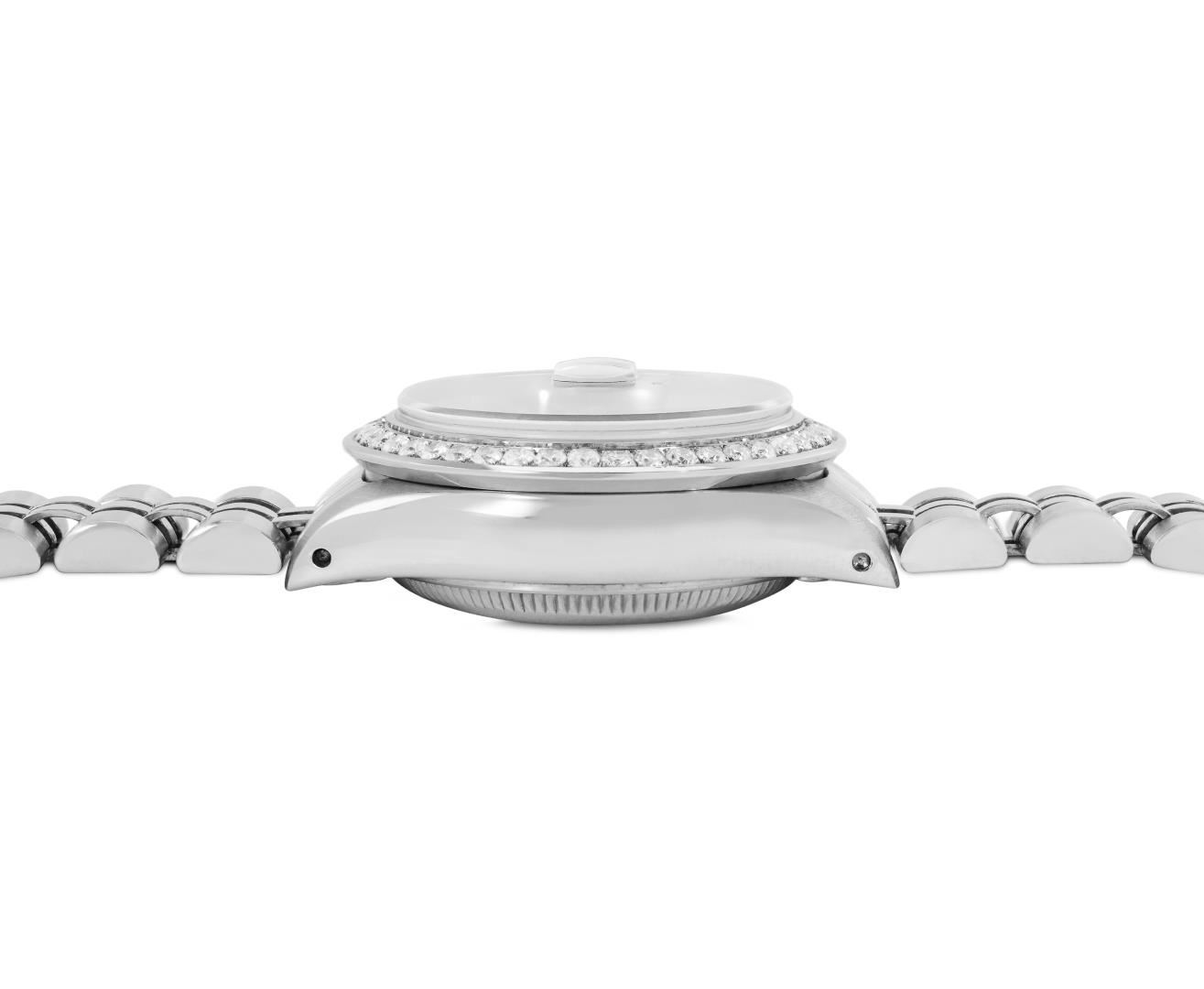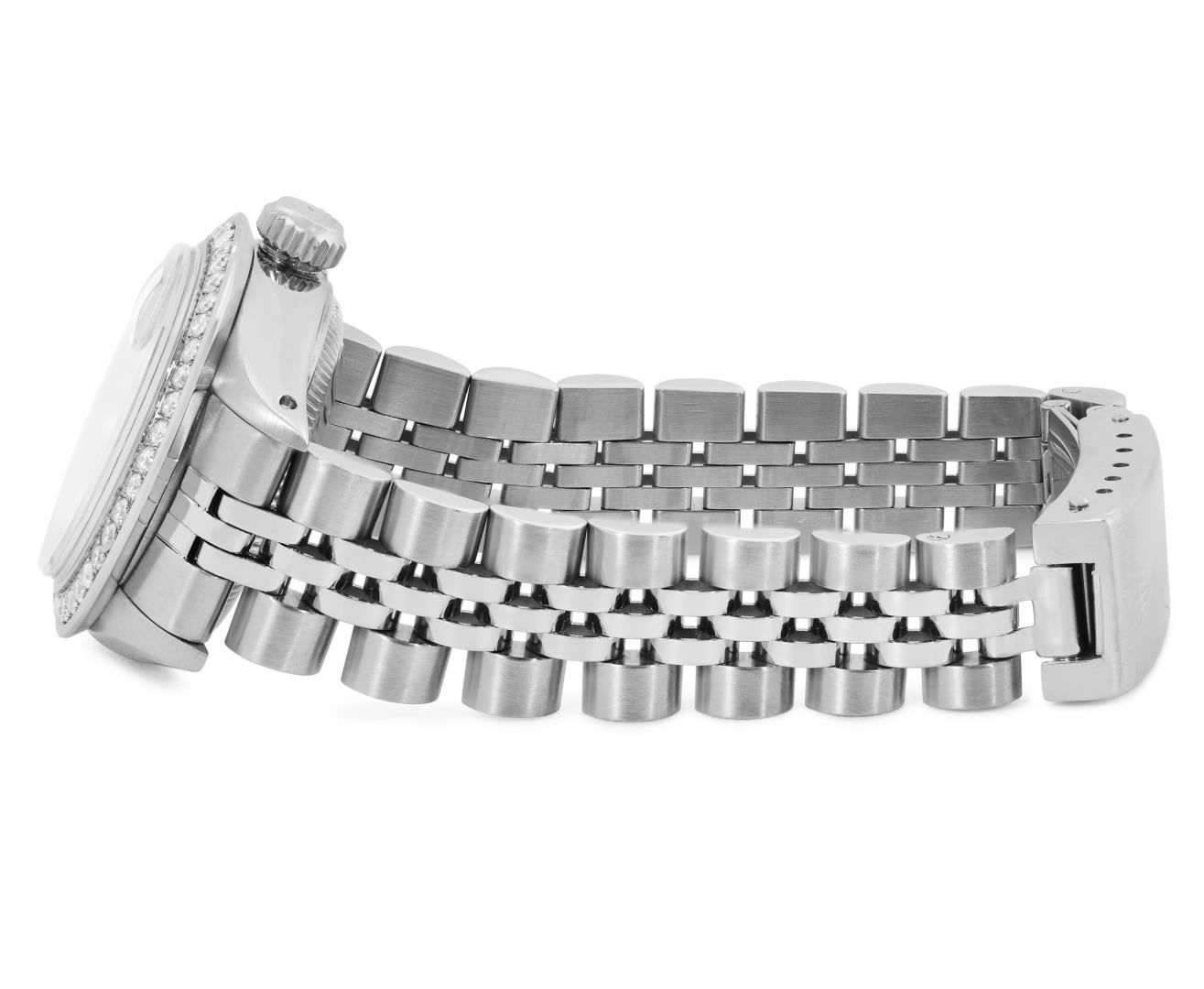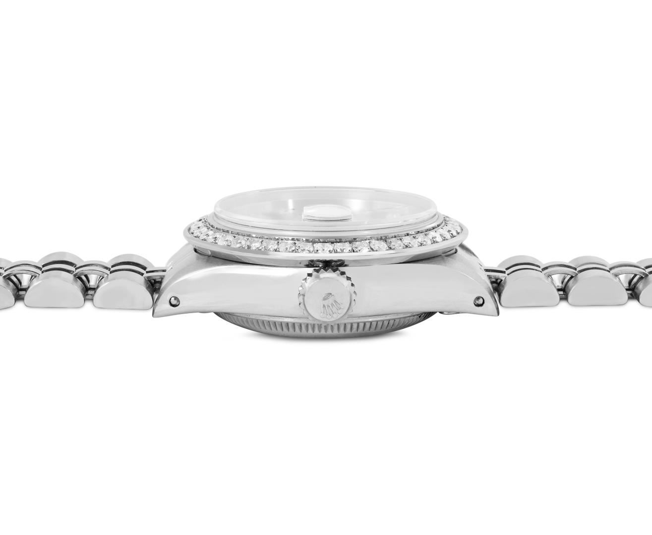 One Rolex Ladies Pre Owned Stainless Steel Date Wristwatch Polished Bright with Satin Finish, Serviced And Electronically Tested, Stainless Steel Case: 26mm, Stainless Steel Crown, Custom Bezel: New Stainless Steel Beadset Diamond Bezel, Diamond Count: 40 Diamonds. Custom Crystal: New Sapphire With Magnified Date Window. Custom Hands: New Solid Hands. Rolex Movement: Automatic Winding Movement 2035. Custom Dial: Custom Salmon Dial With Added Diamond Hour Markers And Lumi Dots, Diamond Count: 10 Diamonds On Dial. Date Window: 3 O'Clock Position Date Display, Model: Date. Condition: G-6 Extra Fine. Rolex Bracelet: Stainless Steel Jubilee Band. Bright Polish And Satin Finish. 6.0 Inch Length, Adjustable. Standard Clasp, With Rolex Logo. This Watch Has Been Serviced And Time Tested. It Is In Excellent Condition, Free Of All Scratches And Dents.