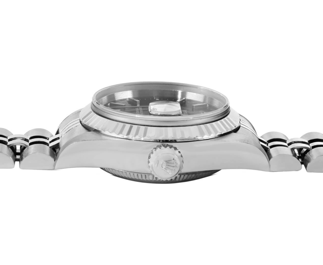 One Rolex Ladies Pre Owned Quickset Stainless Steel Datejust Wristwatch Polished Bright with Satin Finish, Serviced & Electronically Tested, Stainless Steel Case: 26mm, Stainless Steel Crown, Rolex Bezel: 18K White Gold Fluted Bezel, Crystal: Sapphire With Magnifying Date Window. Hands: Luminescent Hands. Rolex Movement: Rolex Automatic Movement Self Winding 2235. Rolex Dial: Factory Black With Index Hour Markers And Dash Track and Lumi Dots. Date Window: 3 O'Clock Position Date Display, Model: Quickset Sapphire Datejust. Condition: G-6 Extra Fine. Rolex Bracelet: Stainless Steel Jubilee Band. Bright Polish & Satin Finish. 6.0 Inch Length, Adjustable. Standard Clasp, With Rolex Logo. This Watch Has Been Serviced Time Tested And Is In Excellent Condition. It Is Free Of All Scratches And Dents.