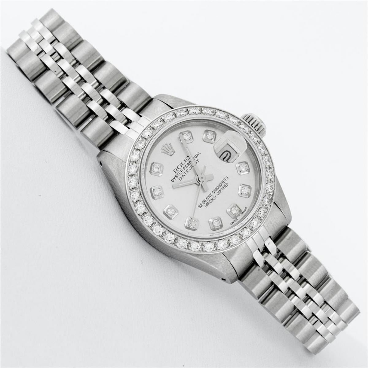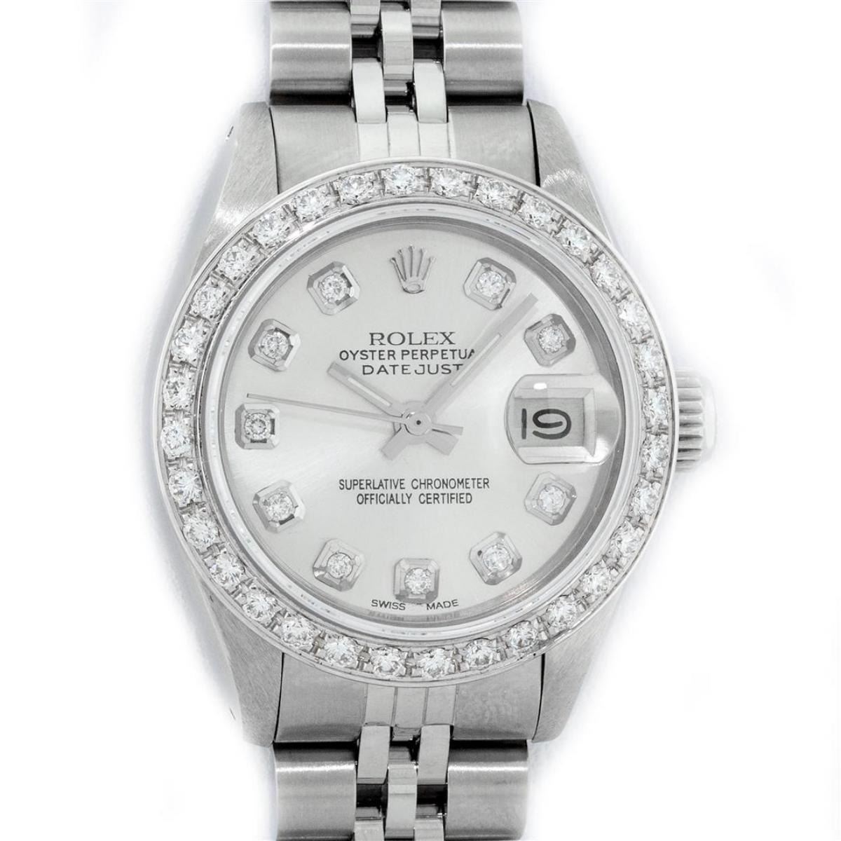 One Ladies Stainless Steel Rolex Oyster Perpetual Datejust Polished Bright with Satin Finish, Serviced & Electronically Tested, Stainless Steel Case: 26mm, Stainless Steel Crown, Custom Bezel: New 18K White Gold Beadset Diamond Bezel, Diamond Count: 32 Diamonds, Total Weight .70 Carat, Clarity: SI-VS, Color: G to H. Custom Crystal: New Scratch Resistant Synthetic Sapphire Cyclops Lens. Custom Hands: New Luminescent Hands. Movement: Automatic Winding Movement. Custom Dial: Refinished Silver Diamond Dial, Diamond Count: 10 Diamonds In Dial, Color: G To H, Clarity: SI-VS. Date Window: 3 O'Clock Position Date Display, Model: Datejust. Condition: G-6 Extra Fine. Bracelet: Stainless Steel Jubilee Band. Bright Polish & Satin Finish. 6.0 Inch Length, Adjustable. Standard Clasp, With Rolex Logo. This Watch Has Been Serviced Time Tested And Is In Excellent Condition It Is Free Of All Scratches And Dents.