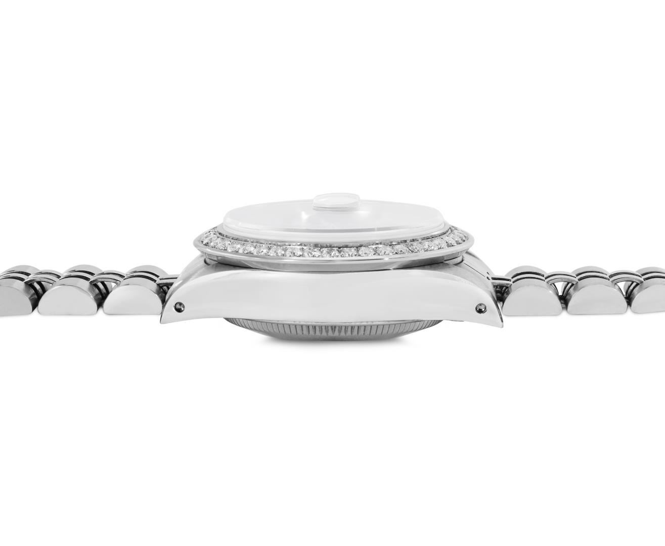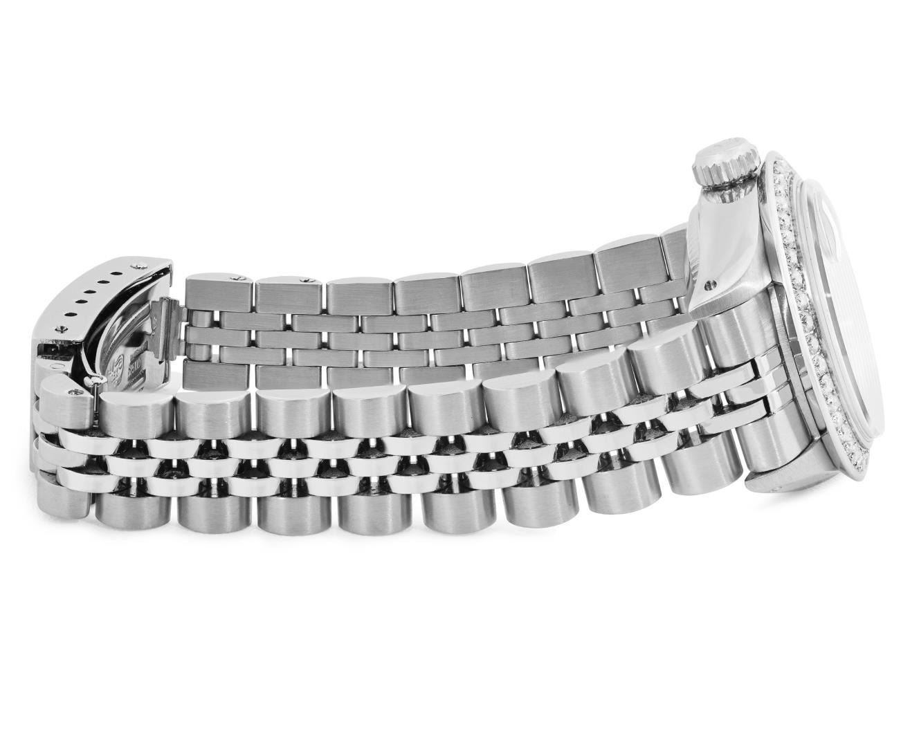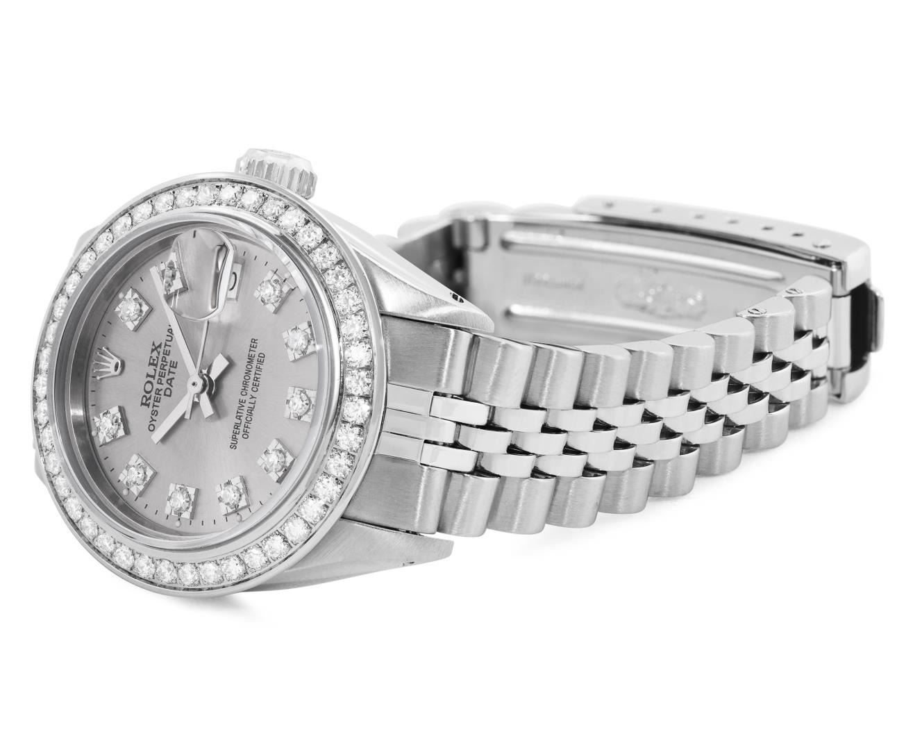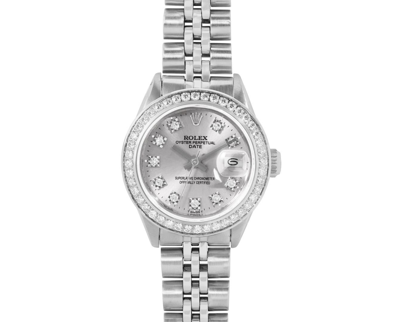 One Rolex Ladies Pre Owned Stainless Steel Date Wristwatch Polished Bright with Satin Finish, Serviced And Electronically Tested, Stainless Steel Case: 26mm, Stainless Steel Crown, Custom Bezel: New Stainless Steel Beadset Diamond Bezel, Diamond Count: 40 Diamonds. Custom Crystal: New Sapphire With Magnified Date Window. Custom Hands: New Solid Hands. Rolex Movement: Automatic Winding Movement 2035. Custom Dial: Custom Gray Dial With Added Diamond Hour Markers And Lumi Dots, Diamond Count: 10 Diamonds On Dial. Date Window: 3 O'Clock Position Date Display, Model: Date. Condition: G-6 Extra Fine. Rolex Bracelet: Stainless Steel Jubilee Band. Bright Polish And Satin Finish. 6.0 Inch Length, Adjustable. Standard Clasp, With Rolex Logo. This Watch Has Been Serviced And Time Tested. It Is In Excellent Condition, Free Of All Scratches And Dents.