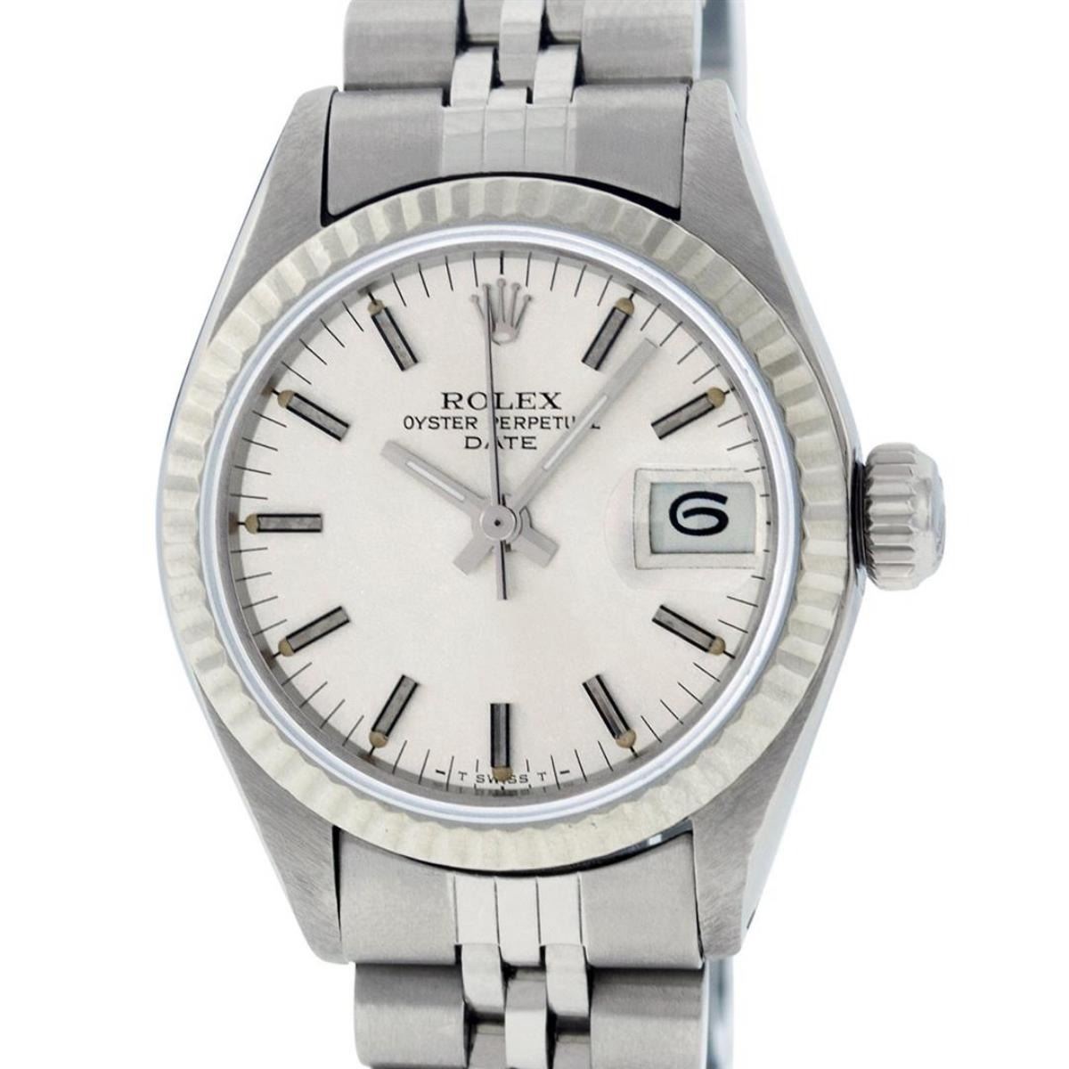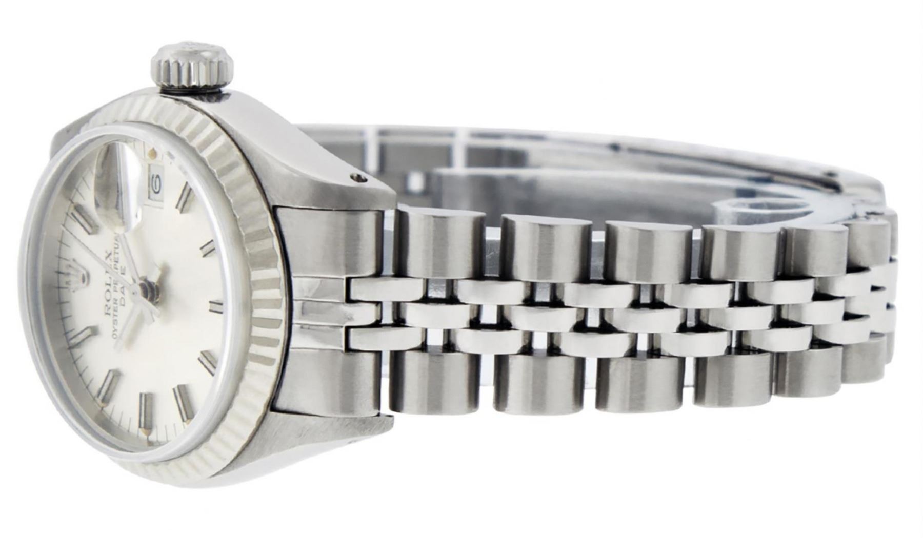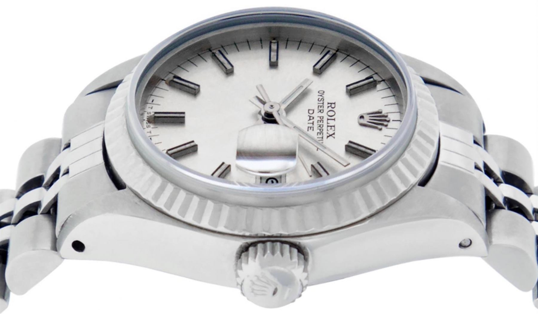 One Ladies Stainless Steel Rolex Datejust Polished Bright with Satin Finish, Serviced & Electronically Tested, Stainless Steel Case: 26mm, Stainless Steel Crown, Bezel: 14K White Gold Bezel. Custom Crystal: New Acrylic Cyclops Lens. Custom Hands: New Luminescent Hands. Movement: Automatic Winding Movement. Dial: Silver Index Dial. Date Window: 3 O'Clock Position Date Display, Model: Datejust. Condition: G-6 Extra Fine. Bracelet: Stainless Steel Jubilee Band. Bright Polish & Satin Finish. 6.0 Inch Length, Adjustable. Standard Clasp, With Rolex Logo. This Watch Has Been Serviced Time Tested And Is In Excellent Condition It Is Free Of All Scratches And Dents.