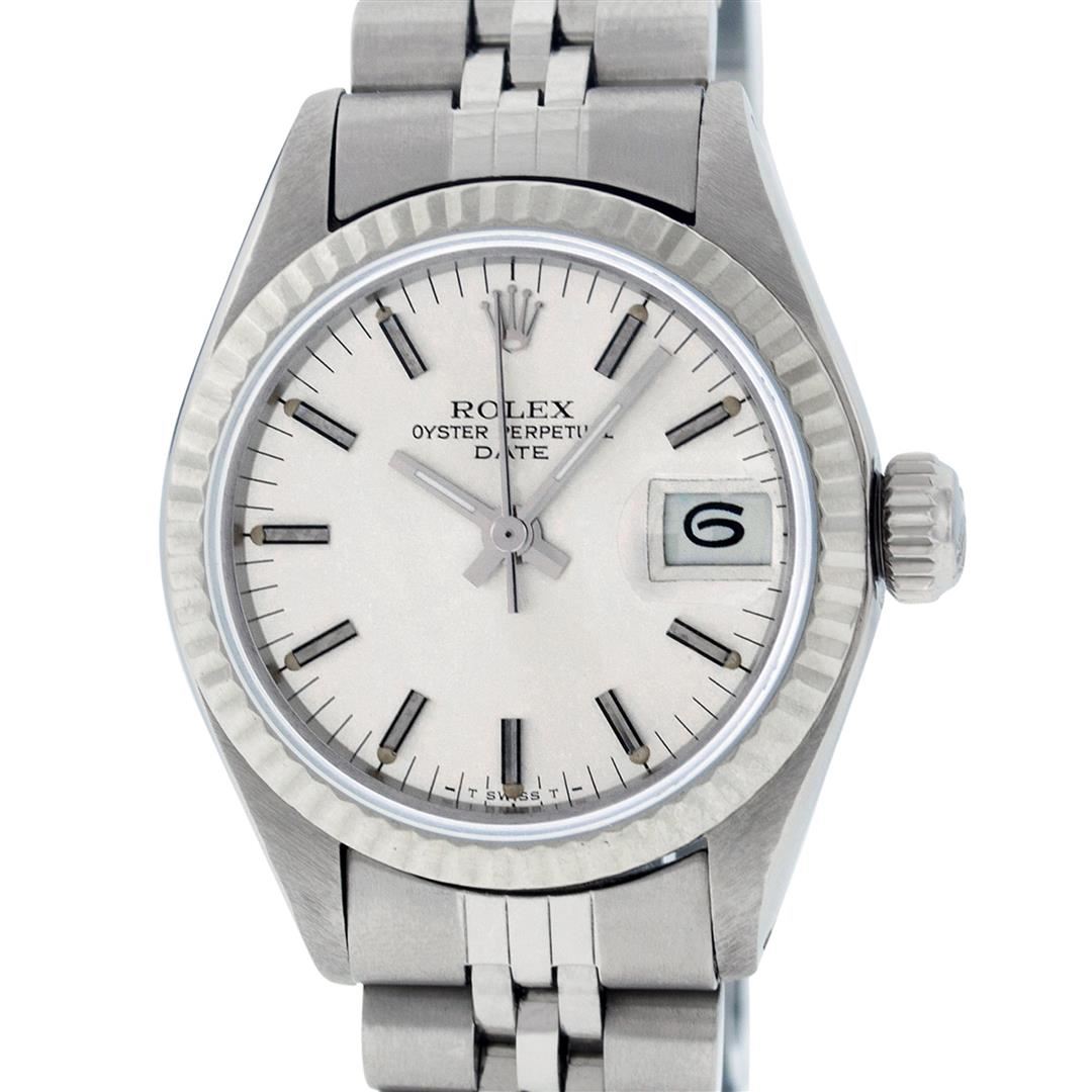 One Ladies Pre Owned Stainless Steel Rolex Datejust Polished Bright with Satin Finish, Serviced & Electronically Tested, Rolex Stainless Steel Case: 26mm, Rolex Stainless Steel Crown, Rolex Bezel: 14K White Gold Bezel. Custom Crystal: New Acrylic With Magnified Date Window. Custom Hands: New Luminescent Hands. Rolex Movement: Automatic Winding Movement. Rolex Dial: Silver Index With Dash Track. Date Window: 3 O'Clock Position Date Display, Model: Datejust. Condition: G-6 Extra Fine. Rolex Bracelet: Stainless Steel Jubilee Band. Bright Polish & Satin Finish. 6.0 Inch Length, Adjustable. Standard Clasp, With Rolex Logo. This Watch Has Been Serviced Time Tested And Is In Excellent Condition It Is Free Of All Scratches And Dents.