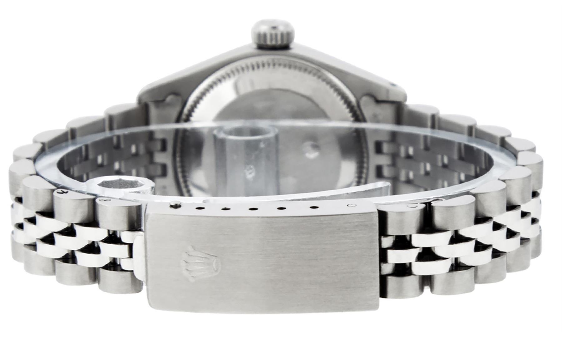 One Ladies Pre Owned Stainless Steel Rolex Datejust Polished Bright with Satin Finish, Serviced & Electronically Tested, Rolex Stainless Steel Case: 26mm, Rolex Stainless Steel Crown, Rolex Bezel: 14K White Gold Bezel. Custom Crystal: New Acrylic With Magnified Date Window. Custom Hands: New Luminescent Hands. Rolex Movement: Automatic Winding Movement. Rolex Dial: Silver Index With Dash Track. Date Window: 3 O'Clock Position Date Display, Model: Datejust. Condition: G-6 Extra Fine. Rolex Bracelet: Stainless Steel Jubilee Band. Bright Polish & Satin Finish. 6.0 Inch Length, Adjustable. Standard Clasp, With Rolex Logo. This Watch Has Been Serviced Time Tested And Is In Excellent Condition It Is Free Of All Scratches And Dents.