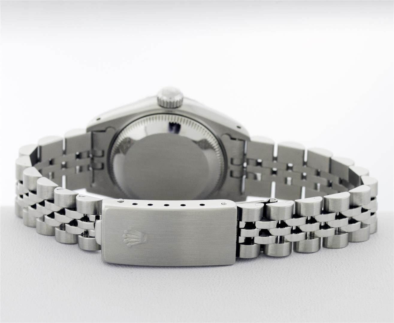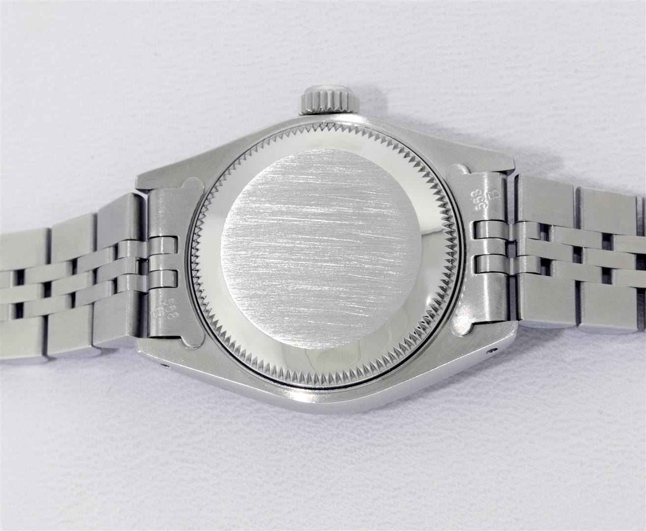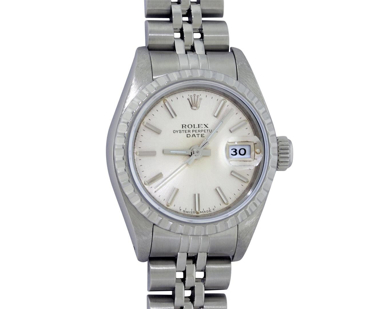One Ladies Pre Owned Quickset Stainless Steel Rolex Datejust Polished Bright with Satin Finish, Serviced & Electronically Tested, Rolex Stainless Steel Case: 26mm, Rolex Stainless Steel Crown, Rolex Bezel: Stainless Steel Engine Turn Bezel. Custom Crystal: Sapphire With Magnified Date Window. Hands: Luminescent Hands. Rolex Movement: Quickset Automatic Winding Movement. Rolex Dial: Silver Index Dial With Luminescent Dots & Dash Track. Date Window: 3 O'Clock Position Date Display, Model: Sapphire Quickset Datejust Caliber 2130. Condition: G-6 Extra Fine. Rolex Bracelet: Stainless Steel Jubilee Band. Bright Polish & Satin Finish. 6.0 Inch Length, Adjustable. Standard Clasp, With Rolex Logo. This Watch Has Been Serviced Time Tested And Is In Excellent Condition It Is Free Of All Scratches And Dents.