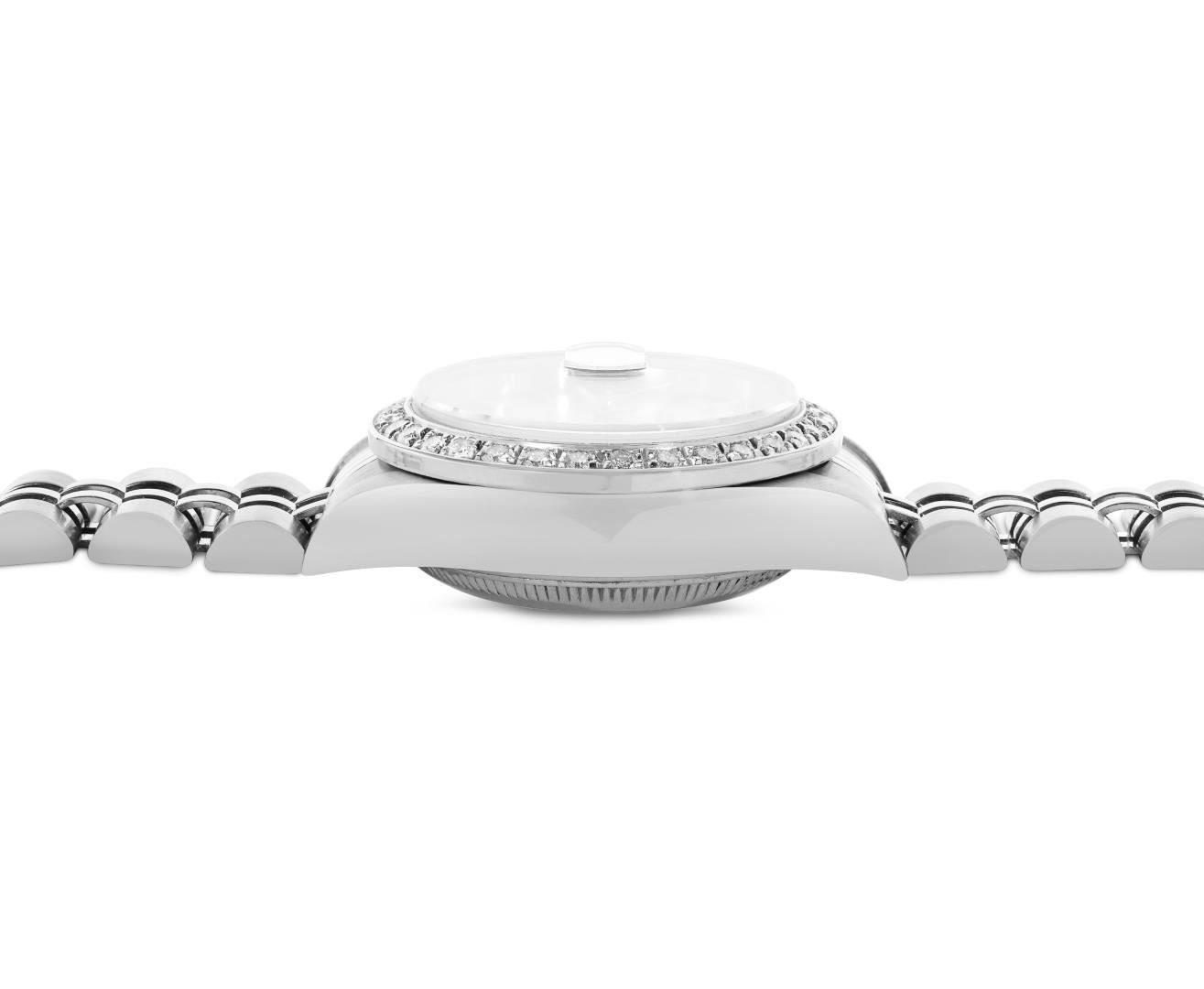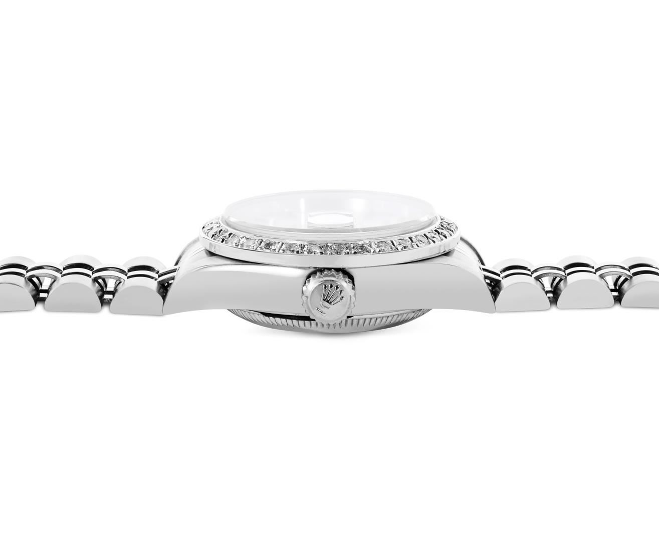 One Rolex Ladies Pre Owned Quickset Stainless Steel Datejust Wristwatch Polished Bright with Satin Finish, Serviced And Electronically Tested, Stainless Steel Case: 26mm, Stainless Steel Crown, Custom Bezel: New 18K White Gold Beadset Diamond Bezel, Diamond Count: 32 Diamonds. Custom Crystal: New Sapphire With Magnified Date Window. Custom Hands: New Luminescent Hands. Rolex Movement: 2235 Automatic Winding Movement. Rolex Dial: Factory Silver With Index Hour Markers, and Square Track. Date Window: 3 O'Clock Position Date Display, Model: Quickset Datejust. Condition: G-6 Extra Fine. Rolex Bracelet: Stainless Steel Jubilee Band. Bright Polish & Satin Finish. 6.0 Inch Length, Adjustable. Standard Clasp, With Rolex Logo. This Watch Has Been Serviced Time Tested And Is In Excellent Condition. It Is Free Of All Scratches And Dents.