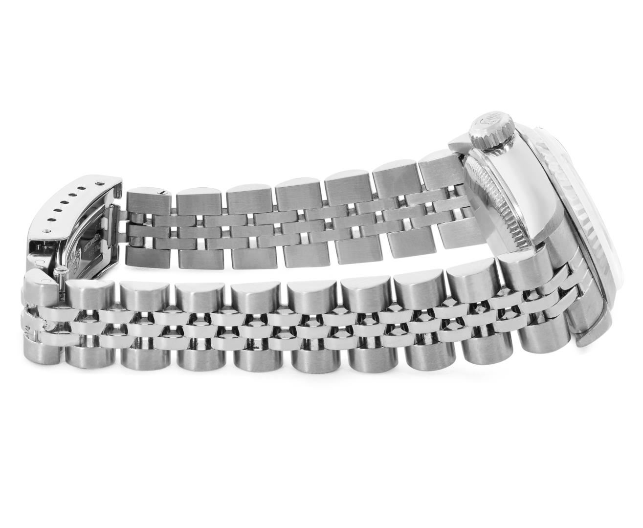 One Rolex Ladies Pre Owned Quickset Stainless Steel Datejust Wristwatch Polished Bright with Satin Finish, Serviced And Electronically Tested, Stainless Steel Case: 26mm, Stainless Steel Crown, Rolex Bezel: 18K White Gold Fluted Bezel. Crystal: Sapphire With Magnified Date Window. Hands: Luminescent Hands. Rolex Movement: 2235 Automatic Winding Movement. Rolex Dial: Factory Silver WithIndex Hour Markers, and Dash Track. Date Window: 3 O'Clock Position Date Display, Model: Quickset Datejust. Condition: G-6 Extra Fine. Rolex Bracelet: Stainless Steel Jubilee Band. Bright Polish And Satin Finish. 6.0 Inch Length, Adjustable. Standard Clasp, With Rolex Logo. This Watch Has Been Serviced Time Tested And Is In Excellent Condition. It Is Free Of All Scratches And Dents.