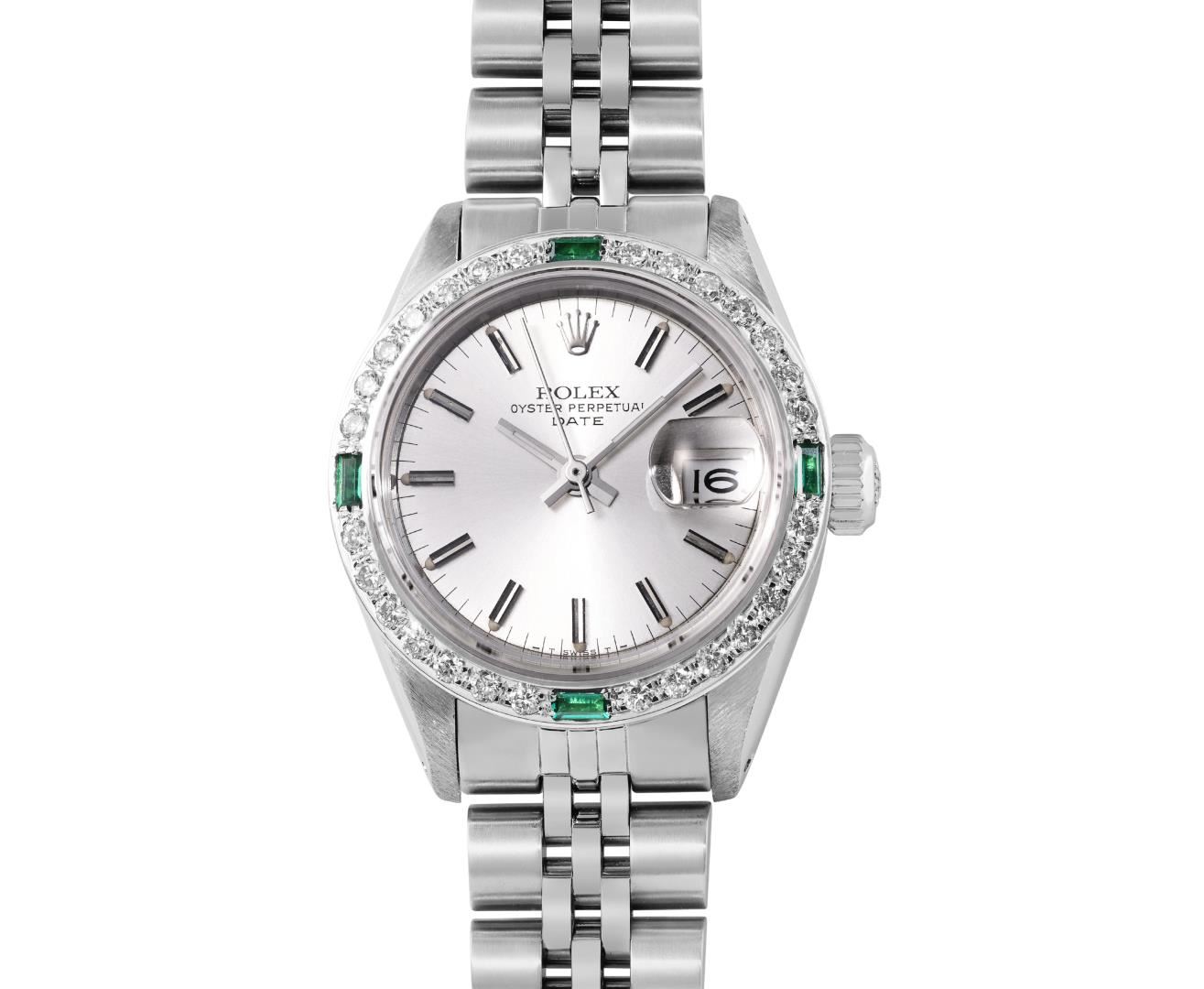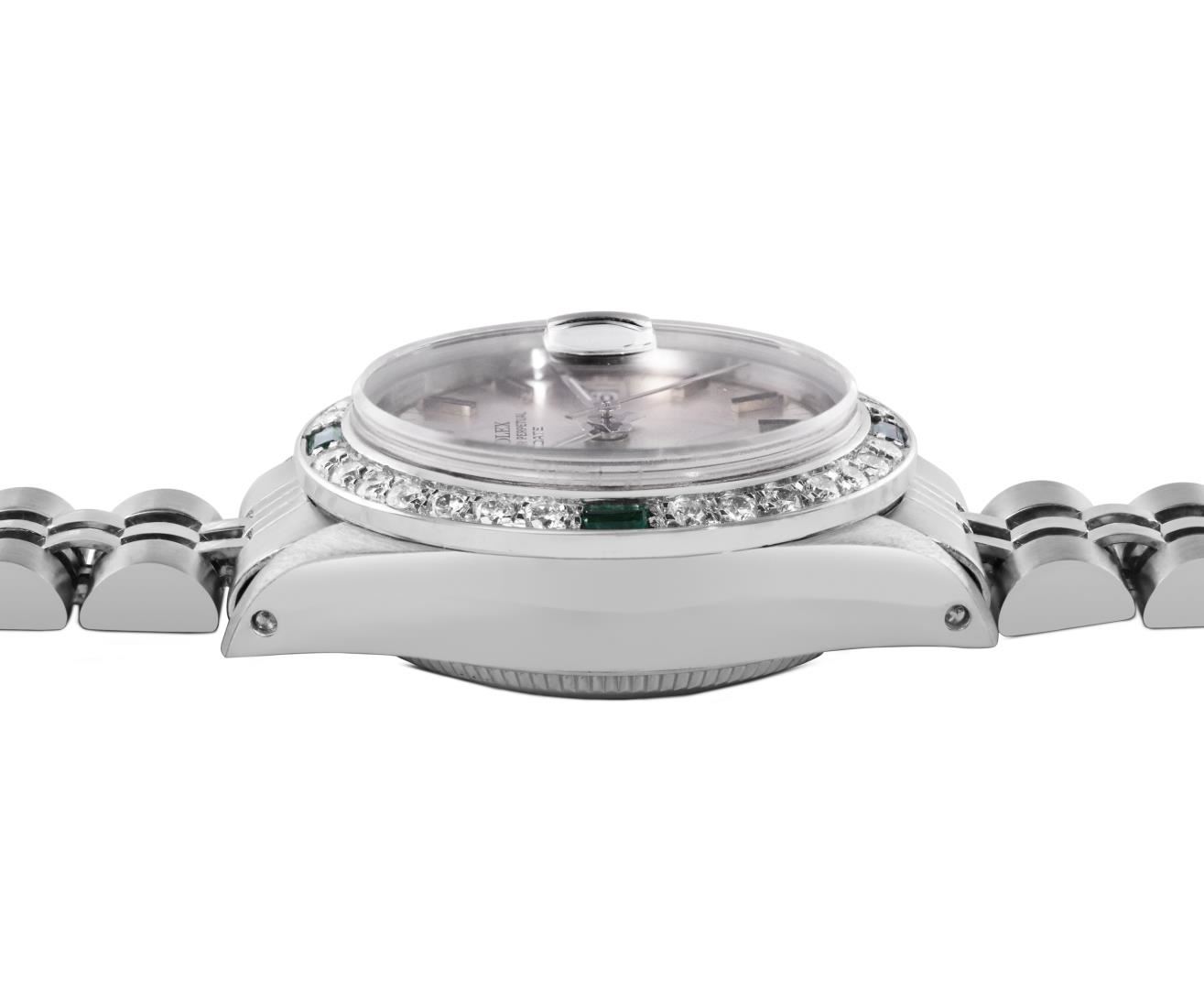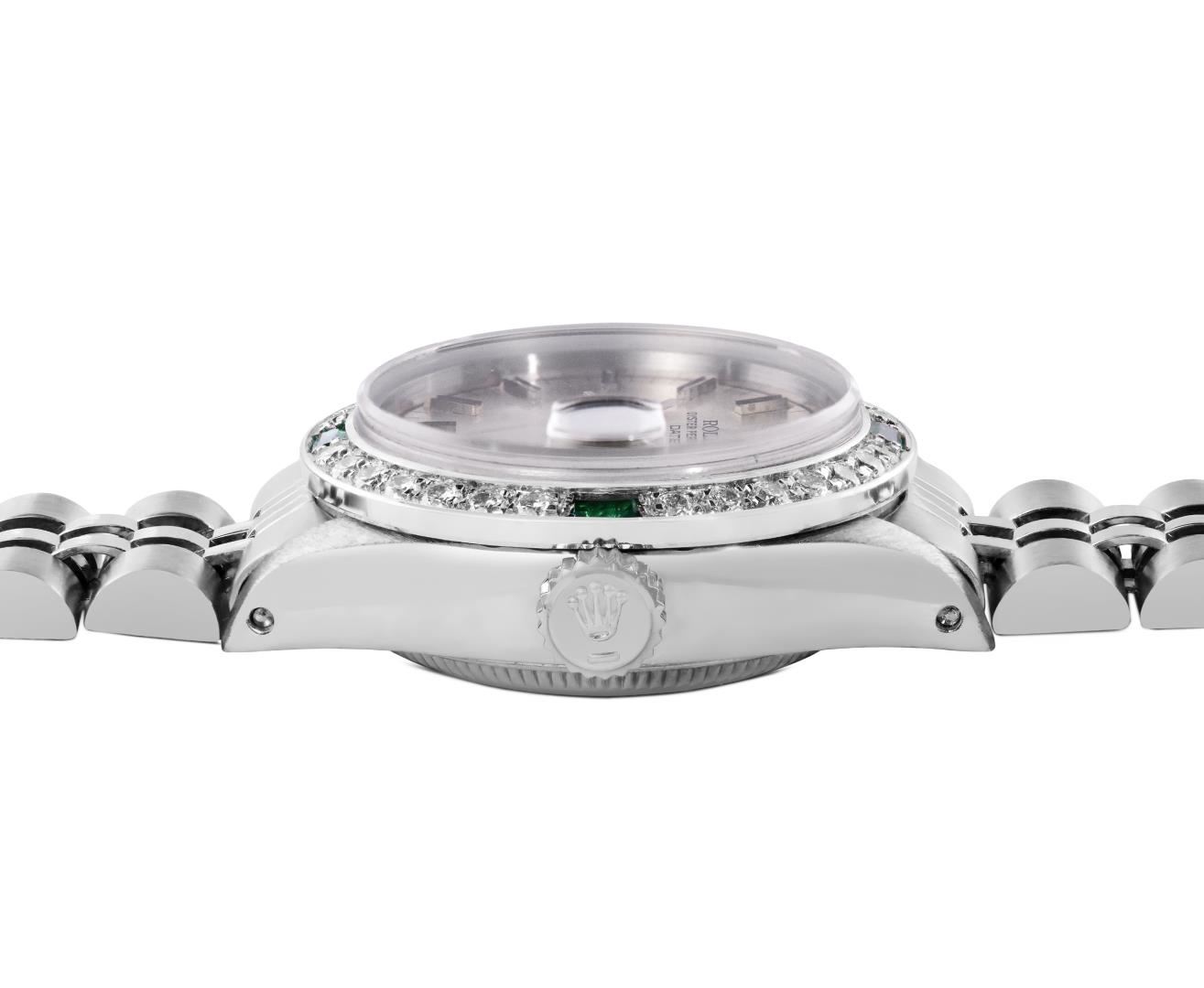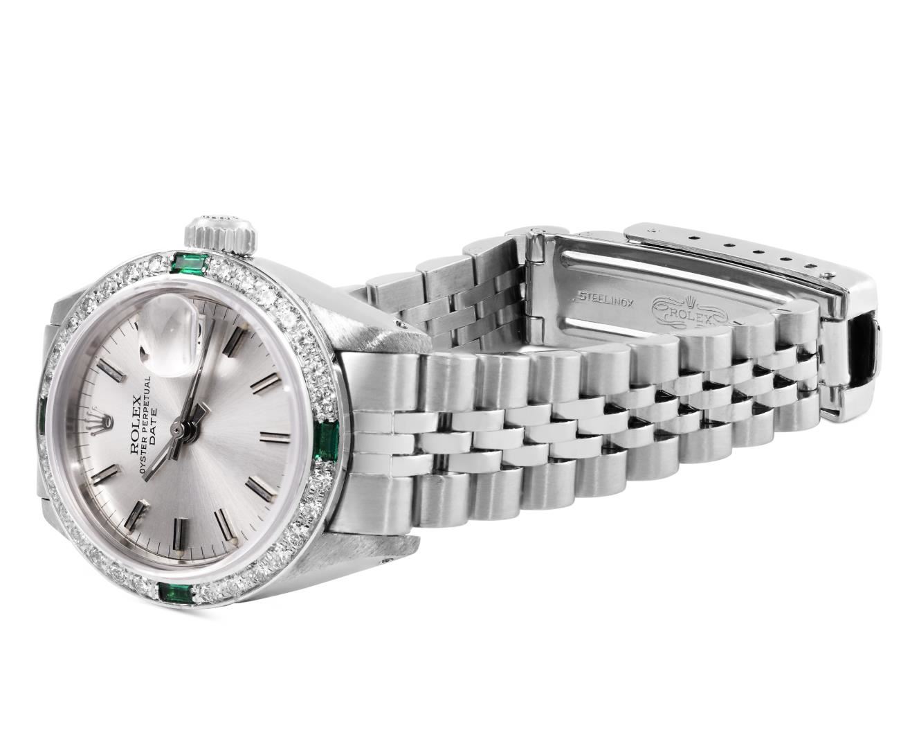 One Rolex Ladies Pre Owned Stainless Steel Date Wristwatch Polished Bright with Satin Finish, Serviced And Electronically Tested, Stainless Steel Case: 26mm, Stainless Steel Crown, Custom Bezel: New 18K White Gold Emerald Beadset Diamond Bezel, Diamond + Gem Count: 36 Diamonds + 4 Emeralds. Custom Crystal: New Sapphire With Magnified Date Window. Custom Hands: New Luminescent Hands. Rolex Movement: Automatic Winding Movement 2035. Rolex Dial: Factory Silver With Index Hour Markers, Lumi Dots, and Dash Tracks. Date Window: 3 O'Clock Position Date Display, Model: Date. Condition: G-6 Extra Fine. Rolex Bracelet: Stainless Steel Jubilee Band. Bright Polish & Satin Finish. 6.0 Inch Length, Adjustable. Standard Clasp, With Rolex Logo. This Watch Has Been Serviced Time Tested And Is In Excellent Condition. It Is Free Of All Scratches And Dents.