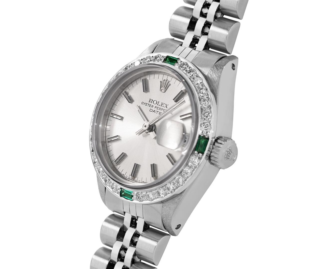 One Rolex Ladies Pre Owned Stainless Steel Date Wristwatch Polished Bright with Satin Finish, Serviced & Electronically Tested, Stainless Steel Case: 26mm, Stainless Steel Crown, Custom Bezel: New 18K White Gold Emerald Beadset Diamond Bezel, Diamond + Gem Count: 36 Diamonds + 4 Emeralds, Clarity: SI-VS, Color: G to H. Custom Crystal: New Sapphire With Magnified Date Window. Custom Hands: New Luminescent Hands. Rolex Movement: Automatic Winding Movement 2030. Rolex Dial: Factory Silver Dial With Index Hour Markers, Lumi Dots, and Dash Tracks. Date Window: 3 O'Clock Position Date Display, Model: Date. Condition: G-6 Extra Fine. Rolex Bracelet: Stainless Steel Jubilee Band. Bright Polish & Satin Finish. 6.0 Inch Length, Adjustable. Standard Clasp, With Rolex Logo. This Watch Has Been Serviced Time Tested And Is In Excellent Condition. It Is Free Of All Scratches And Dents.