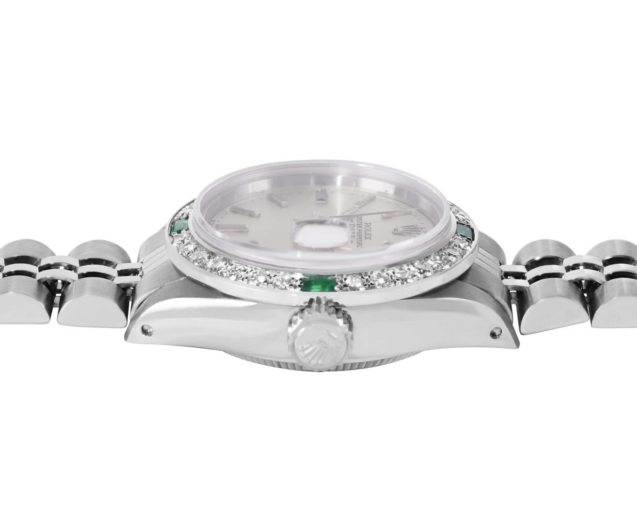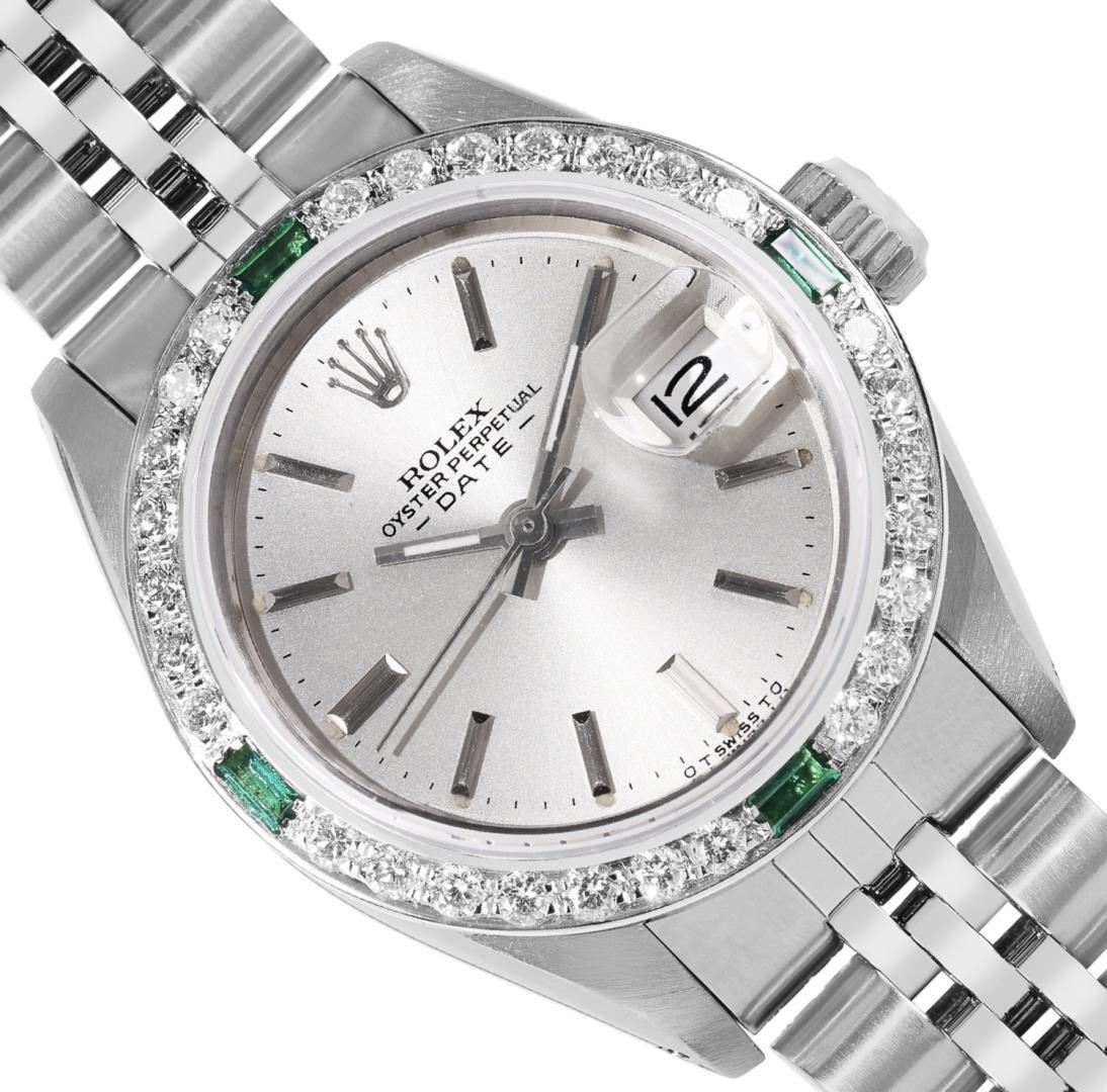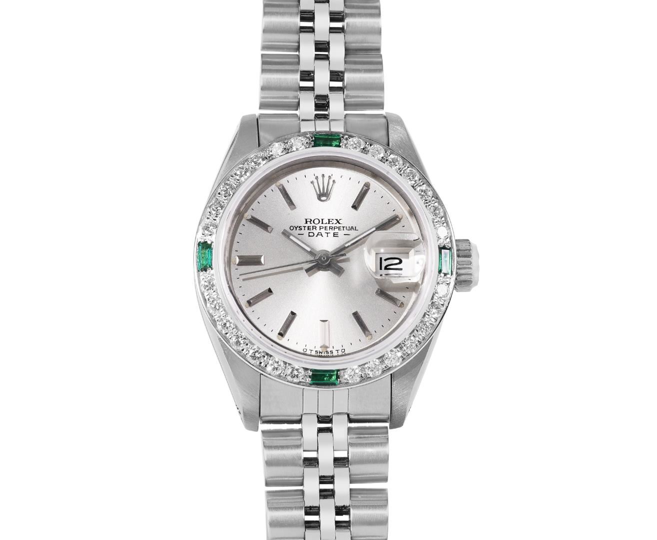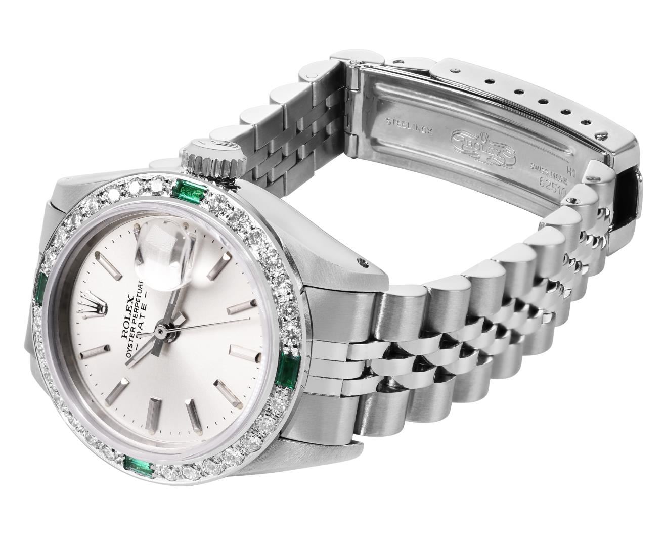 One Rolex Ladies Pre Owned Stainless Steel Date Wristwatch Polished Bright with Satin Finish, Serviced & Electronically Tested, Stainless Steel Case: 26mm, Stainless Steel Crown, Custom Bezel: New 18K White Gold Emerald Beadset Diamond Bezel, Diamond + Gem Count: 36 Diamonds + 4 Emeralds. Custom Crystal: New Sapphire With Magnified Date Window. Custom Hands: New Luminescent Hands. Rolex Movement: Automatic Winding Movement 2035. Rolex Dial: Factory Silver With Index Hour Markers, Lumi Dots, and Dash Tracks. Date Window: 3 O'Clock Position Date Display, Model: Date. Condition: G-6 Extra Fine. Rolex Bracelet: Stainless Steel Jubilee Band. Bright Polish & Satin Finish. 6.0 Inch Length, Adjustable. Standard Clasp, With Rolex Logo. This Watch Has Been Serviced Time Tested And Is In Excellent Condition. It Is Free Of All Scratches And Dents.