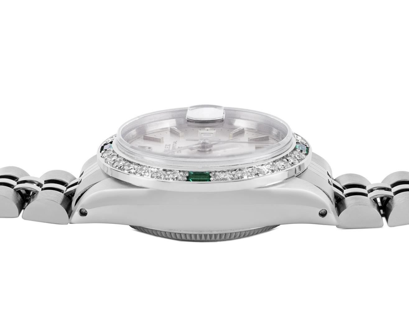 One Rolex Ladies Pre Owned Stainless Steel Date Wristwatch Polished Bright with Satin Finish, Serviced & Electronically Tested, Stainless Steel Case: 26mm, Stainless Steel Crown, Custom Bezel: New 18K White Gold Emerald Beadset Diamond Bezel, Diamond + Gem Count: 36 Diamonds + 4 Emeralds, Clarity: SI-VS, Color: G to H. Custom Crystal: New Sapphire With Magnified Date Window. Custom Hands: New Luminescent Hands. Rolex Movement: Automatic Winding Movement 2035. Rolex Dial: Factory Silver With Index Hour Markers, Lumi Dots, and Dash Tracks. Date Window: 3 O'Clock Position Date Display, Model: Date. Condition: G-6 Extra Fine. Rolex Bracelet: Stainless Steel Jubilee Band. Bright Polish & Satin Finish. 6.0 Inch Length, Adjustable. Standard Clasp, With Rolex Logo. This Watch Has Been Serviced Time Tested And Is In Excellent Condition. It Is Free Of All Scratches And Dents. This Watch Comes With A Rolex Box.