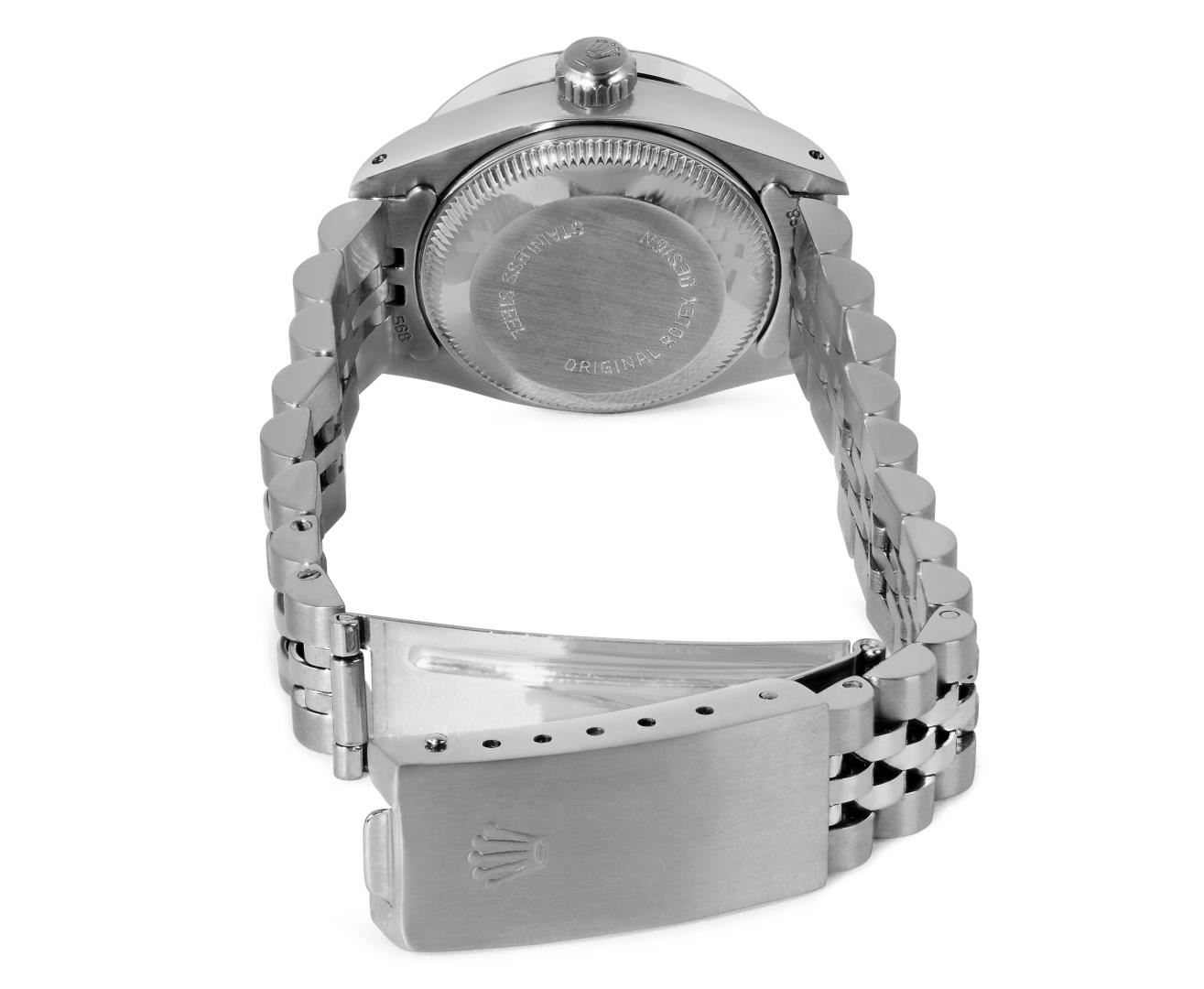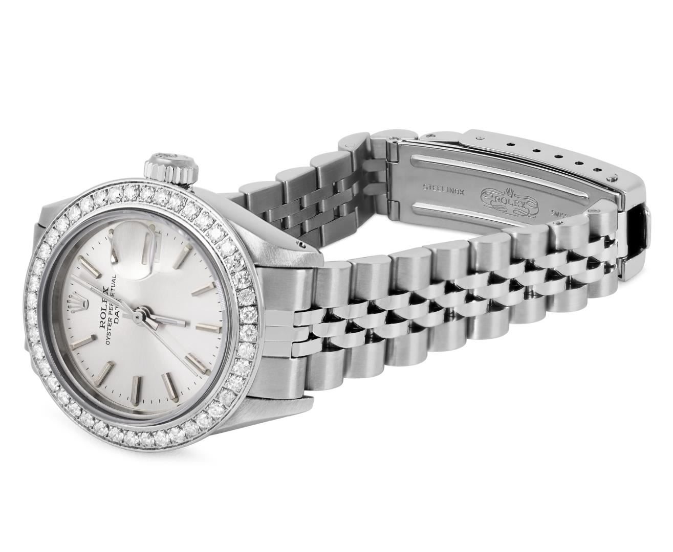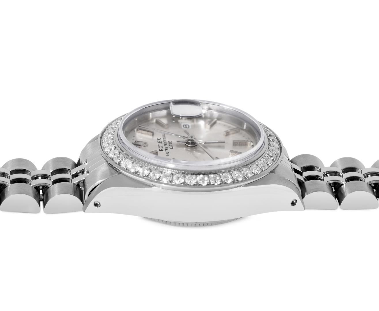 One Rolex Ladies Pre Owned Stainless Steel Date Wristwatch Polished Bright with Satin Finish, Serviced & Electronically Tested, Stainless Steel Case: 26mm, Stainless Steel Crown, Custom Bezel: New Stainless Steel Beadset Diamond Bezel, Diamond Count: 40 Diamonds. Custom Crystal: New Sapphire With Magnified Date Window. Custom Hands: New Luminescent Hands. Rolex Movement: Automatic Winding Movement 2035. Rolex Dial: Factory Silver With Index Hour Markers And Lumi Dots. Date Window: 3 O'Clock Position Date Display, Model: Date. Condition: G-6 Extra Fine. Rolex Bracelet: Stainless Steel Jubilee Band. Bright Polish And Satin Finish. 6.0 Inch Length, Adjustable. Standard Clasp, With Rolex Logo. This Watch Has Been Serviced And Time Tested. It Is In Excellent Condition, Free Of All Scratches And Dents. This Watch Comes With A Rolex Box.