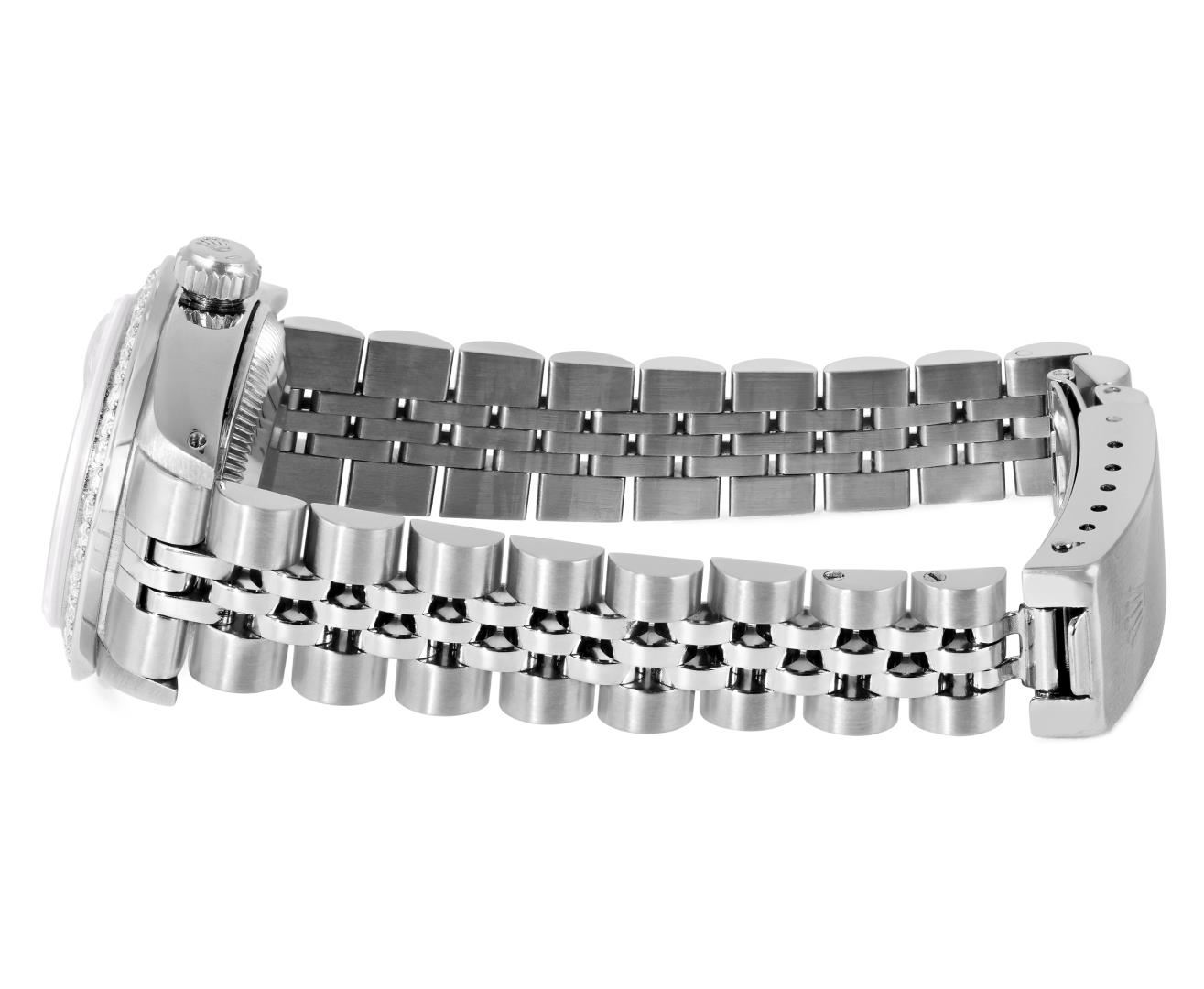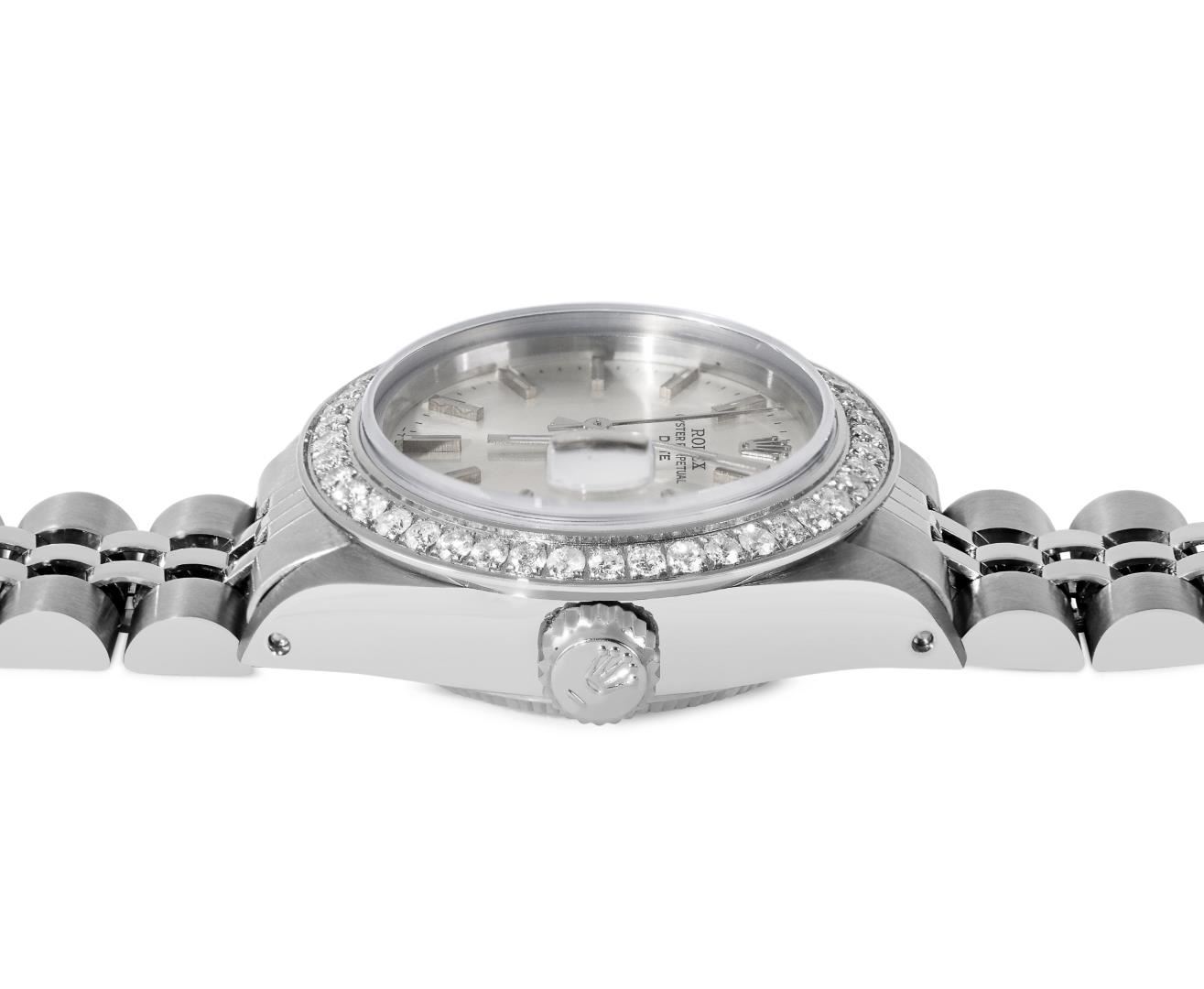 One Rolex Ladies Pre Owned Stainless Steel Date Wristwatch Polished Bright with Satin Finish, Serviced & Electronically Tested, Stainless Steel Case: 26mm, Stainless Steel Crown, Custom Bezel: New Stainless Steel Beadset Diamond Bezel, Diamond Count: 40 Diamonds. Custom Crystal: New Sapphire With Magnified Date Window. Custom Hands: New Luminescent Hands. Rolex Movement: Automatic Winding Movement 2035. Rolex Dial: Factory Silver With Index Hour Markers And Lumi Dots. Date Window: 3 O'Clock Position Date Display, Model: Date. Condition: G-6 Extra Fine. Rolex Bracelet: Stainless Steel Jubilee Band. Bright Polish And Satin Finish. 6.0 Inch Length, Adjustable. Standard Clasp, With Rolex Logo. This Watch Has Been Serviced And Time Tested. It Is In Excellent Condition, Free Of All Scratches And Dents. This Watch Comes With A Rolex Box.