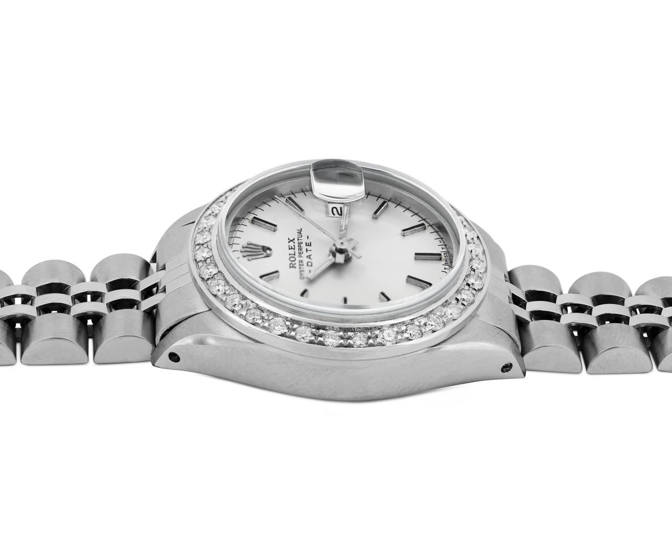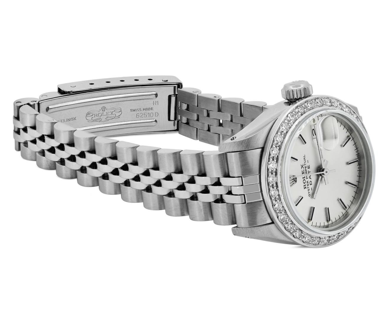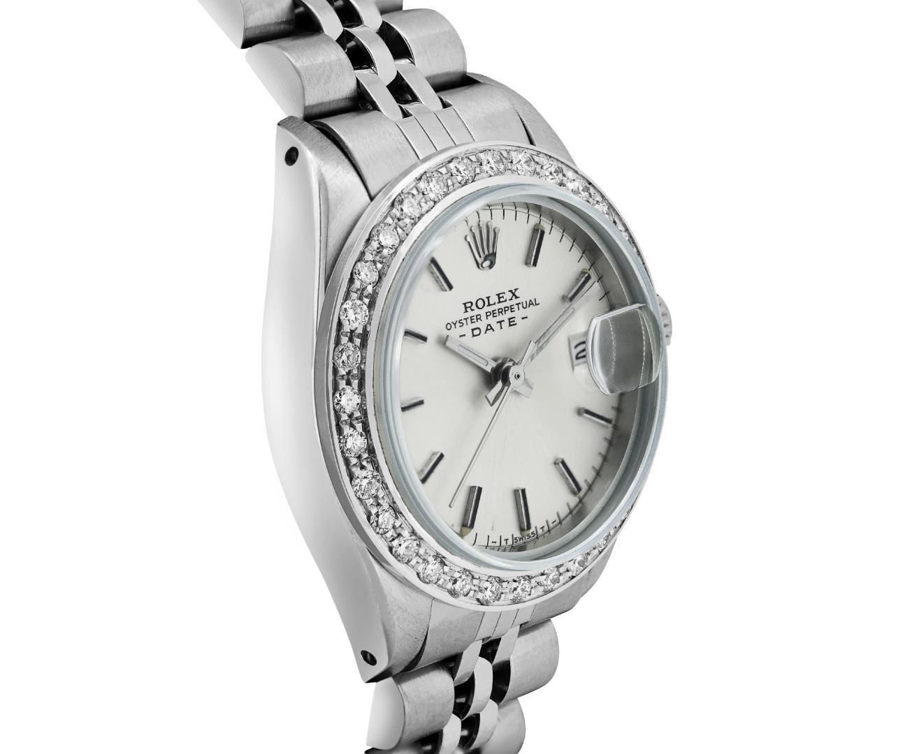 One Rolex Ladies Pre Owned Stainless Steel Date Wristwatch Polished Bright with Satin Finish, Serviced & Electronically Tested, Stainless Steel Case: 26mm, Stainless Steel Crown, Custom Bezel: New 18K White Gold Beadset Diamond Bezel, Diamond Count: 32 Diamonds. Custom Crystal: New Sapphire With Magnified Date Window. Custom Hands: New Luminescent Hands. Rolex Movement: Automatic Winding Movement. Rolex Dial: Factory Silver With Index Hour Markers And Lumi Dots. Date Window: 3 O'Clock Position Date Display, Model: Date. Condition: G-6 Extra Fine. Rolex Bracelet: Stainless Steel Jubilee Band. Bright Polish And Satin Finish. 6.0 Inch Length, Adjustable. Standard Clasp, With Rolex Logo. This Watch Has Been Serviced And Time Tested. It Is In Excellent Condition, Free Of All Scratches And Dents.