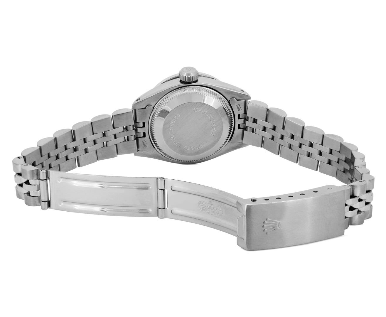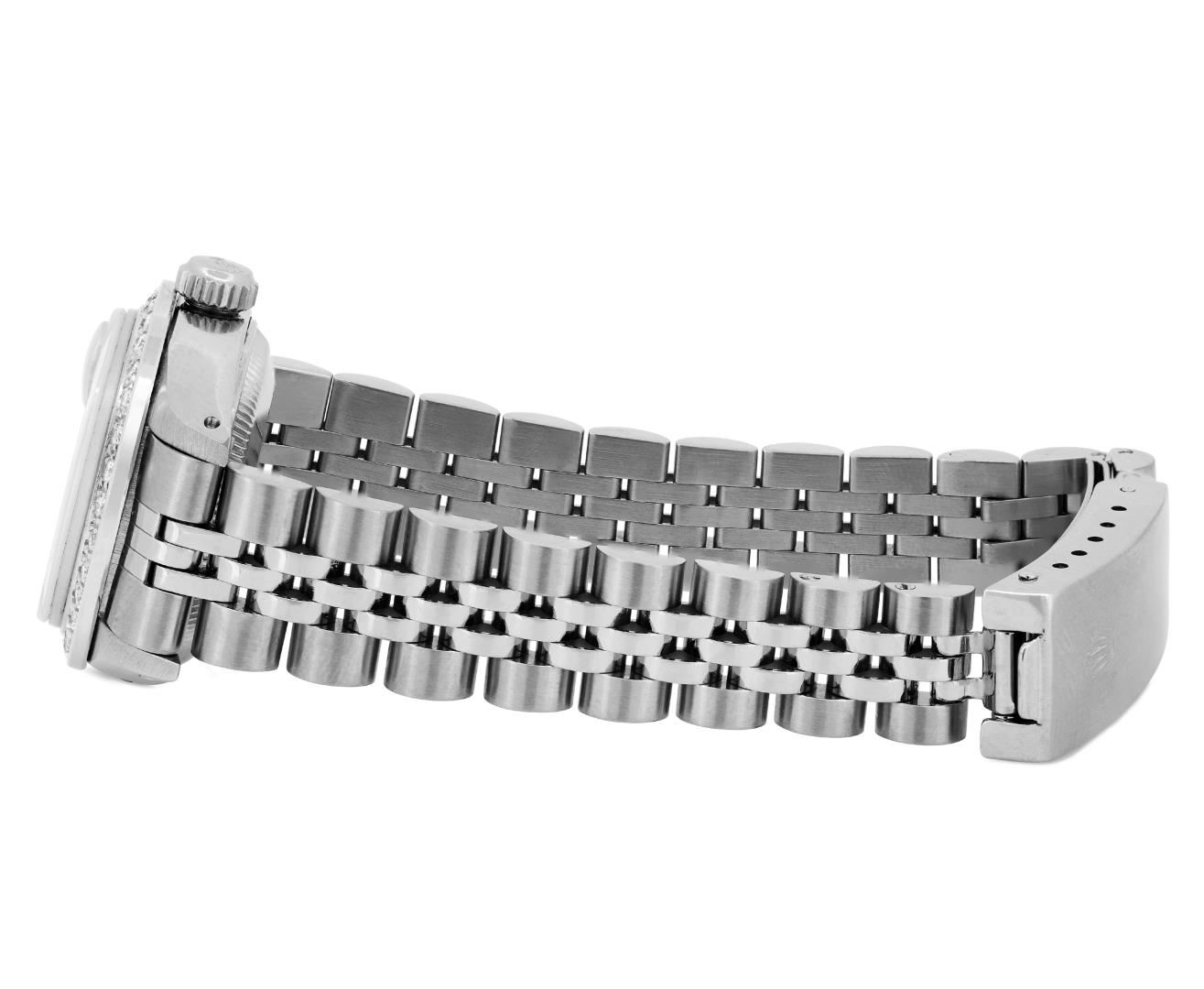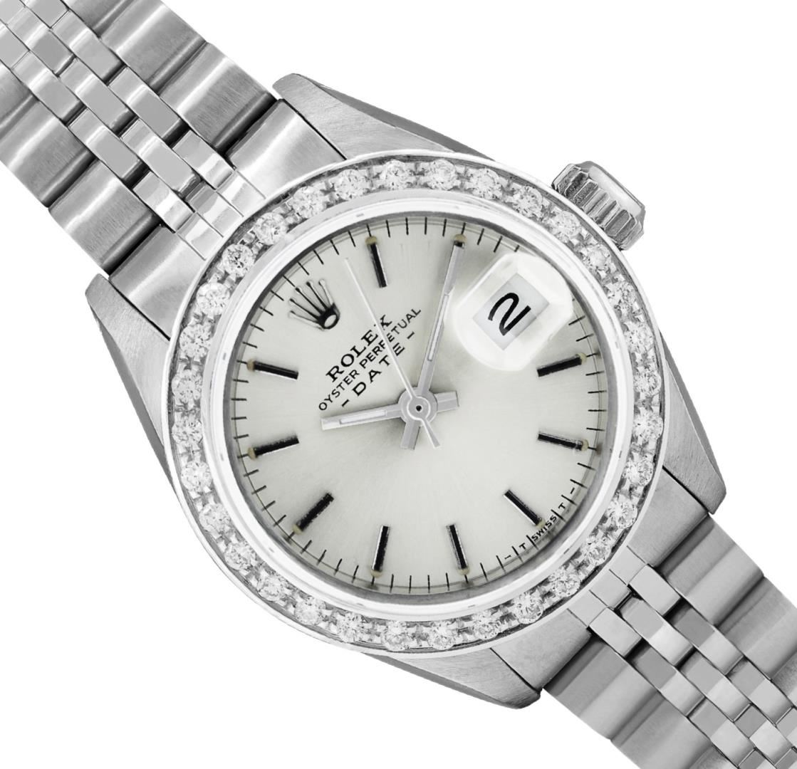 One Rolex Ladies Pre Owned Stainless Steel Date Wristwatch Polished Bright with Satin Finish, Serviced & Electronically Tested, Stainless Steel Case: 26mm, Stainless Steel Crown, Custom Bezel: New 18K White Gold Beadset Diamond Bezel, Diamond Count: 32 Diamonds. Custom Crystal: New Sapphire With Magnified Date Window. Custom Hands: New Luminescent Hands. Rolex Movement: Automatic Winding Movement. Rolex Dial: Factory Silver With Index Hour Markers And Lumi Dots. Date Window: 3 O'Clock Position Date Display, Model: Date. Condition: G-6 Extra Fine. Rolex Bracelet: Stainless Steel Jubilee Band. Bright Polish And Satin Finish. 6.0 Inch Length, Adjustable. Standard Clasp, With Rolex Logo. This Watch Has Been Serviced And Time Tested. It Is In Excellent Condition, Free Of All Scratches And Dents.
