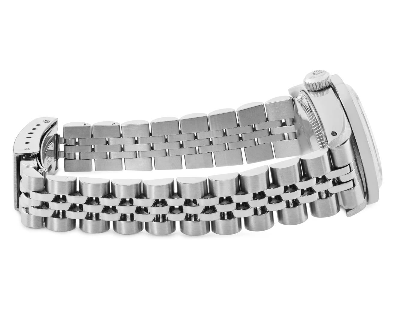 One Rolex Ladies Pre Owned Stainless Steel Date Wristwatch Polished Bright with Satin Finish, Serviced & Electronically Tested, Stainless Steel Case: 26mm, Stainless Steel Crown, Custom Bezel: New Stainless Steel Diamond Bezel, Diamond Count: 44 Diamonds. Custom Crystal: New Sapphire With Magnified Date Window. Custom Hands: New Luminescent Hands. Rolex Movement: Automatic Winding Movement 2035. Rolex Dial: Factory Silver Dial With Index Hour Markers And Lumi Dots. Date Window: 3 O'Clock Position Date Display, Model: Date. Condition: G-6 Extra Fine. Rolex Bracelet: Stainless Steel Jubilee Band. Bright Polish And Satin Finish. 6.0 Inch Length, Adjustable. Standard Clasp, With Rolex Logo. This Watch Has Been Serviced And Time Tested. It Is In Excellent Condition, Free Of All Scratches And Dents. This Watch Comes With A Rolex Box.