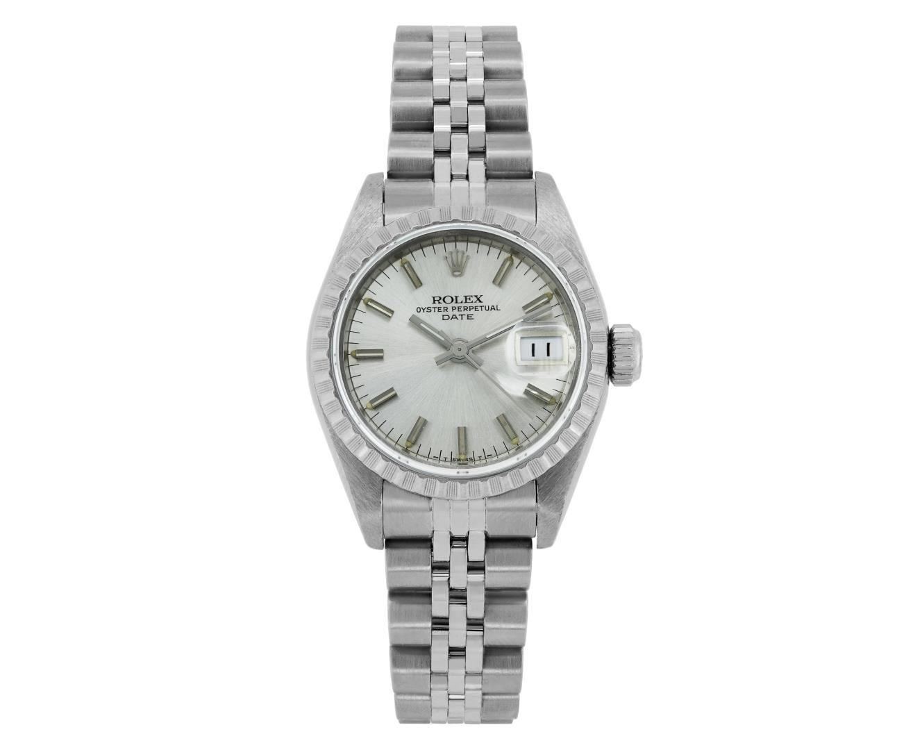 One Rolex Ladies Pre Owned Stainless Steel Date Wristwatch Polished Bright with Satin Finish, Serviced & Electronically Tested, Stainless Steel Case: 26mm, Stainless Steel Crown, Stainless Steel Engine Turn Bezel, Custom Crystal: New Acrylic With Magnifying Date Window. Custom Hands: New Luminescent Hands. Rolex Movement: Automatic Winding Movement 2035. Rolex Dial: Factory Silver With Index Hour Markers And Lumi Dots. Date Window: 3 O'Clock Position Date Display, Model: Datejust. Condition: G-6 Extra Fine. Rolex Bracelet: Stainless Steel Jubilee Band. Bright Polish & Satin Finish. 6.0 Inch Length, Adjustable. Standard Clasp, With Rolex Logo. This Watch Has Been Serviced Time Tested And Is In Excellent Condition. It Is Free Of All Scratches And Dents.