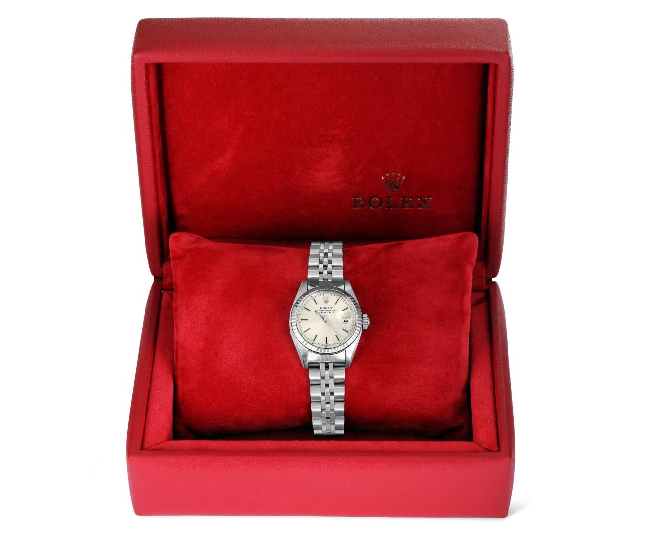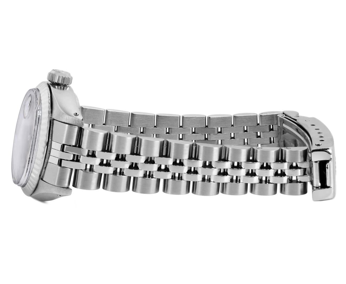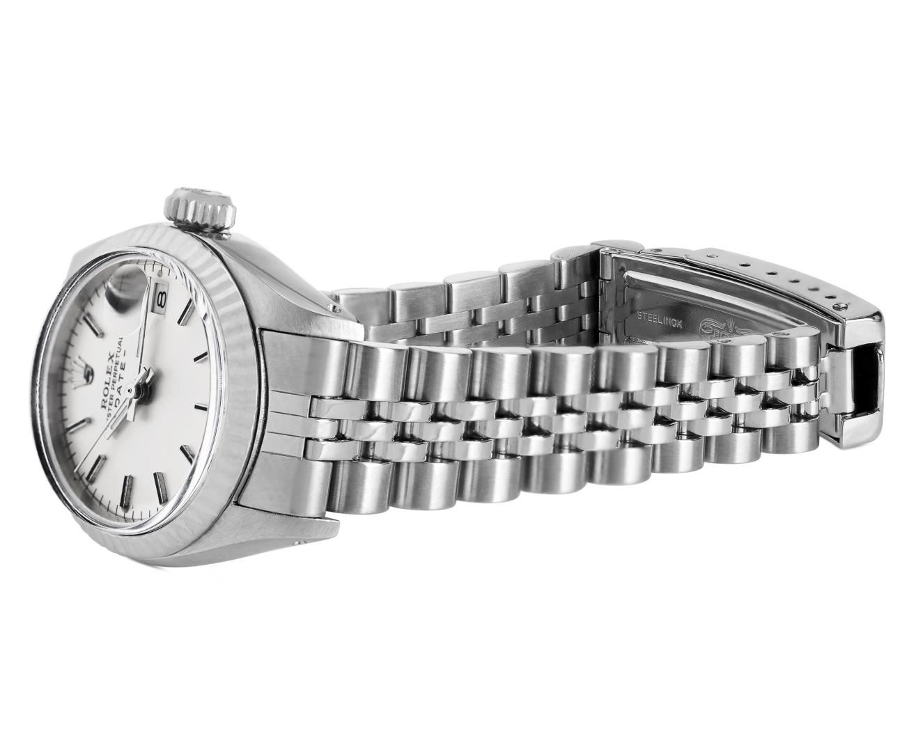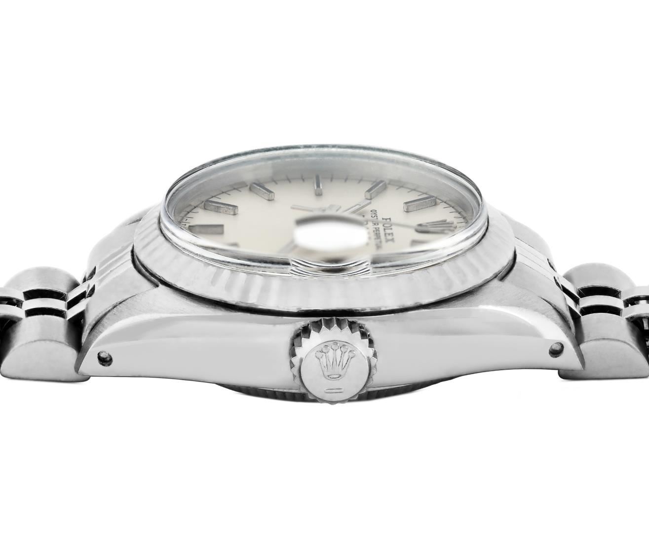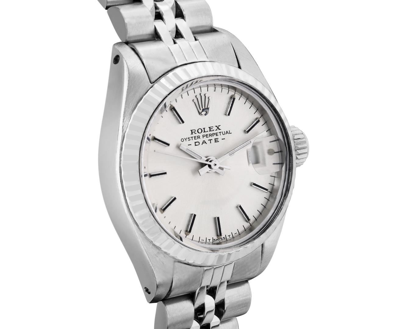 One Rolex Ladies Pre Owned Stainless Steel Date Wristwatch Polished Bright with Satin Finish, Serviced & Electronically Tested, Stainless Steel Case: 26mm, Stainless Steel Crown, 14K White Gold Fluted Bezel, Custom Crystal: New Acrylic With Magnifying Date Window. Custom Hands: New Luminescent Hands. Rolex Movement: Automatic Winding Movement 2035. Rolex Dial: Factory Silver With Index Hour Markers And Lumi Dots. Date Window: 3 O'Clock Position Date Display, Model: Date. Condition: G-6 Extra Fine. Rolex Bracelet: Stainless Steel Jubilee Band. Bright Polish And Satin Finish. 6.0 Inch Length, Adjustable. Standard Clasp, With Rolex Logo. This Watch Has Been Serviced Time Tested And Is In Excellent Condition. It Is Free Of All Scratches And Dents. This Watch Comes With A Rolex Box.