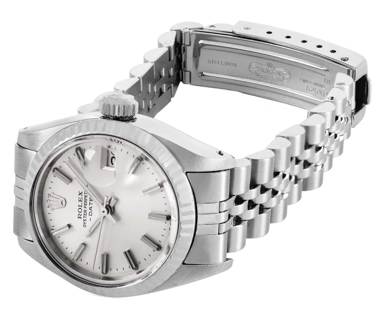 One Rolex Ladies Pre Owned Stainless Steel Date Wristwatch Polished Bright with Satin Finish, Serviced & Electronically Tested, Stainless Steel Case: 26mm, Stainless Steel Crown, 14K White Gold Fluted Bezel, Custom Crystal: New Acrylic With Magnifying Date Window. Custom Hands: New Luminescent Hands. Rolex Movement: Automatic Winding Movement 2035. Rolex Dial: Factory Silver With Index Hour Markers, Dash Tracks, And Lumi Dots. Date Window: 3 O'Clock Position Date Display, Model: Date. Condition: G-6 Extra Fine. Rolex Bracelet: Stainless Steel Jubilee Band. Bright Polish & Satin Finish. 6.0 Inch Length, Adjustable. Standard Clasp, With Rolex Logo. This Watch Has Been Serviced Time Tested And Is In Excellent Condition. It Is Free Of All Scratches And Dents.