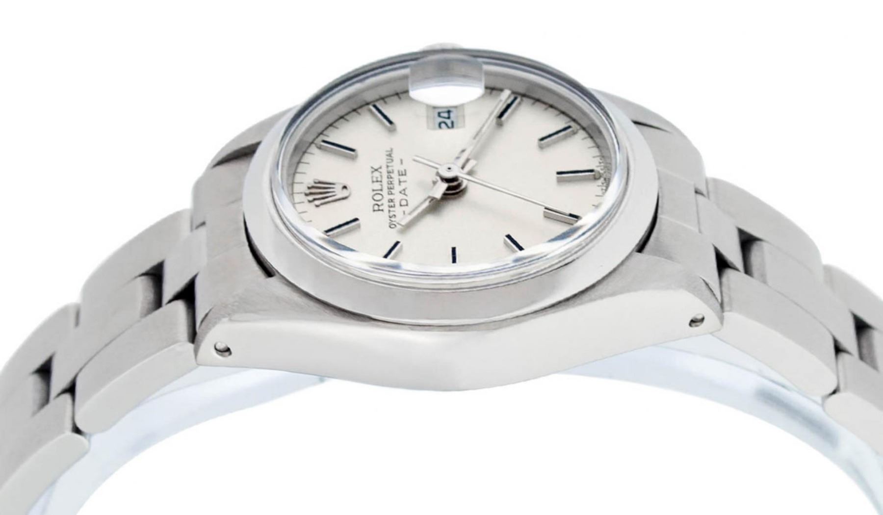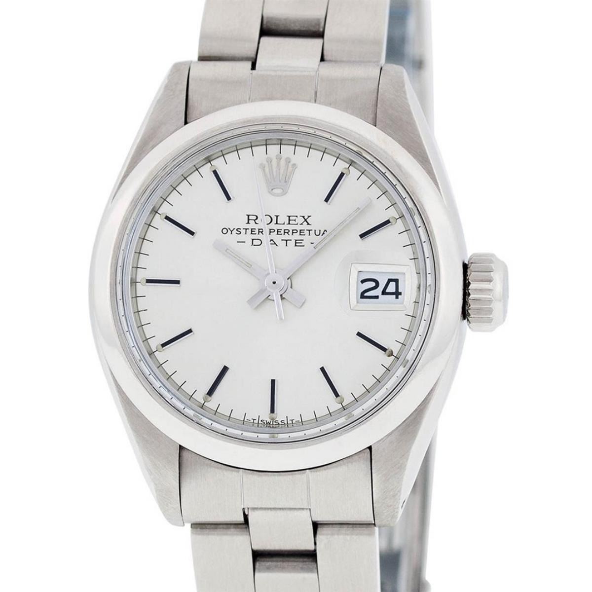One Ladies Stainless Steel Rolex Datejust Polished Bright with Satin Finish, Serviced & Electronically Tested, Stainless Steel Case: 26mm, Stainless Steel Crown, Bezel: Stainless Steel Smooth Bezel. Custom Crystal: New Acrylic Cyclops Lens. Custom Hands: New Luminescent Hands. Movement: Automatic Winding Movement Caliber 2030. Dial: Silver Index Dial. Date Window: 3 O'Clock Position Date Display, Model: Datejust. Condition: G-6 Extra Fine. Bracelet: Stainless Steel Oyster Band. Bright Polish & Satin Finish. 6.0 Inch Length, Adjustable. Standard Clasp, With Rolex Logo. This Watch Has Been Serviced Time Tested And Is In Excellent Condition It Is Free Of All Scratches And Dents.