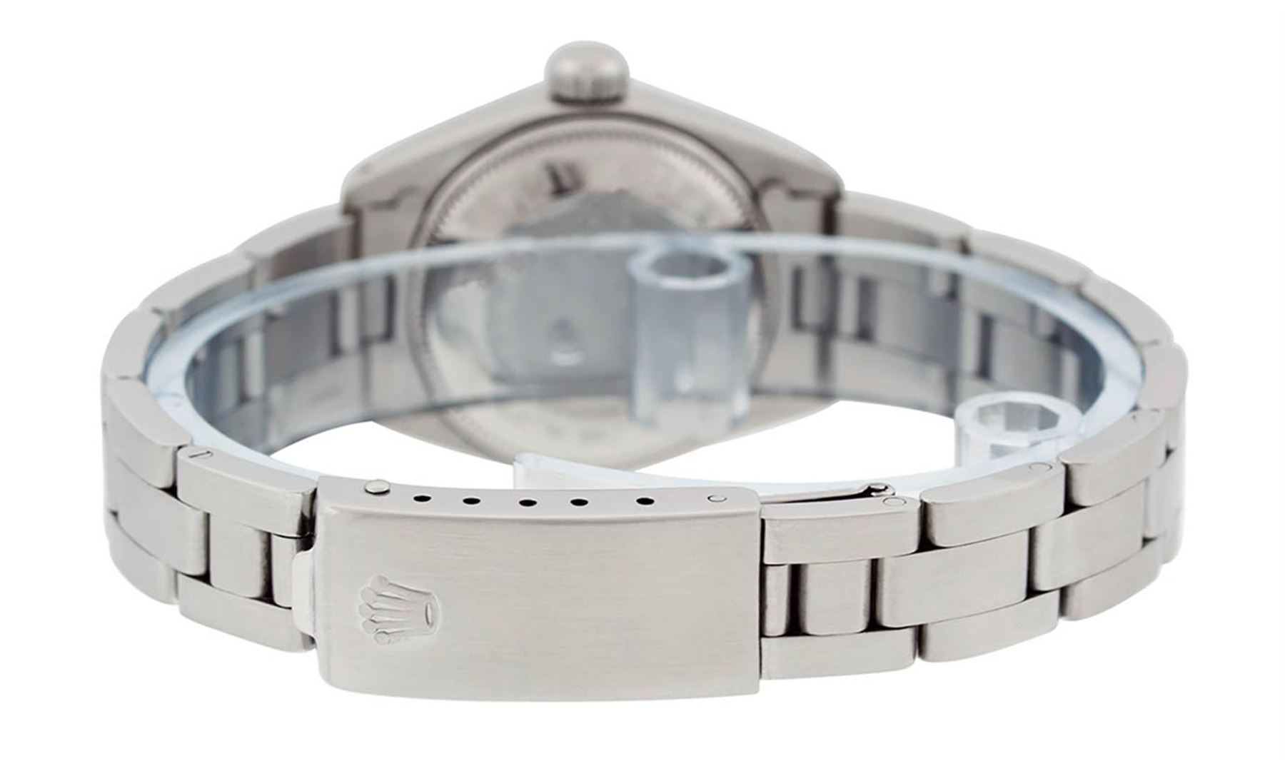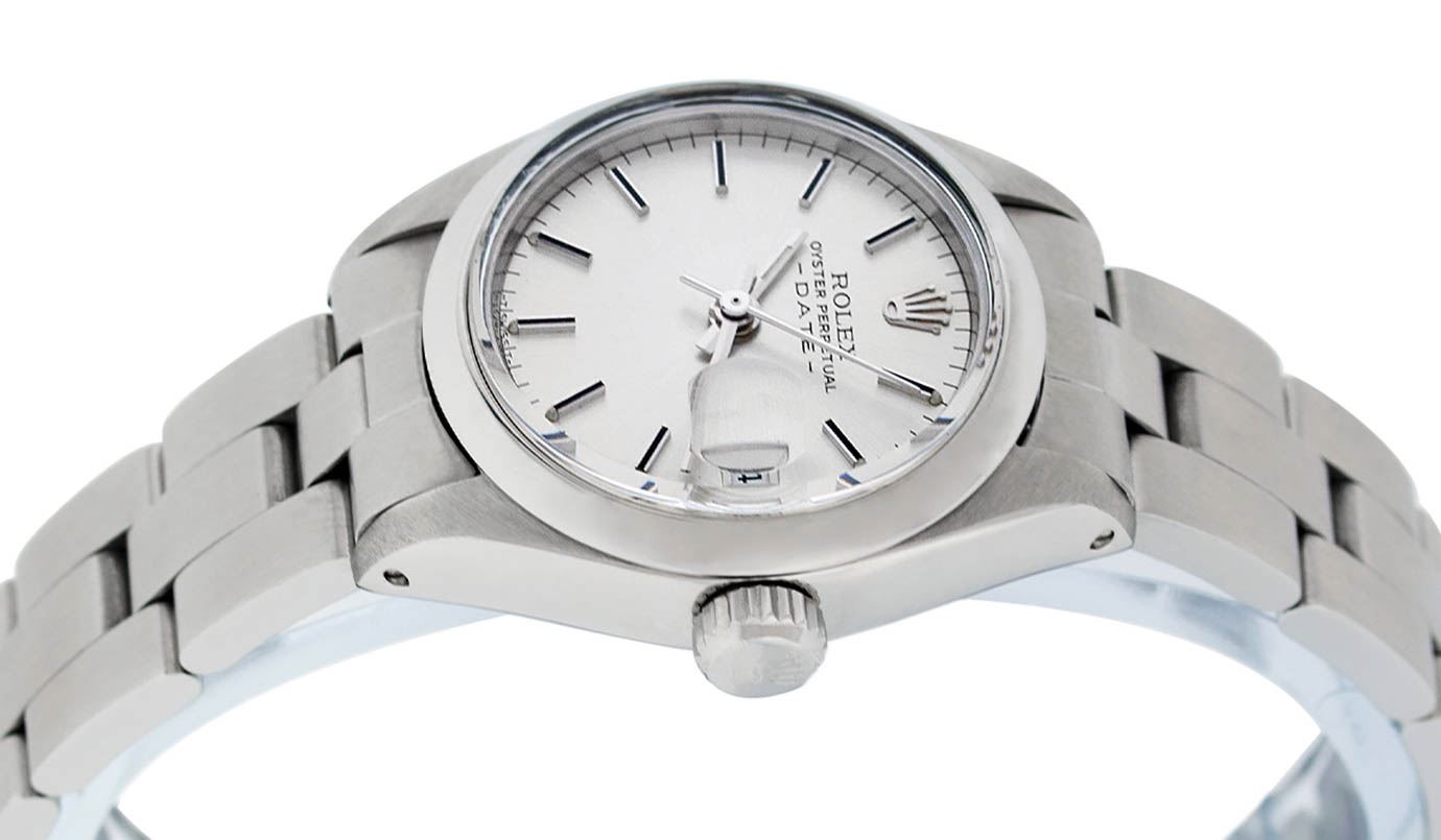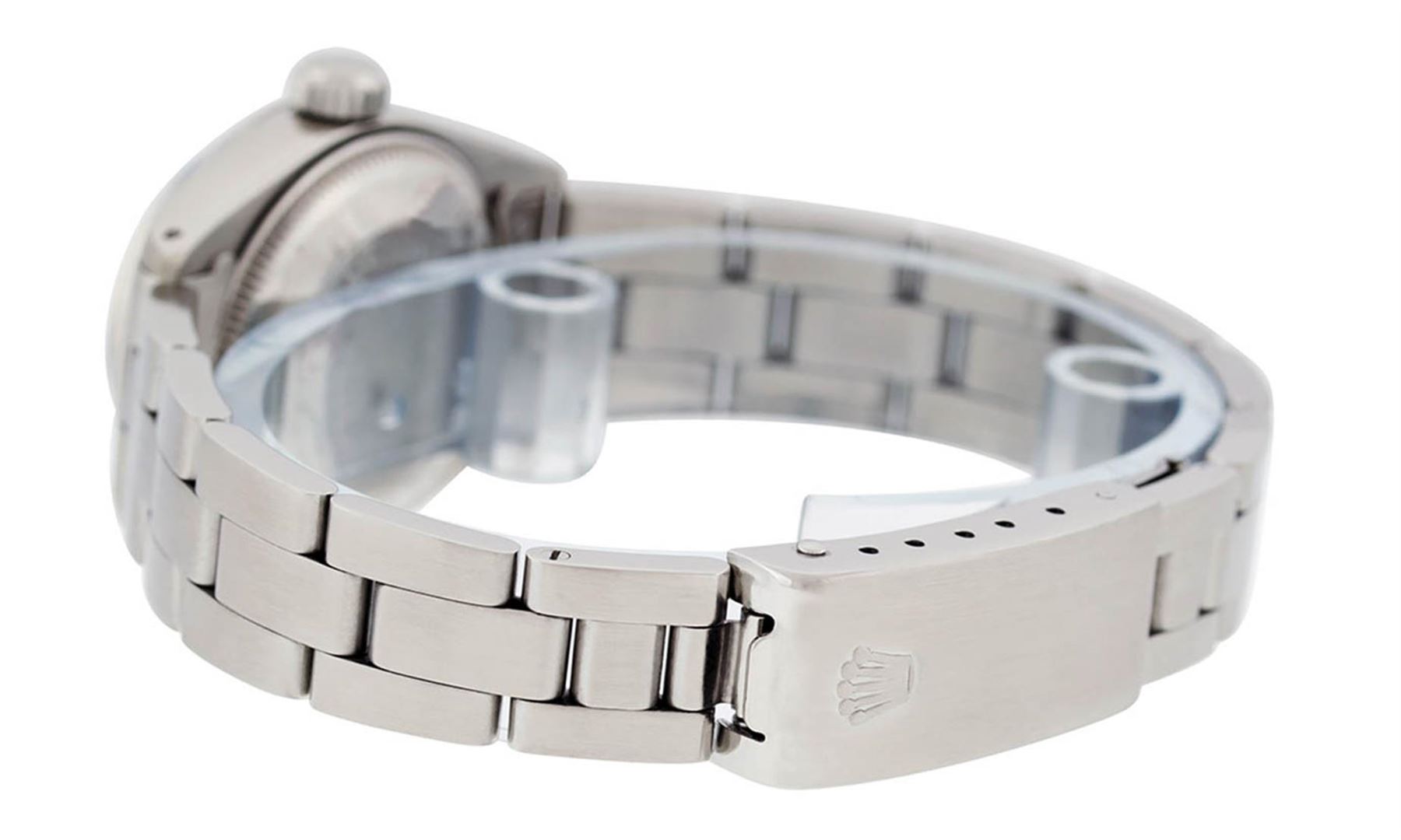 One Ladies Stainless Steel Rolex Datejust Polished Bright with Satin Finish, Serviced & Electronically Tested, Stainless Steel Case: 26mm, Stainless Steel Crown, Bezel: Stainless Steel Smooth Bezel. Custom Crystal: New Acrylic Cyclops Lens. Custom Hands: New Luminescent Hands. Movement: Automatic Winding Movement. Dial: Silver Index Dial. Date Window: 3 O'Clock Position Date Display, Model: Datejust. Condition: G-6 Extra Fine. Bracelet: Stainless Steel Oyster Band. Bright Polish & Satin Finish. 6.0 Inch Length, Adjustable. Standard Clasp, With Rolex Logo. This Watch Has Been Serviced Time Tested And Is In Excellent Condition It Is Free Of All Scratches And Dents.