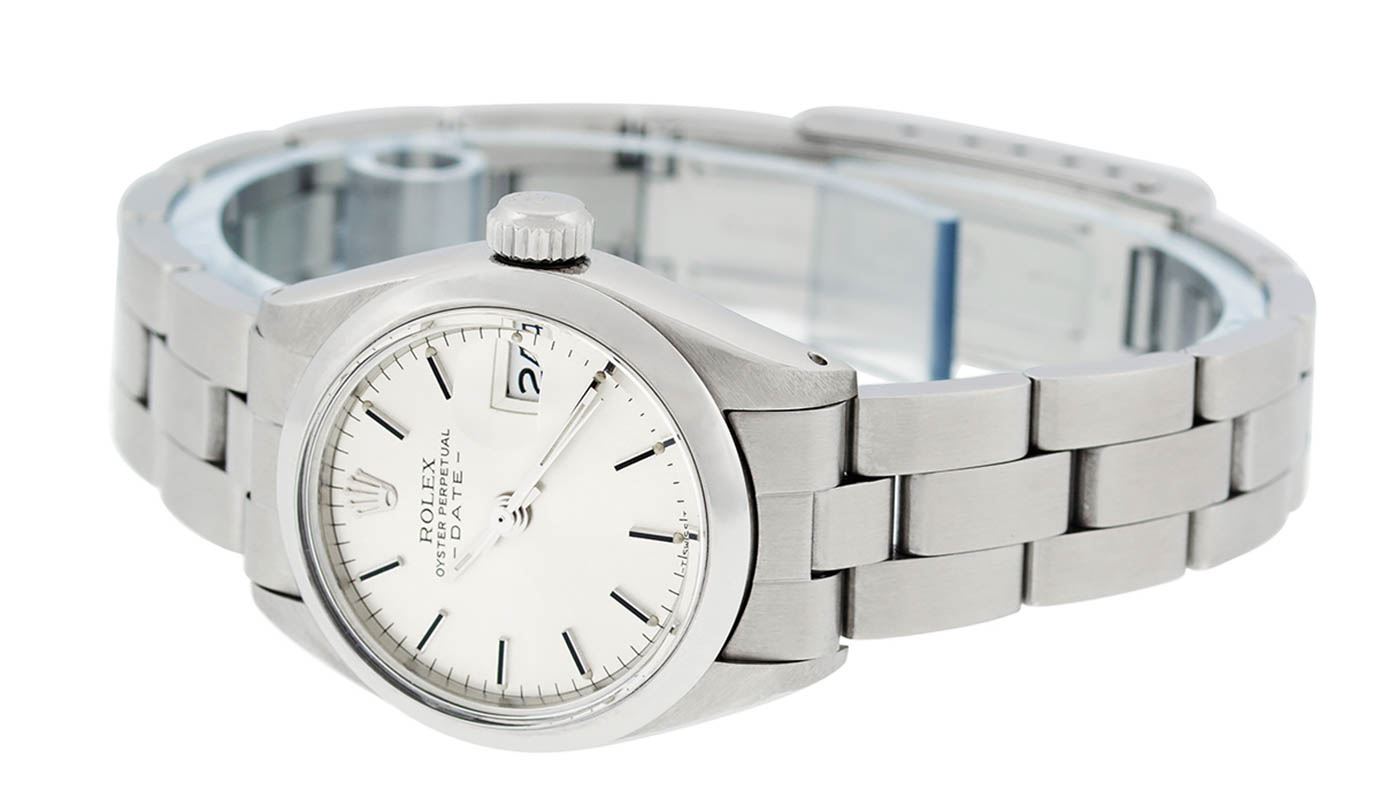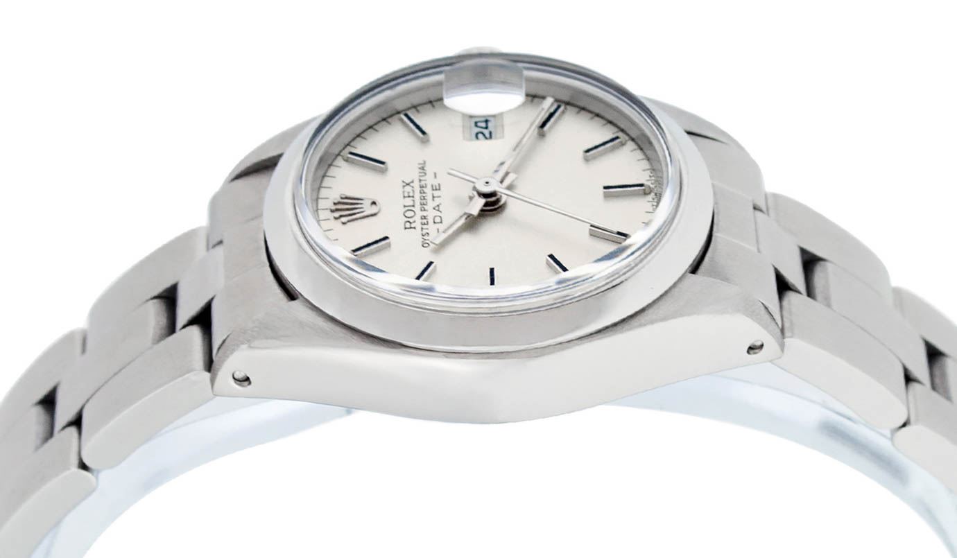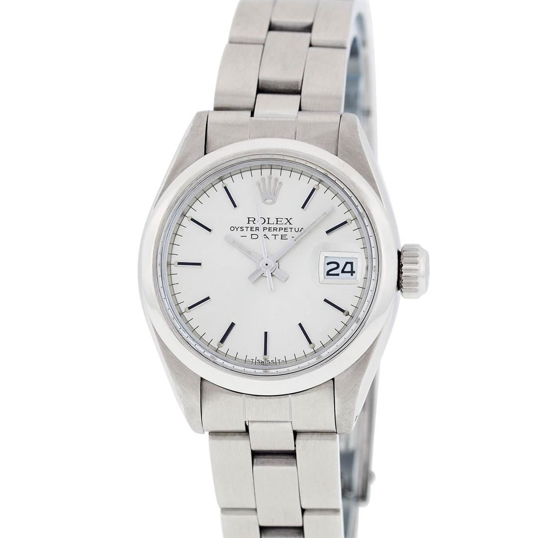 One Ladies Stainless Steel Rolex Datejust Polished Bright with Satin Finish, Serviced & Electronically Tested, Stainless Steel Case: 26mm, Stainless Steel Crown, Bezel: Stainless Steel Smooth Bezel. Custom Crystal: New Acrylic Cyclops Lens. Custom Hands: New Luminescent Hands. Movement: Automatic Winding Movement. Dial: Silver Index Dial. Date Window: 3 O'Clock Position Date Display, Model: Datejust. Condition: G-6 Extra Fine. Bracelet: Stainless Steel Oyster Band. Bright Polish & Satin Finish. 6.0 Inch Length, Adjustable. Standard Clasp, With Rolex Logo. This Watch Has Been Serviced Time Tested And Is In Excellent Condition It Is Free Of All Scratches And Dents.