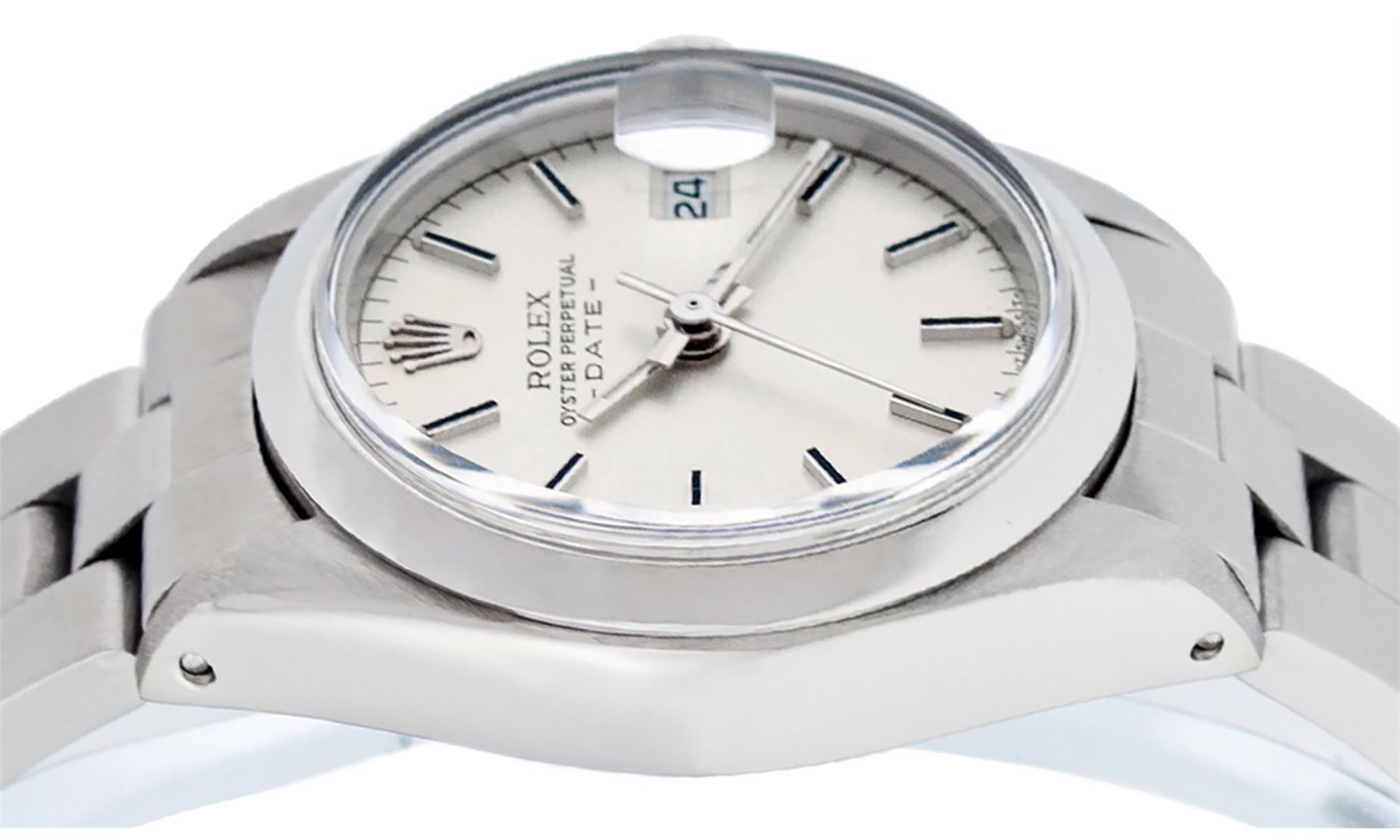 One Ladies Stainless Steel Rolex Datejust Polished Bright with Satin Finish, Serviced & Electronically Tested, Stainless Steel Case: 26mm, Stainless Steel Crown, Bezel: Stainless Steel Smooth Bezel. Custom Crystal: New Acrylic Cyclops Lens. Custom Hands: New Luminescent Hands. Movement: Automatic Winding Movement.. Dial: Silver Index Dial. Date Window: 3 O'Clock Position Date Display, Model: Datejust. Condition: G-6 Extra Fine. Bracelet: Stainless Steel Oyster Band. Bright Polish & Satin Finish. 6.0 Inch Length, Adjustable. Standard Clasp, With Rolex Logo. This Watch Has Been Serviced Time Tested And Is In Excellent Condition It Is Free Of All Scratches And Dents.
