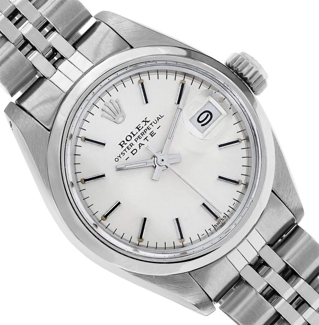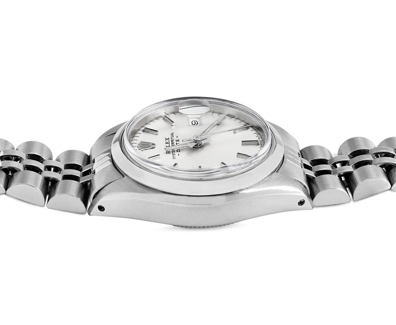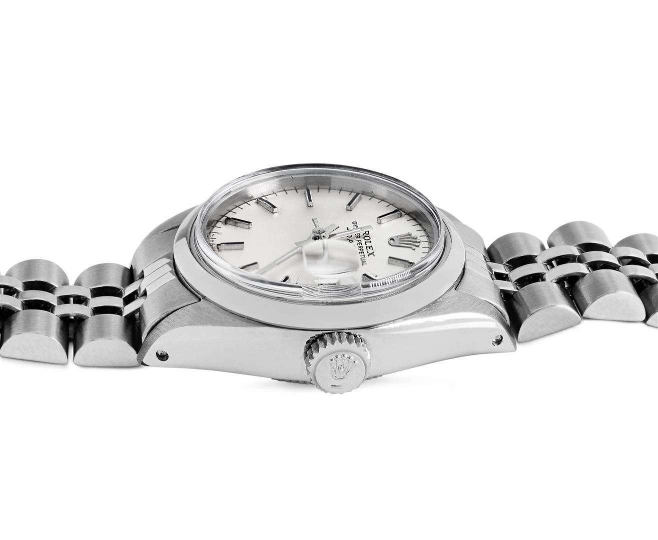 One Rolex Ladies Pre Owned Stainless Steel Date Wristwatch Polished Bright with Satin Finish, Serviced & Electronically Tested, Stainless Steel Case: 26mm, Stainless Steel Crown, Stainless Steel Smooth Bezel, Custom Crystal: New Acrylic With Magnifying Da