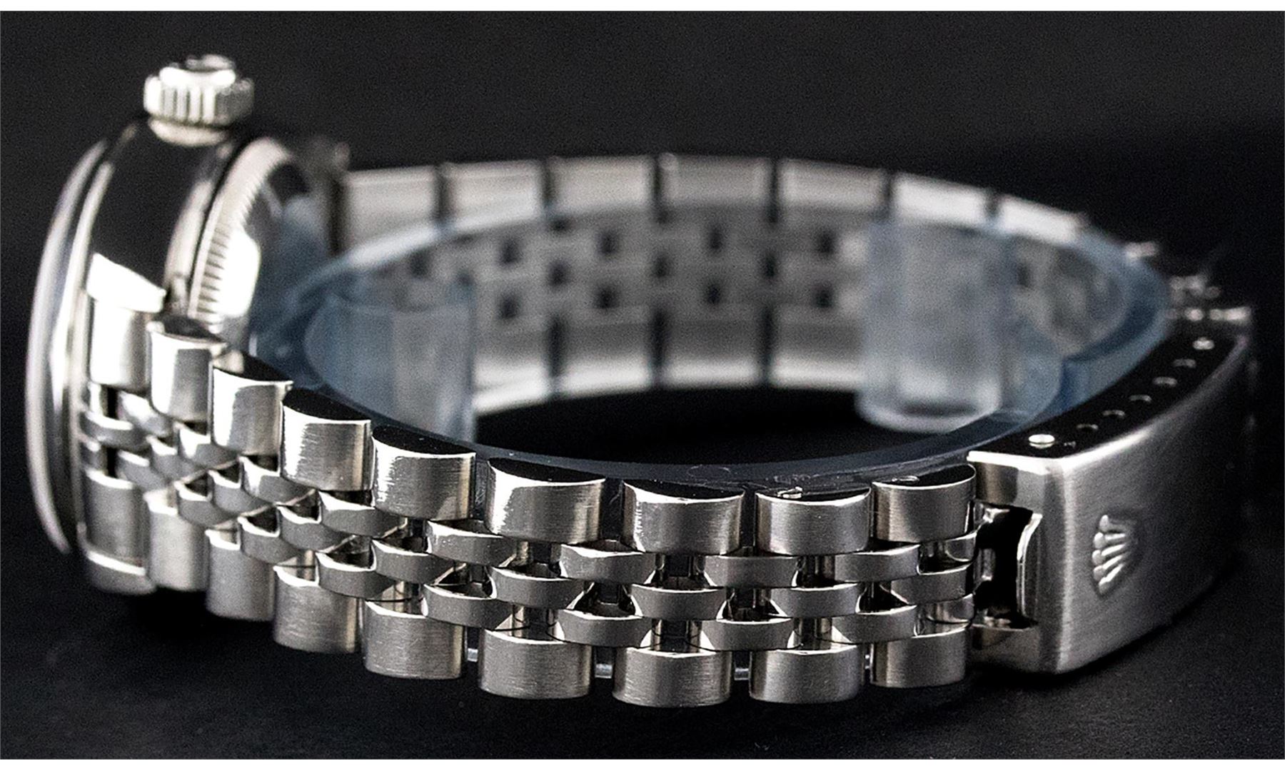 One Ladies Pre Owned Quickset Stainless Steel Rolex Date Polished Bright with Satin Finish, Serviced & Electronically Tested, Rolex Stainless Steel Case: 26mm, Rolex Stainless Steel Crown, Rolex Bezel: Stainless Steel Smooth Bezel. Crystal: Sapphire With Magnified Date Window. Hands: Luminescent Hands. Rolex Movement: Automatic Winding Movement 2230. Rolex Dial: Silver Index Dial With Luminescent Dots & Dash Track. Date Window: 3 O'Clock Position Date Display, Model: Quickset Datejust. Condition: G-6 Extra Fine. Rolex Bracelet: Stainless Steel Jubilee Band. Bright Polish & Satin Finish. 6.0 Inch Length, Adjustable. Standard Clasp, With Rolex Logo. This Watch Has Been Serviced Time Tested And Is In Excellent Condition It Is Free Of All Scratches And Dents.