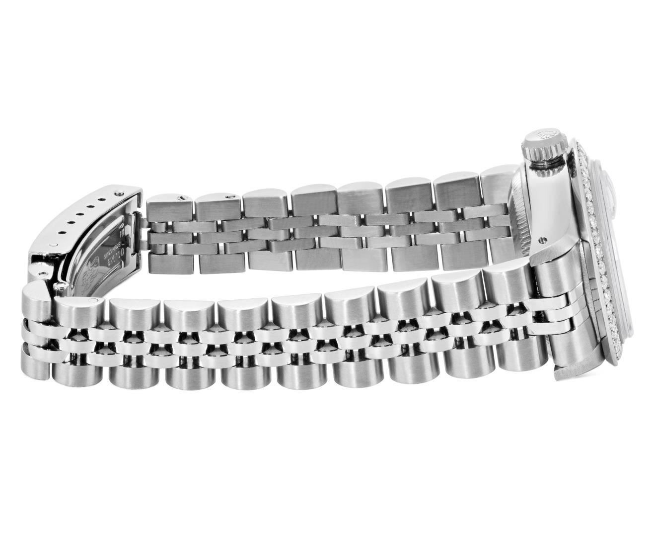 One Rolex Ladies Pre Owned Stainless Steel Date Wristwatch Polished Bright with Satin Finish, Serviced & Electronically Tested, Stainless Steel Case: 26mm, Stainless Steel Crown, Custom Bezel: New Stainless Steel Diamond Bezel, Diamond Count: 44 Diamonds, Total Weight .70 Carat, Clarity: SI-VS, Color: G to H. Custom Crystal: New Sapphire With Magnified Date Window. Custom Hands: New Luminescent Hands. Rolex Movement: Automatic Winding Movement 2030. Rolex Dial: Factory Silver Dial With Index Hour Markers And Lumi Dots. Date Window: 3 O'Clock Position Date Display, Model: Date. Condition: G-6 Extra Fine. Rolex Bracelet: Stainless Steel Jubilee Band. Bright Polish & Satin Finish. 6.0 Inch Length, Adjustable. Standard Clasp, With Rolex Logo. This Watch Has Been Serviced And Time Tested. It Is In Excellent Condition, Free Of All Scratches And Dents. This Watch Comes With A Rolex Box.