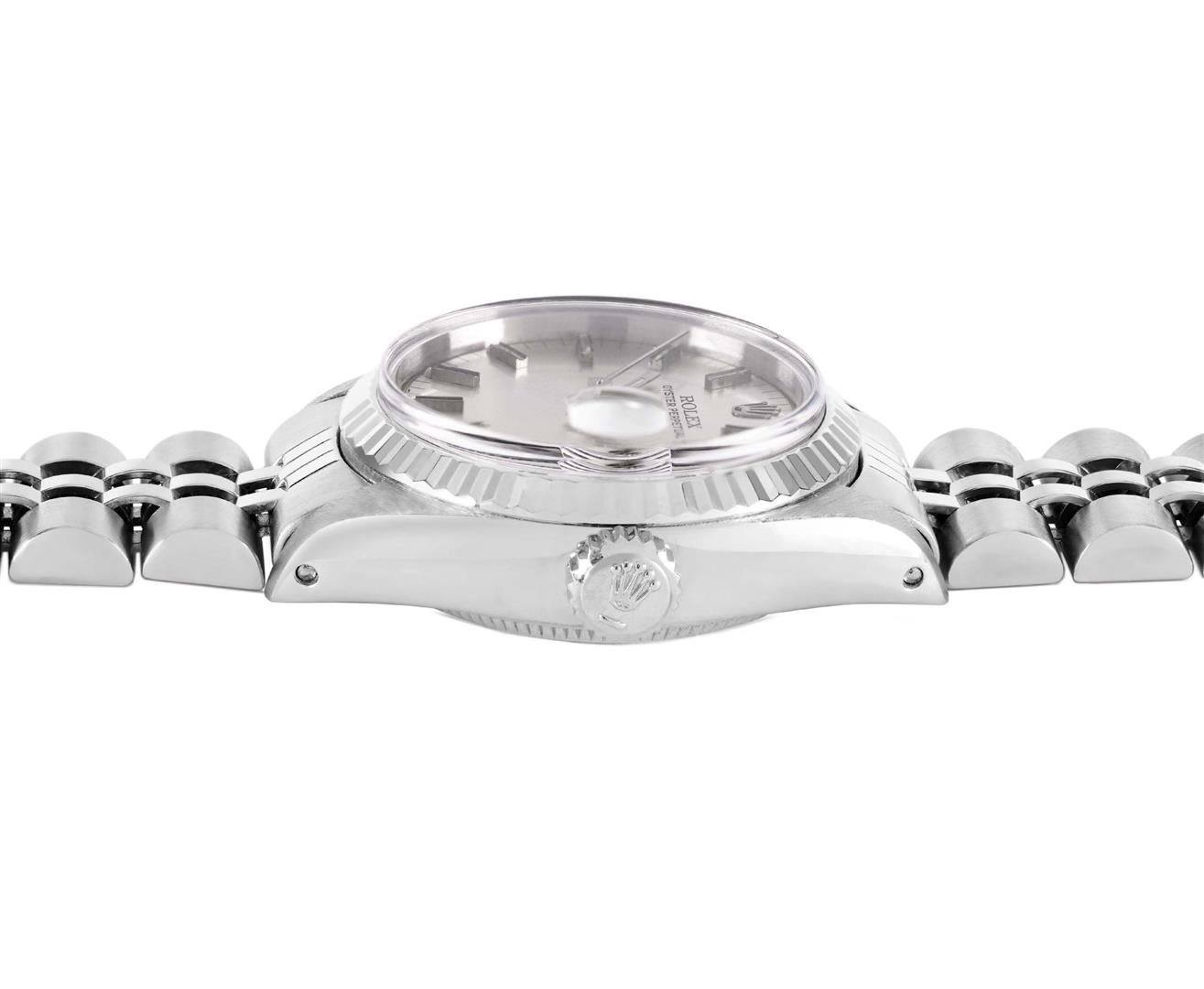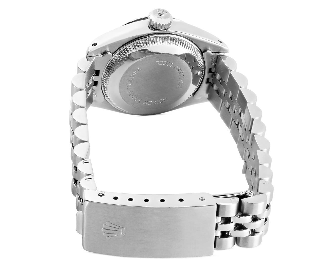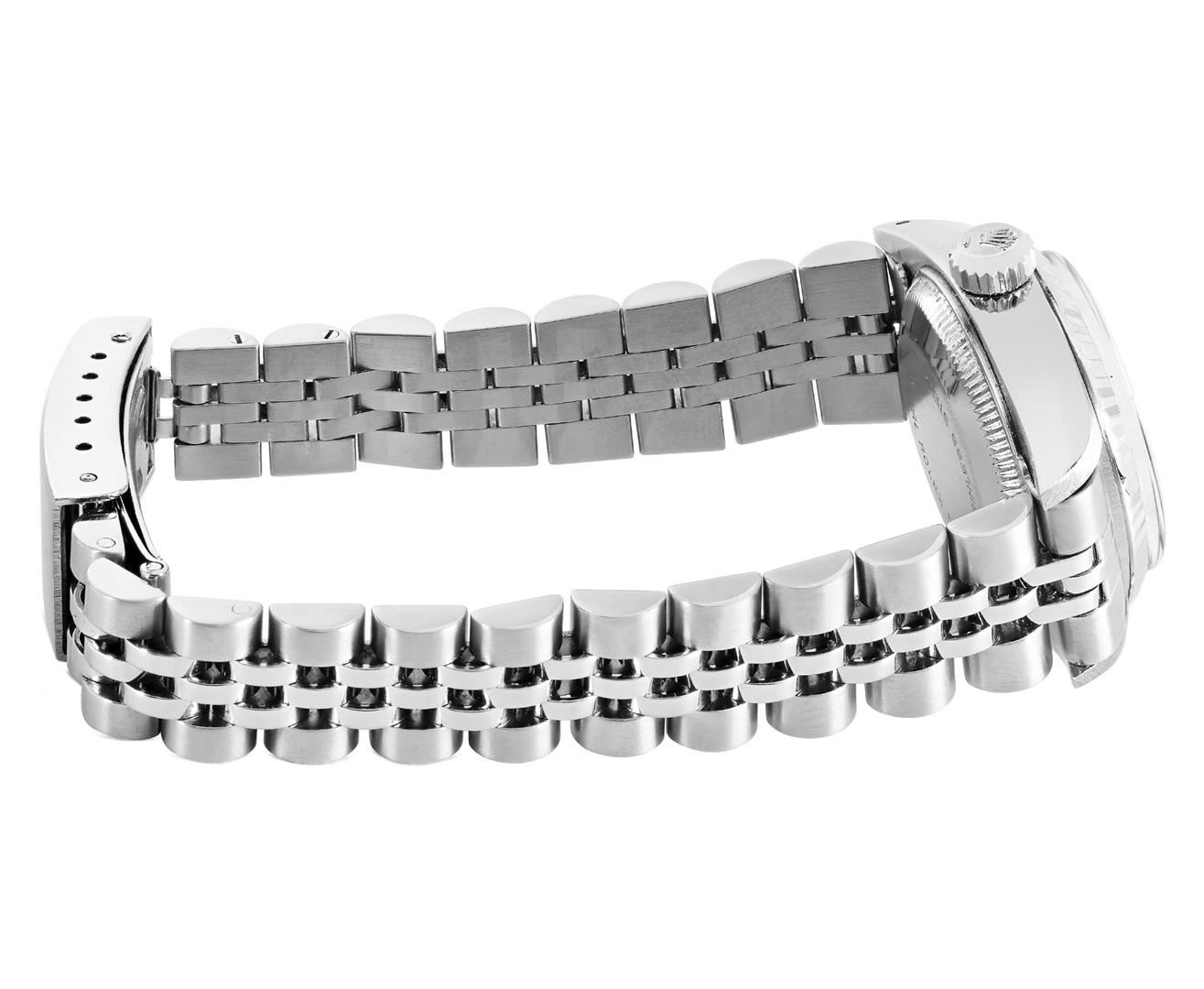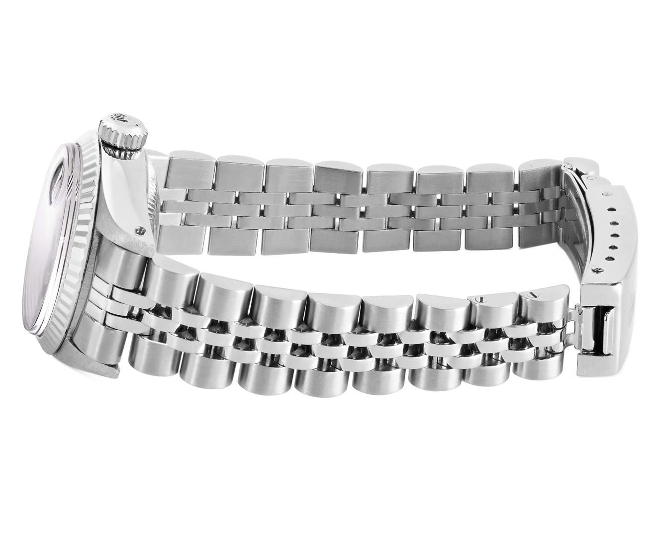 One Rolex Ladies Pre Owned Stainless Steel Date Wristwatch Polished Bright with Satin Finish, Serviced & Electronically Tested, Stainless Steel Case: 26mm, Stainless Steel Crown, 14K White Gold Fluted Bezel, Custom Crystal: New Acrylic With Magnifying Dat