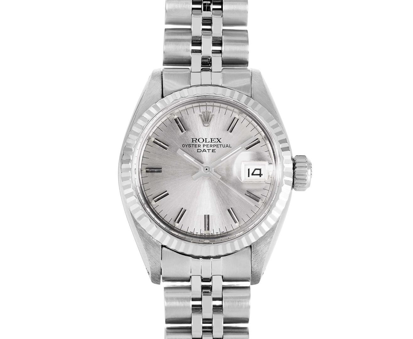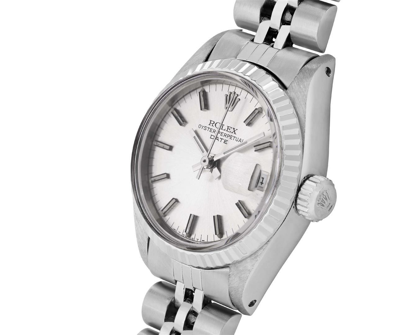 One Rolex Ladies Pre Owned Stainless Steel Date Wristwatch Polished Bright with Satin Finish, Serviced & Electronically Tested, Stainless Steel Case: 26mm, Stainless Steel Crown, 14K White Gold Fluted Bezel, Custom Crystal: New Acrylic With Magnifying Date Window. Custom Hands: New Luminescent Hands. Rolex Movement: Automatic Winding Movement 2030. Rolex Dial: Factory Silver With Index Hour Markers And Lumi Dots. Date Window: 3 O'Clock Position Date Display, Model: Date. Condition: G-6 Extra Fine. Rolex Bracelet: Stainless Steel Jubilee Band. Bright Polish & Satin Finish. 6.0 Inch Length, Adjustable. Standard Clasp, With Rolex Logo. This Watch Has Been Serviced Time Tested And Is In Excellent Condition. It Is Free Of All Scratches And Dents.