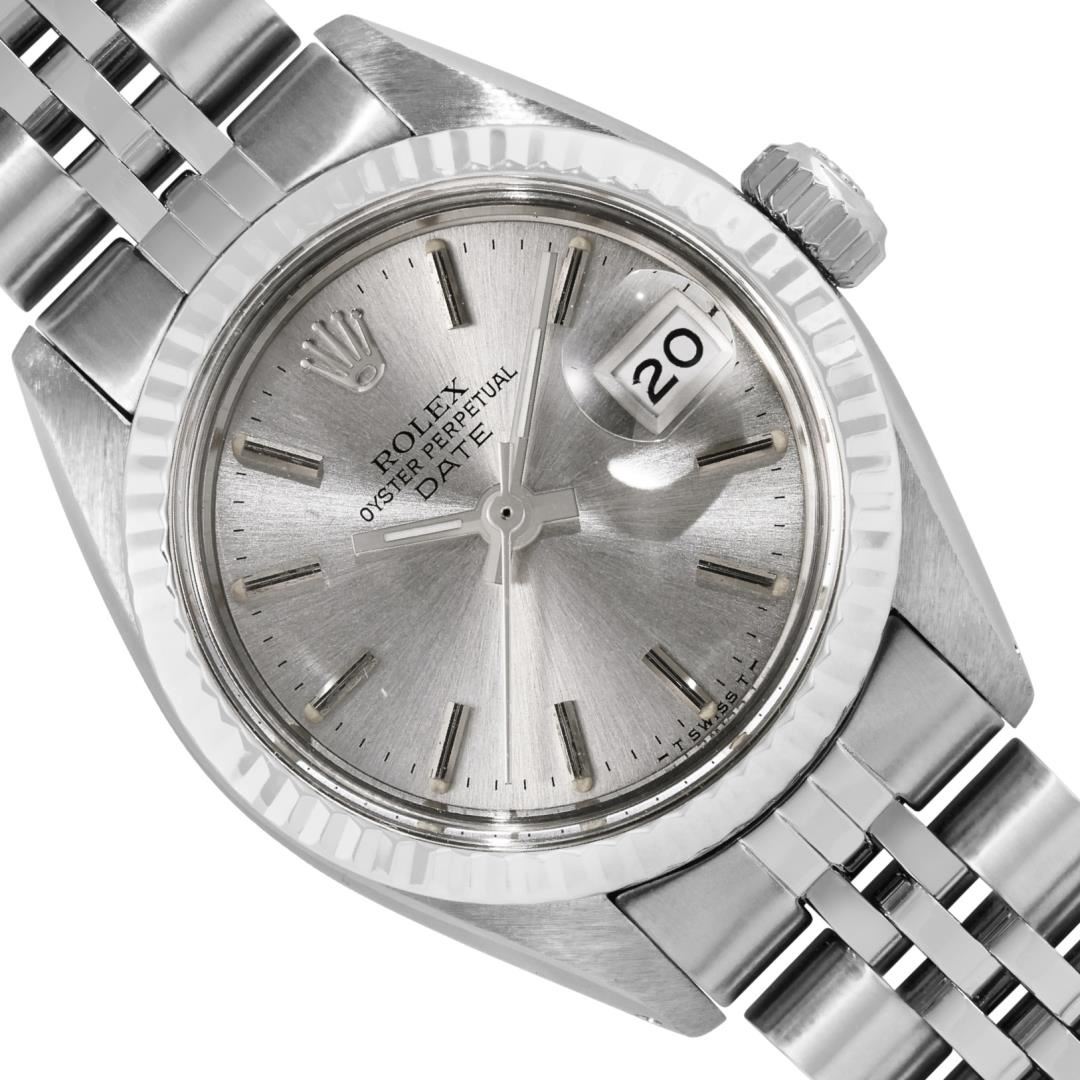 One Rolex Ladies Pre Owned Stainless Steel Date Wristwatch Polished Bright with Satin Finish, Serviced & Electronically Tested, Stainless Steel Case: 26mm, Stainless Steel Crown, 14K White Gold Fluted Bezel, Custom Crystal: New Acrylic With Magnifying Date Window. Custom Hands: New Luminescent Hands. Rolex Movement: Automatic Winding Movement 2035. Rolex Dial: Factory Silver With Index Hour Markers, Dash Tracks, And Lumi Dots. Date Window: 3 O'Clock Position Date Display, Model: Date. Condition: G-6 Extra Fine. Rolex Bracelet: Stainless Steel Jubilee Band. Bright Polish & Satin Finish. 6.0 Inch Length, Adjustable. Standard Clasp, With Rolex Logo. This Watch Has Been Serviced Time Tested And Is In Excellent Condition. It Is Free Of All Scratches And Dents.