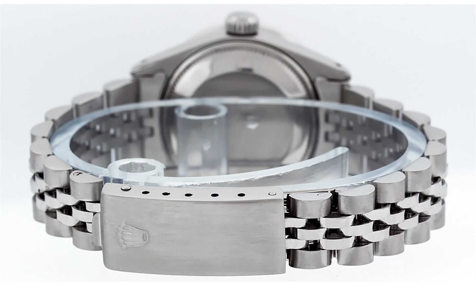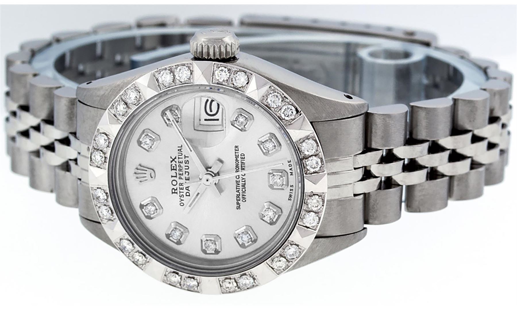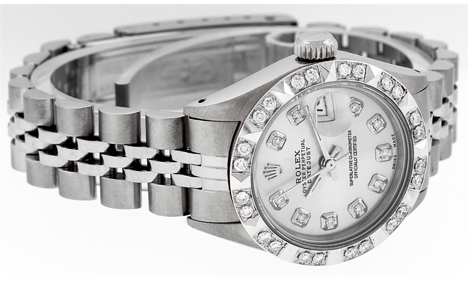 One Ladies Stainless Steel Rolex Datejust Polished Bright with Satin Finish, Serviced & Electronically Tested, Stainless Steel Case: 26mm, Stainless Steel Crown, Custom Bezel: New 18K White Gold Pyramid Diamond Bezel, Diamond Count: 24 Diamonds In Dial. Total Weight .50 Carat, Clarity: SI-VS, Color: G to H. Custom Crystal: New Scratch Resistant Synthetic Sapphire Cyclops Lens. Custom Hands: New Luminescent Hands. Movement: Automatic Winding Movement. Custom Dial: Silver Diamond Dial. Diamond Count: 10 Diamonds In Dial. Clarity: SI-VS, Color: G to H. Date Window: 3 O'Clock Position Date Display, Model: Datejust. Condition: G-6 Extra Fine. Bracelet: Stainless Steel Jubilee Band With Rolex Crown On Buckle. Bright Polish & Satin Finish. Band Length: 6.0 Inch Length, Adjustable. Standard Clasp, With Rolex Logo. This Watch Has Been Serviced Time Tested And Is In Excellent Condition It Is Free Of All Scratches And Dents.