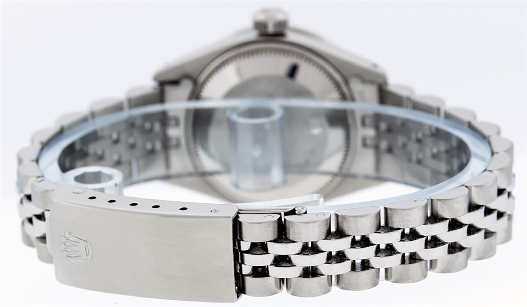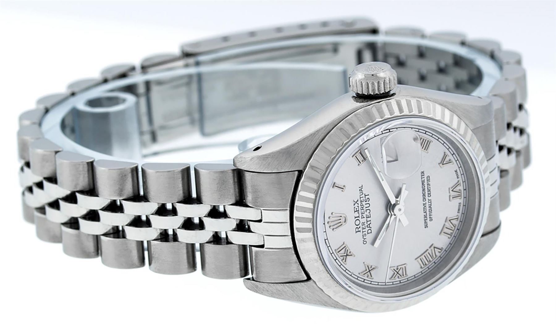 One Pre Owned Ladies Stainless Steel Rolex Polished Bright with Satin Finish, Serviced & Electronically Tested, Rolex Stainless Steel Case: 26mm, Rolex Stainless Steel Crown, Rolex Bezel: 14K White Gold Bezel. Custom Crystal: Acrylic With Magnified Date Window. Custom Hands: New Luminescent Hands. Rolex Movement: Automatic Winding Movement. Custom Dial: Refinished To Silver Roman Dial. Date Window: 3 O'Clock Position Date Display, Model: Datejust. Condition: G-6 Extra Fine. Rolex Bracelet: Stainless Steel Jubilee Band. Bright Polish & Satin Finish. 6.0 Inch Length, Adjustable. Standard Clasp, With Rolex Logo. This Watch Has Been Serviced Time Tested And Is In Excellent Condition It Is Free Of All Scratches And Dents.