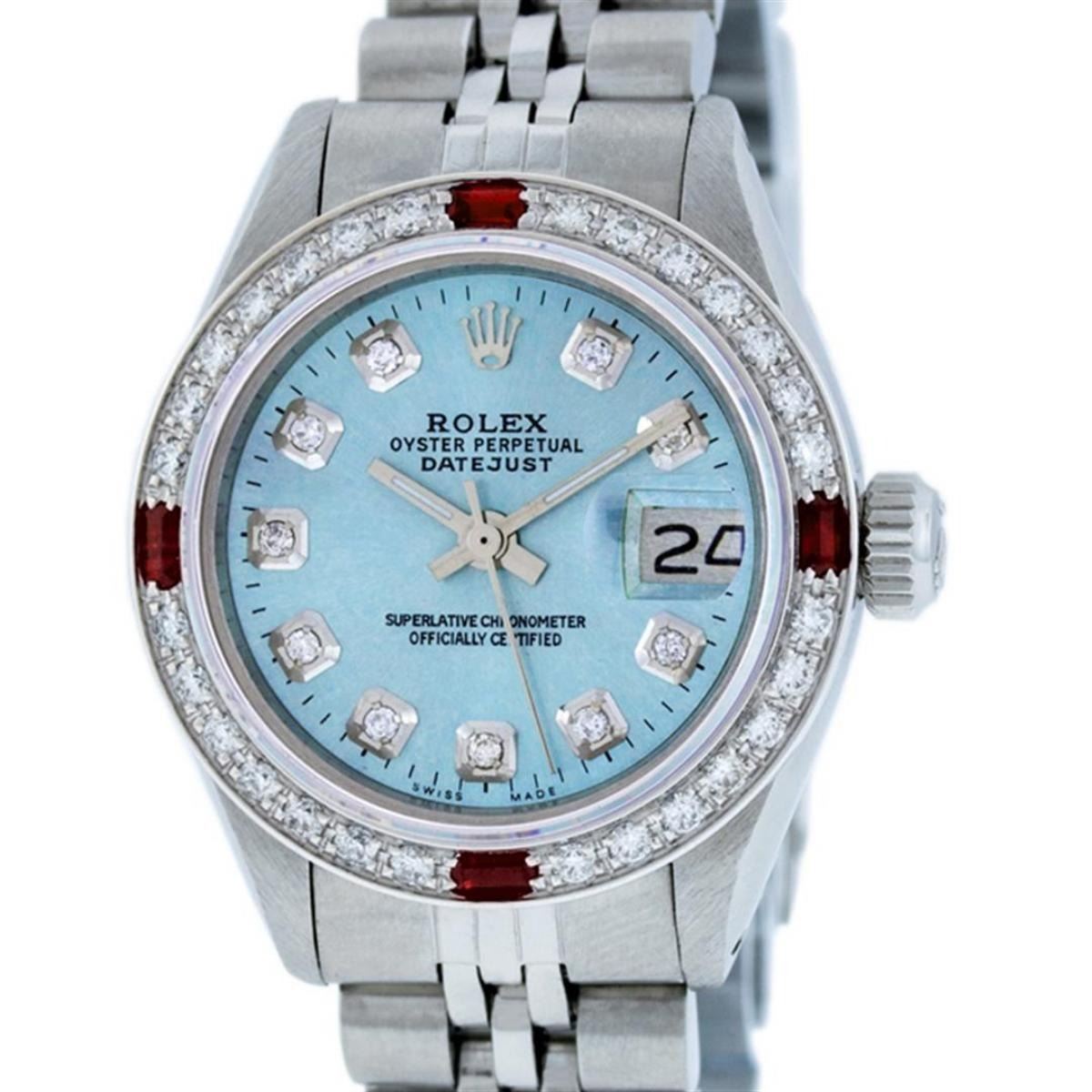 One Ladies Stainless Steel Rolex Datejust Polished Bright with Satin Finish, Serviced & Electronically Tested, Stainless Steel Case: 26mm, Stainless Steel Crown, Custom Bezel: New 18K White Gold Ruby Beadset Diamond Bezel, Diamond + Gem Count: 28 Diamonds + 4 Rubies. Total Weight .70 Carat, Clarity: SI-VS, Color: G to H. Custom Crystal: New Scratch Resistant Synthetic Sapphire Cyclops Lens. Custom Hands: New Luminescent Hands. Movement: Automatic Winding Movement. Custom Dial: Refinished Sky Blue With Diamond Hour Markers & Dash Tracks, 10 Diamonds in Dial, G To H In Color, Clarity: SI-VS. Date Window: 3 O'Clock Position Date Display, Model: Datejust. Condition: G-6 Extra Fine. Bracelet: Stainless Steel Jubilee Band. Bright Polish & Satin Finish. 6.0 Inch Length, Adjustable. Standard Clasp, With Rolex Logo. This Watch Has Been Serviced Time Tested And Is In Excellent Condition It Is Free Of All Scratches And Dents.