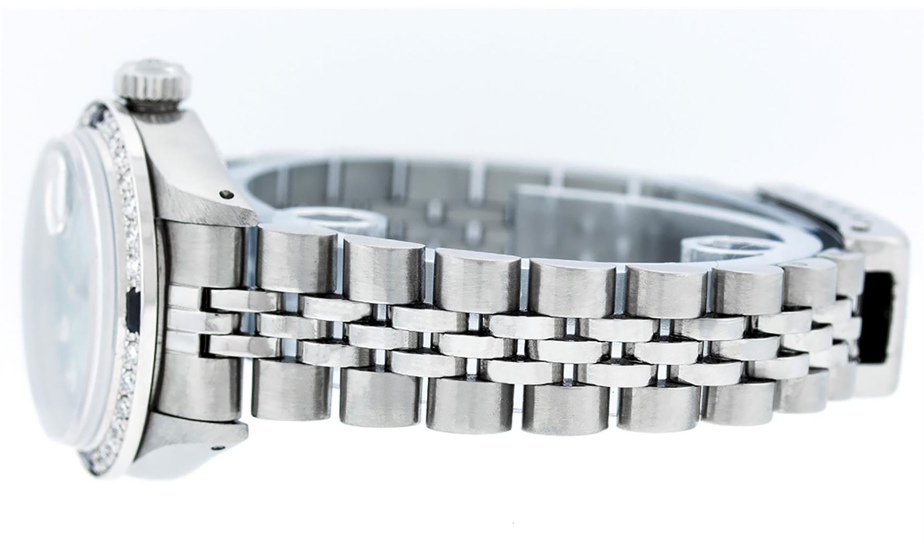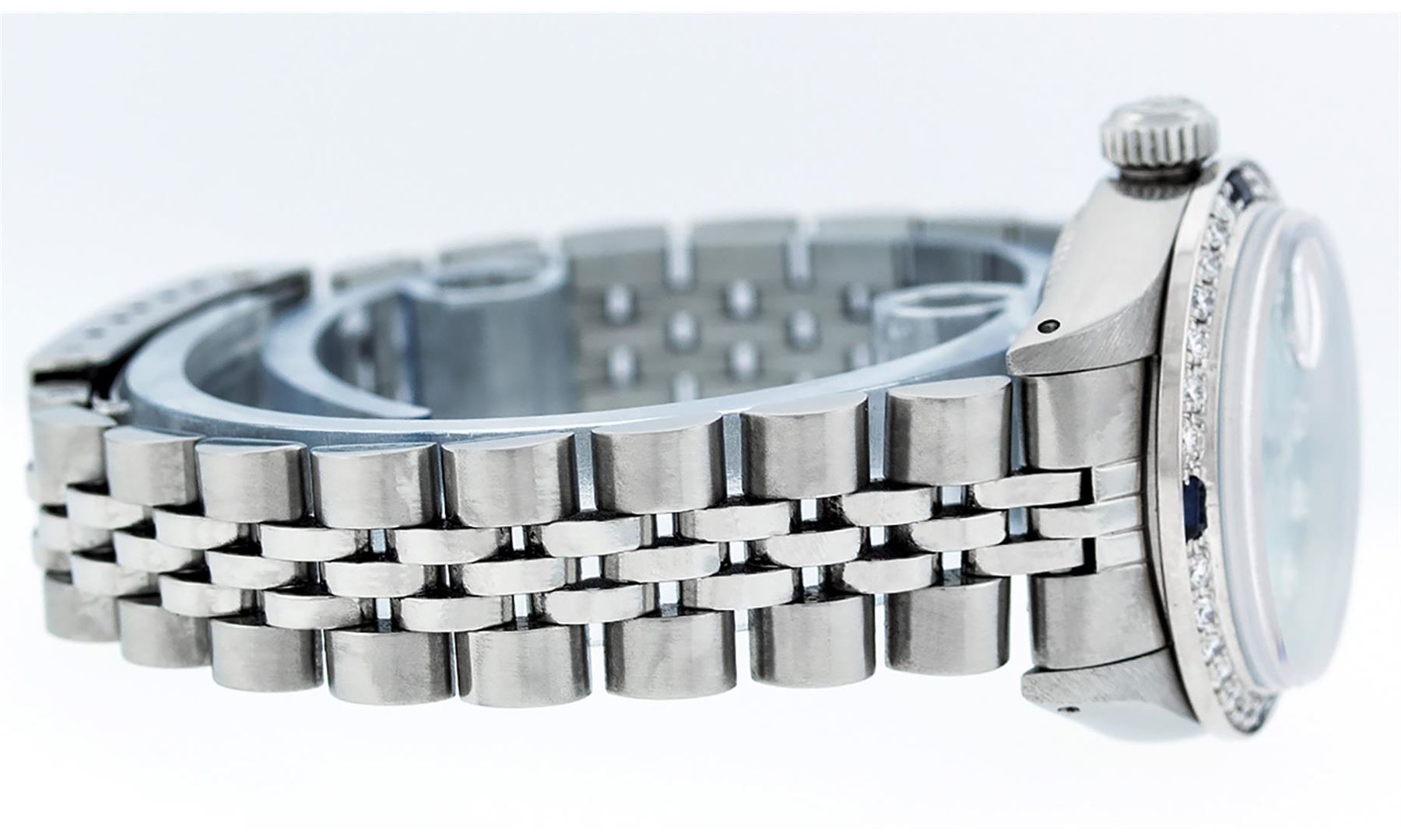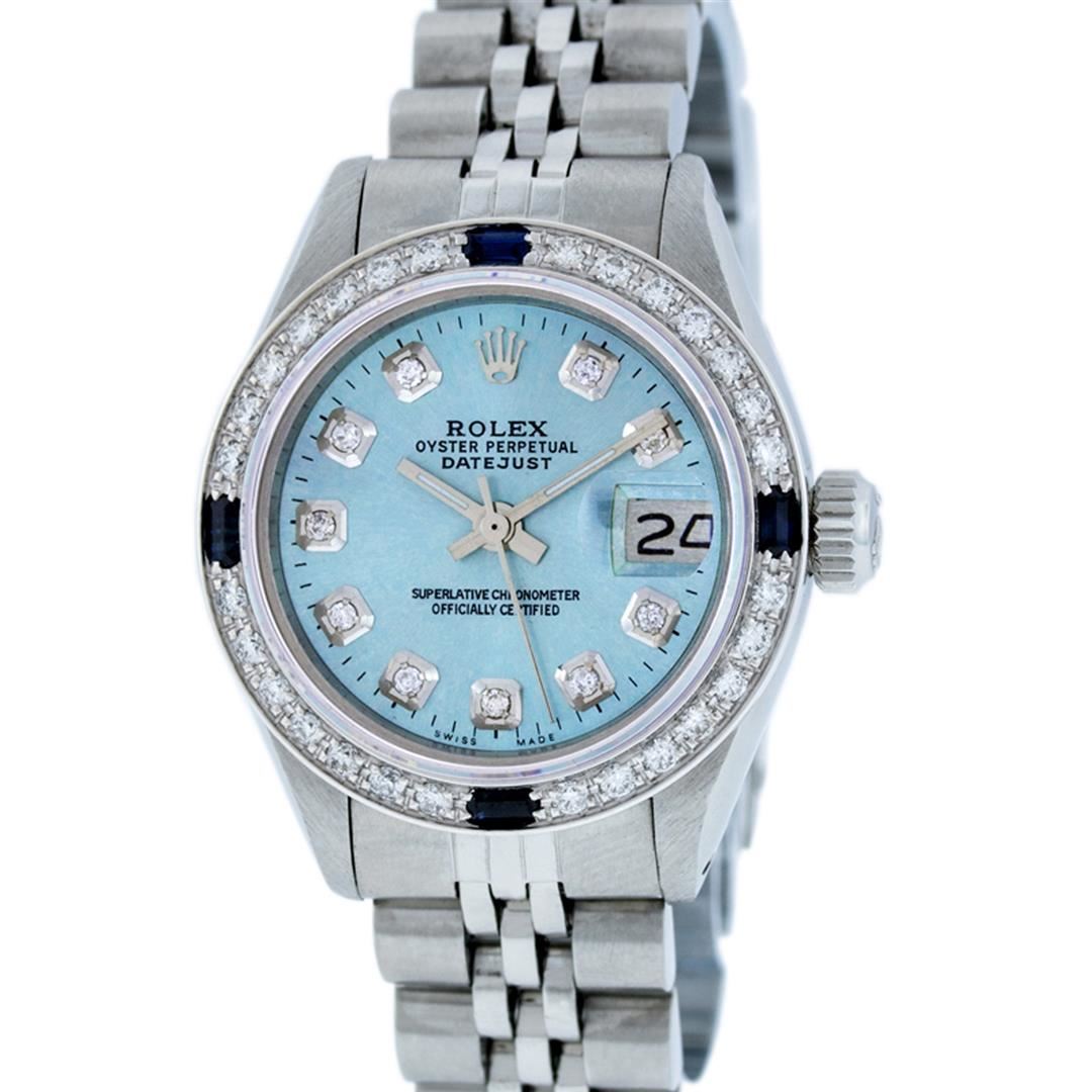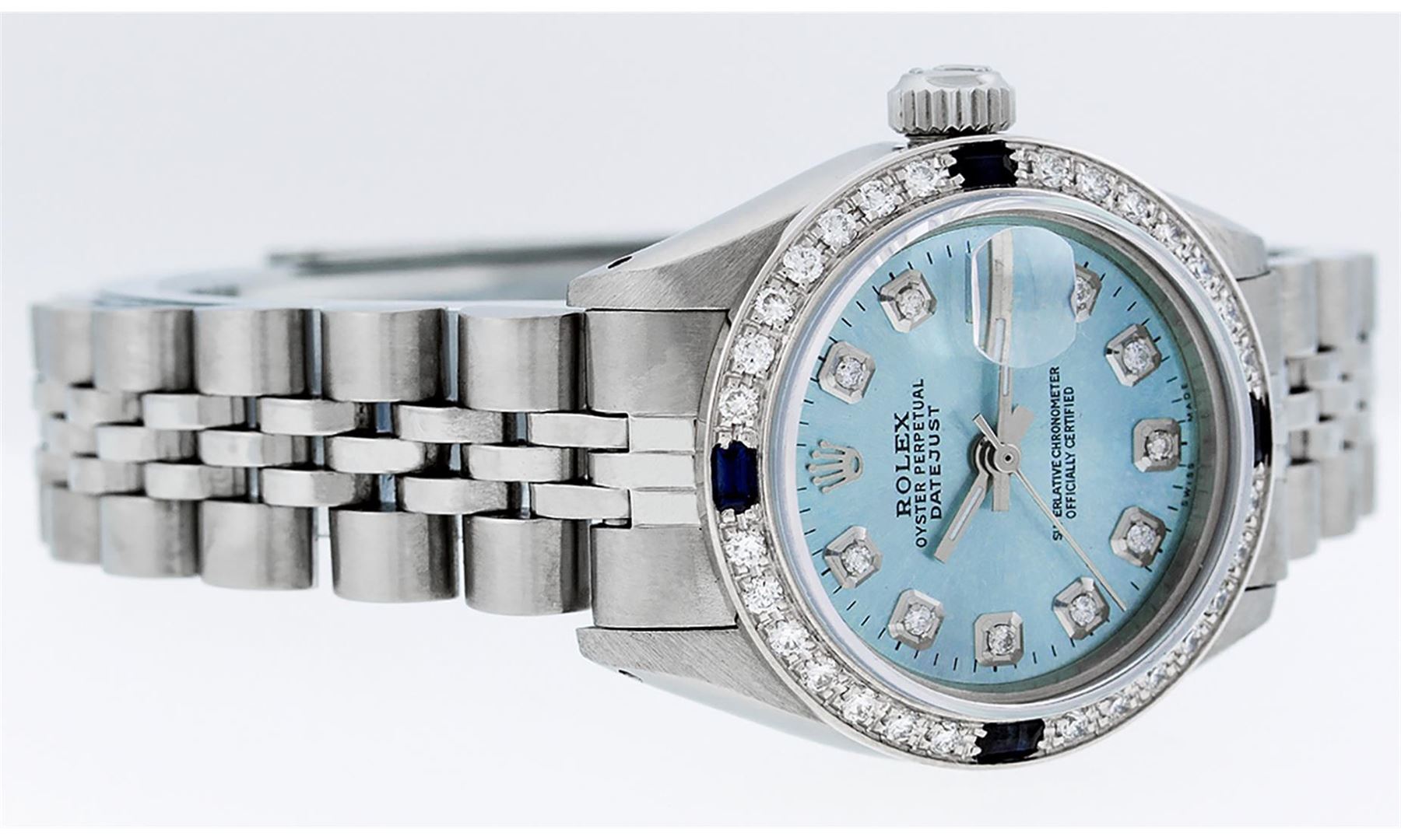 One Ladies Stainless Steel Rolex Datejust Polished Bright with Satin Finish, Serviced & Electronically Tested, Stainless Steel Case: 26mm, Stainless Steel Crown, Custom Bezel: New 18K White Gold Sapphire Beadset Diamond Bezel, Diamond + Gem Count: 28 Diamonds + 4 Sapphires. Total Weight .70 Carat, Clarity: SI-VS, Color: G to H. Custom Crystal: New Scratch Resistant Synthetic Sapphire Cyclops Lens. Custom Hands: New Luminescent Hands. Movement: Automatic Winding Movement. Custom Dial: Refinished Sky Blue With Diamond Hour Markers & Dash Tracks, 10 Diamonds in Dial, G To H In Color, Clarity: SI-VS. Date Window: 3 O'Clock Position Date Display, Model: Datejust. Condition: G-6 Extra Fine. Bracelet: Stainless Steel Jubilee Band. Bright Polish & Satin Finish. 6.0 Inch Length, Adjustable. Standard Clasp, With Rolex Logo. This Watch Has Been Serviced Time Tested And Is In Excellent Condition It Is Free Of All Scratches And Dents.