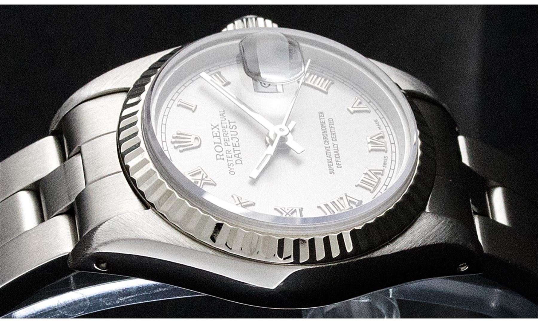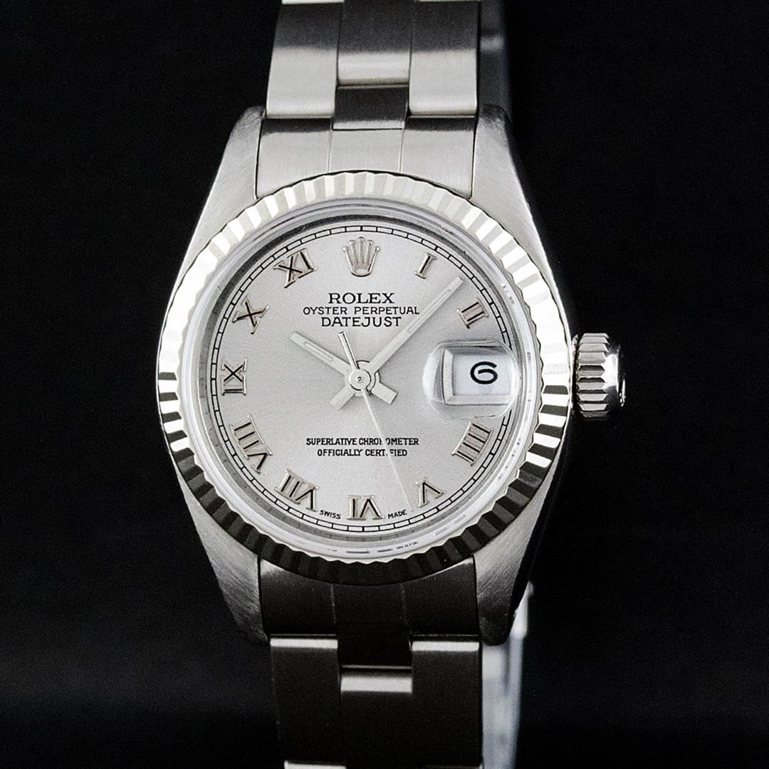 One Ladies Stainless Steel Rolex Datejust Polished Bright with Satin Finish, Serviced & Electronically Tested, Stainless Steel Case: 26mm, Stainless Steel Crown, Bezel: 14K White Gold Bezel. Custom Crystal: New Acrylic Cyclops Lens. Custom Hands: New Luminescent Hands. Movement: Automatic Winding Movement. Custom Dial: Slate Grey Roman Dial With Square Track. Date Window: 3 O'Clock Position Date Display, Model: Datejust. Condition: G-6 Extra Fine. Bracelet: Stainless Steel Oyster Band. Bright Polish & Satin Finish. 6.0 Inch Length, Adjustable. Standard Clasp, With Rolex Logo. This Watch Has Been Serviced Time Tested And Is In Excellent Condition It Is Free Of All Scratches And Dents.