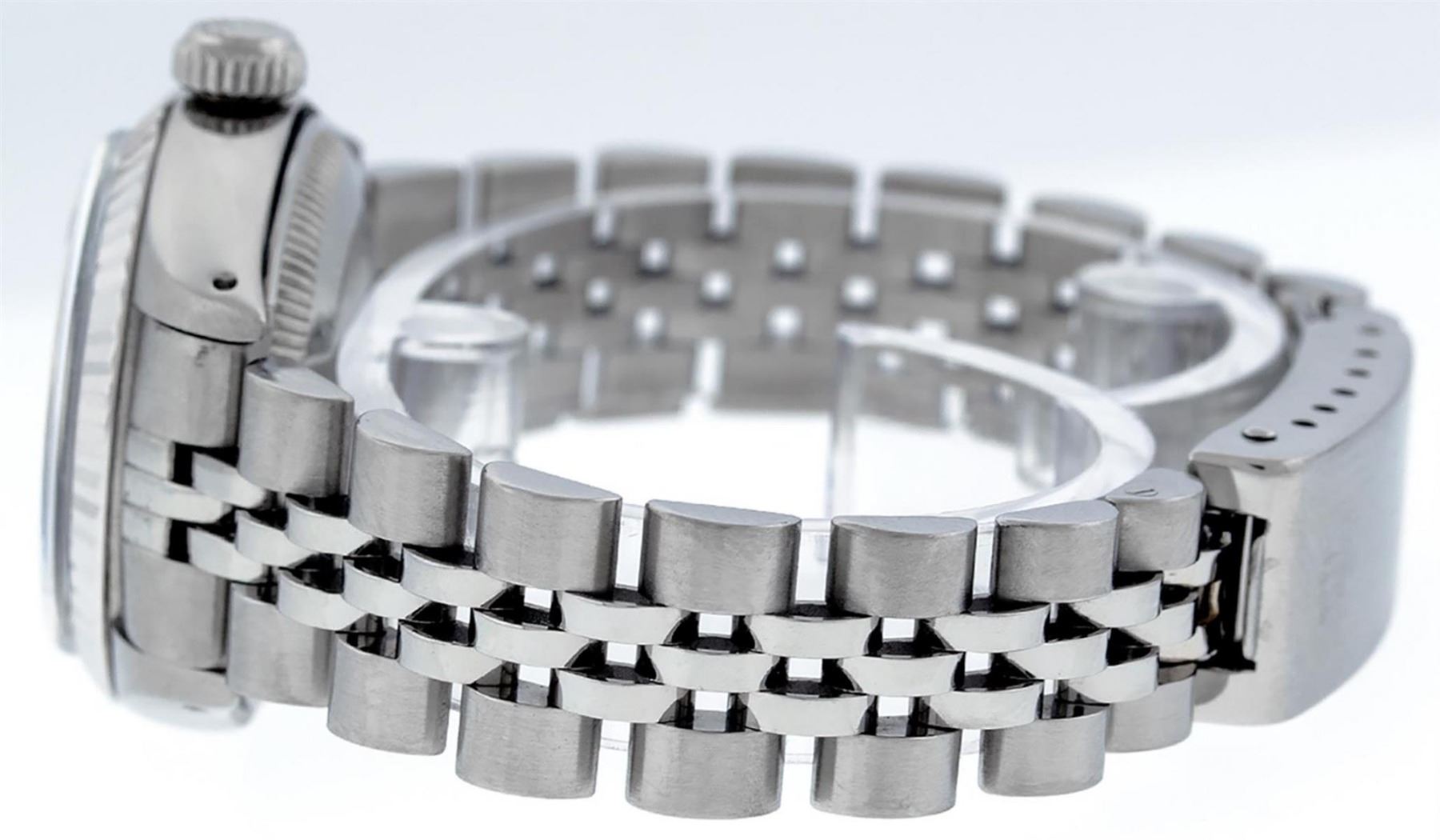 One Ladies Stainless Steel Rolex Datejust Polished Bright with Satin Finish, Serviced & Electronically Tested, Stainless Steel Case: 26mm, Stainless Steel Crown, Bezel: 14K White Gold Bezel. Custom Crystal: New Acrylic Cyclops Lens. Custom Hands: New Luminescent Hands. Movement: Automatic Winding Movement. Dial: Slate Grey Diamond Dial, Diamond Count: 10 Diamonds In Dial, Color: G to H, Clarity: SI-VS. Date Window: 3 O'Clock Position Date Display, Model: Datejust. Condition: G-6 Extra Fine. Bracelet: Stainless Steel Jubilee Band. Bright Polish & Satin Finish. 6.0 Inch Length, Adjustable. Standard Clasp, With Rolex Logo. This Watch Has Been Serviced Time Tested And Is In Excellent Condition It Is Free Of All Scratches And Dents.