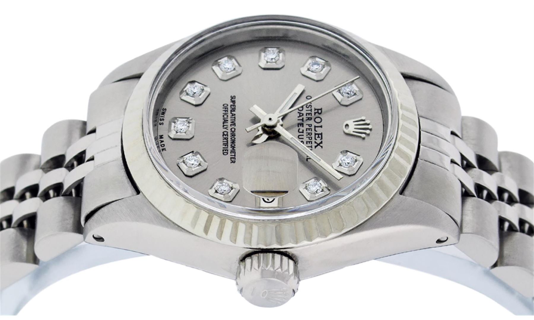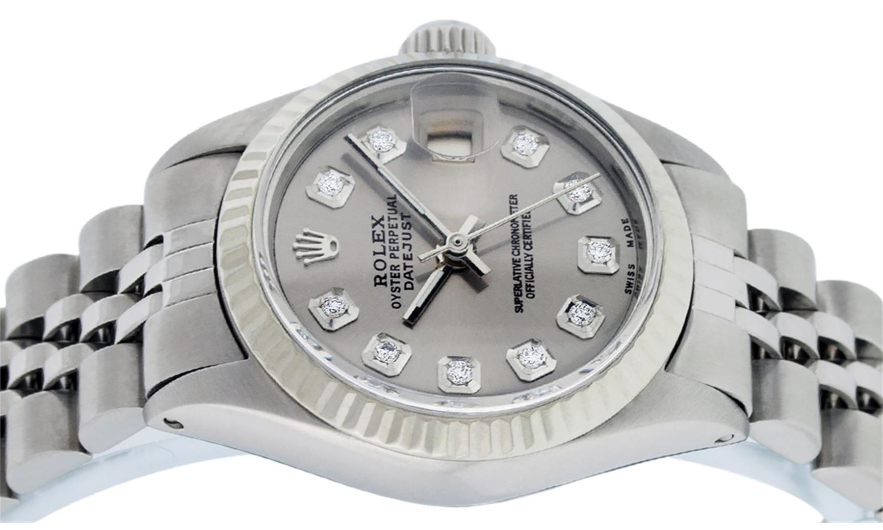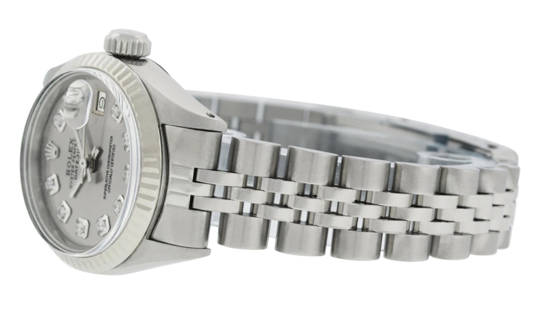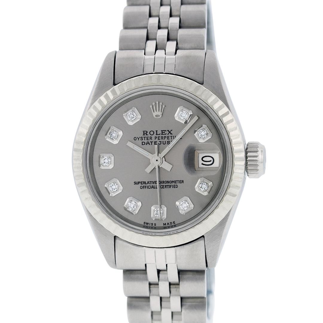 One Ladies Stainless Steel Rolex Datejust Polished Bright with Satin Finish, Serviced & Electronically Tested, Stainless Steel Case: 26mm, Stainless Steel Crown, Bezel: 14K White Gold Bezel. Custom Crystal: New Acrylic Cyclops Lens. Custom Hands: New Luminescent Hands. Movement: Automatic Winding Movement. Dial: Slate Grey Diamond Dial, Diamond Count: 10 Diamonds In Dial, Color: G to H, Clarity: SI-VS. Date Window: 3 O'Clock Position Date Display, Model: Datejust. Condition: G-6 Extra Fine. Bracelet: Stainless Steel Jubilee Band. Bright Polish & Satin Finish. 6.0 Inch Length, Adjustable. Standard Clasp, With Rolex Logo. This Watch Has Been Serviced Time Tested And Is In Excellent Condition It Is Free Of All Scratches And Dents.