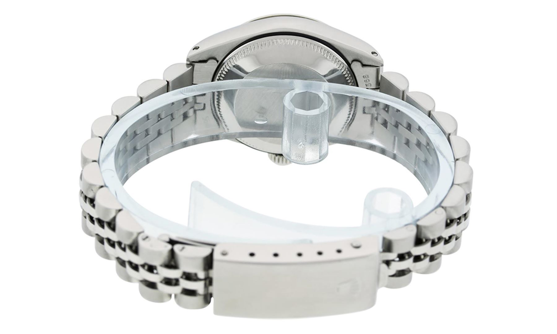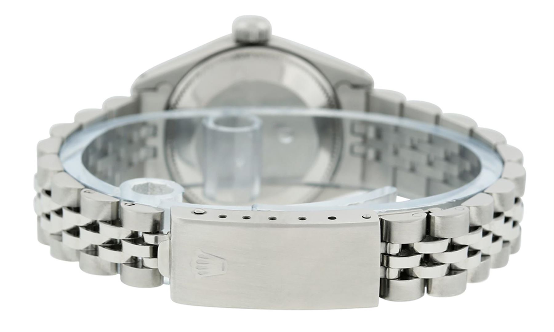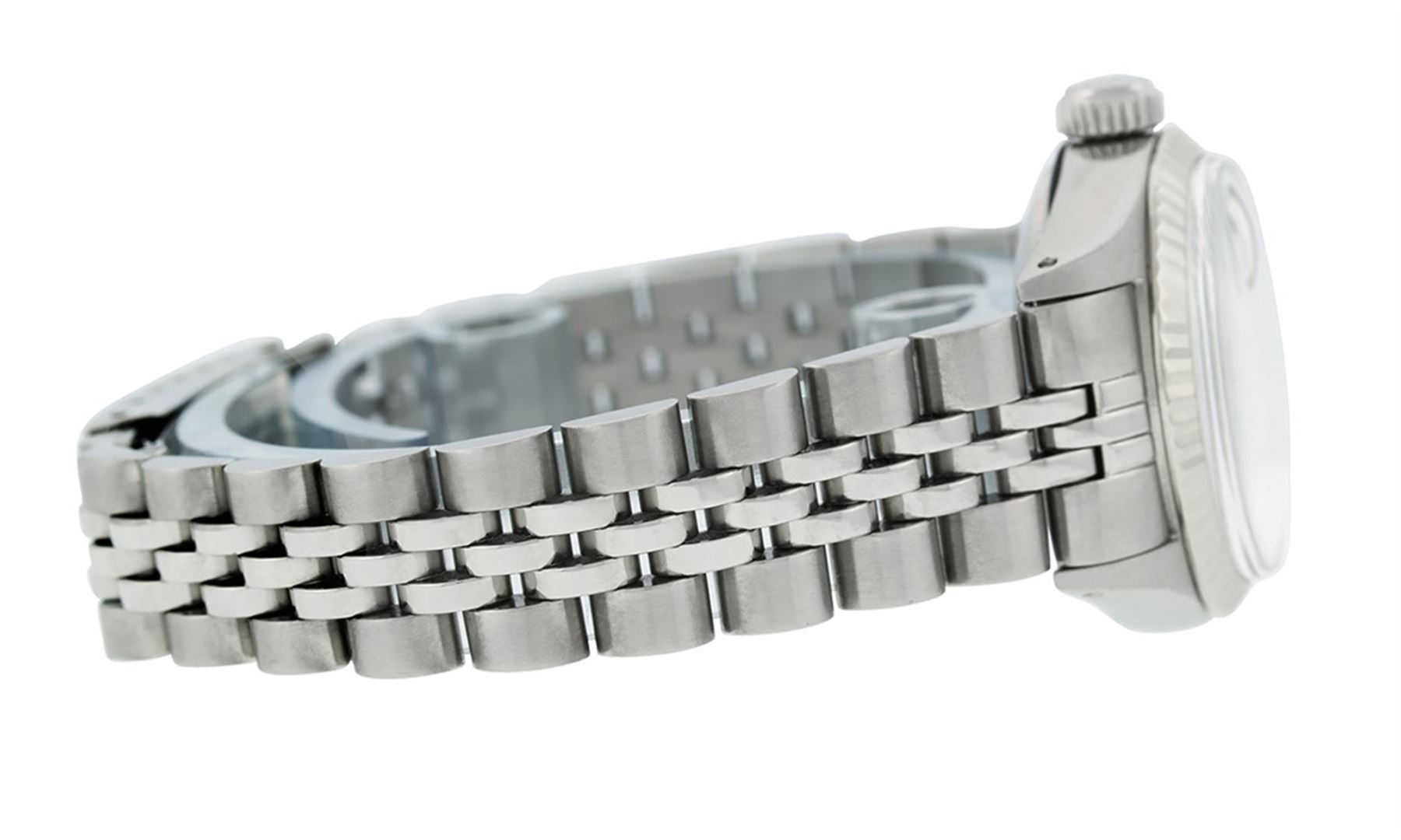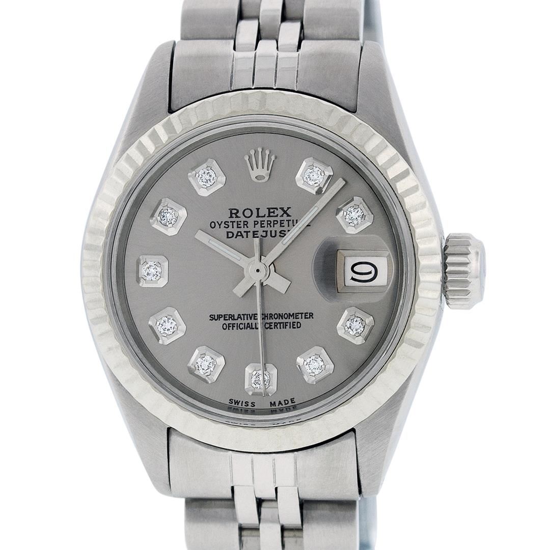One Ladies Stainless Steel Rolex Datejust Polished Bright with Satin Finish, Serviced & Electronically Tested, Stainless Steel Case: 26mm, Stainless Steel Crown, Bezel: 14K White Gold Bezel. Custom Crystal: New Acrylic Cyclops Lens. Custom Hands: New Luminescent Hands. Movement: Automatic Winding Movement. Dial: Slate Grey Diamond Dial, Diamond Count: 10 Diamonds In Dial, Color: G to H, Clarity: SI-VS. Date Window: 3 O'Clock Position Date Display, Model: Datejust. Condition: G-6 Extra Fine. Bracelet: Stainless Steel Jubilee Band. Bright Polish & Satin Finish. 6.0 Inch Length, Adjustable. Standard Clasp, With Rolex Logo. This Watch Has Been Serviced Time Tested And Is In Excellent Condition It Is Free Of All Scratches And Dents.