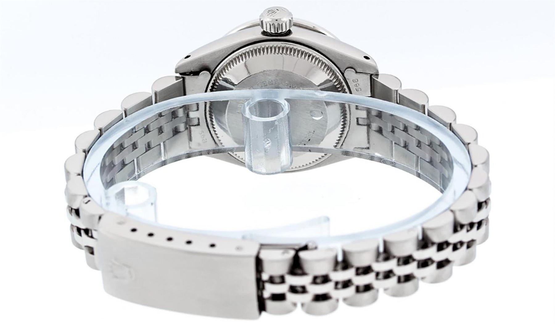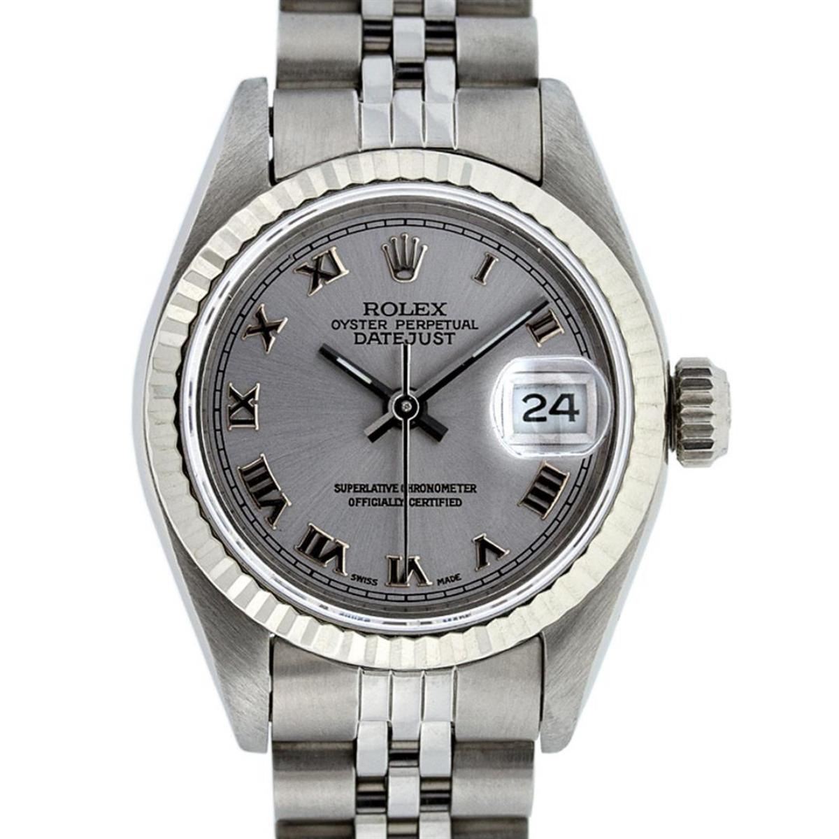 One Ladies Stainless Steel Rolex Datejust Polished Bright with Satin Finish, Serviced & Electronically Tested, Stainless Steel Case: 26mm, Stainless Steel Crown, Bezel: 14K White Gold Bezel. Custom Crystal: New Acrylic Cyclops Lens. Custom Hands: New Luminescent Hands. Movement: Automatic Winding Movement. Custom Dial: Refinished Slate Grey Roman Dial. Date Window: 3 O'Clock Position Date Display, Model: Datejust. Condition: G-6 Extra Fine. Bracelet: Stainless Steel Jubilee Band. Bright Polish & Satin Finish. 6.0 Inch Length, Adjustable. Standard Clasp, With Rolex Logo. This Watch Has Been Serviced Time Tested And Is In Excellent Condition It Is Free Of All Scratches And Dents.