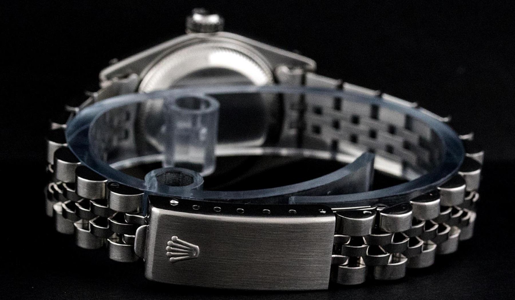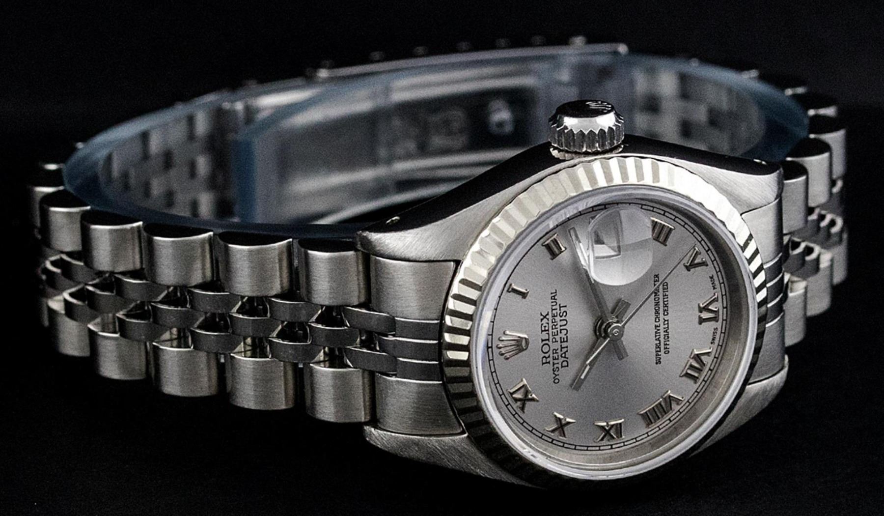 One Ladies Stainless Steel Rolex Datejust Polished Bright with Satin Finish, Serviced & Electronically Tested, Stainless Steel Case: 26mm, Stainless Steel Crown, Bezel: 14K White Gold Bezel. Custom Crystal: New Acrylic Cyclops Lens. Custom Hands: New Luminescent Hands. Movement: Automatic Winding Movement. Custom Dial: Refinished Slate Grey Roman Dial. Date Window: 3 O'Clock Position Date Display, Model: Datejust. Condition: G-6 Extra Fine. Bracelet: Stainless Steel Jubilee Band. Bright Polish & Satin Finish. 6.0 Inch Length, Adjustable. Standard Clasp, With Rolex Logo. This Watch Has Been Serviced Time Tested And Is In Excellent Condition It Is Free Of All Scratches And Dents.