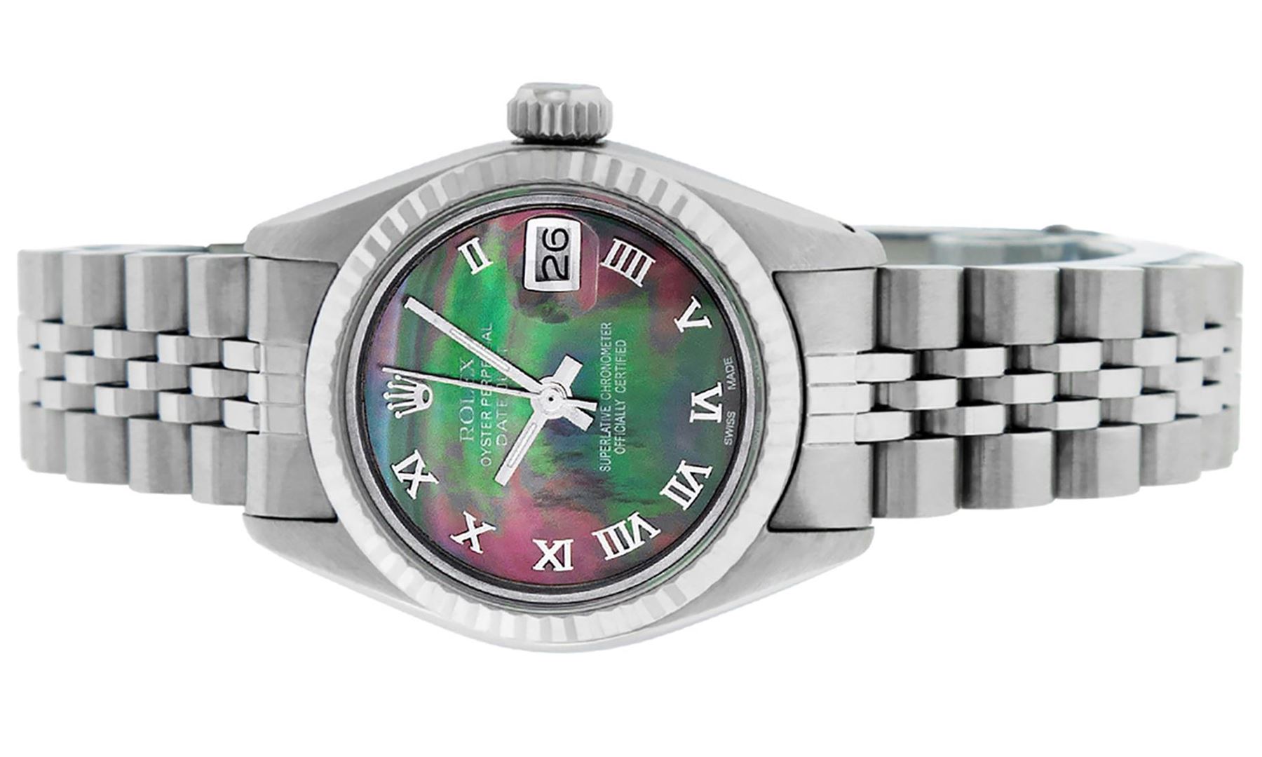 One Ladies Stainless Steel Rolex Datejust Polished Bright with Satin Finish, Serviced & Electronically Tested, Stainless Steel Case: 26mm, Stainless Steel Crown, Bezel: Fluted Bezel. Custom Crystal: New Acrylic Cyclops Lens. Custom Hands: New Luminescent Hands. Movement: Automatic Winding Movement. Dial: Tahitian Mother Of Pearl Roman Dial. Date Window: 3 O'Clock Position Date Display, Model: Datejust. Condition: G-6 Extra Fine. Bracelet: Stainless Steel Jubilee Band. Bright Polish & Satin Finish. 6.0 Inch Length, Adjustable. Standard Clasp, With Rolex Logo. This Watch Has Been Serviced Time Tested And Is In Excellent Condition It Is Free Of All Scratches And Dents.