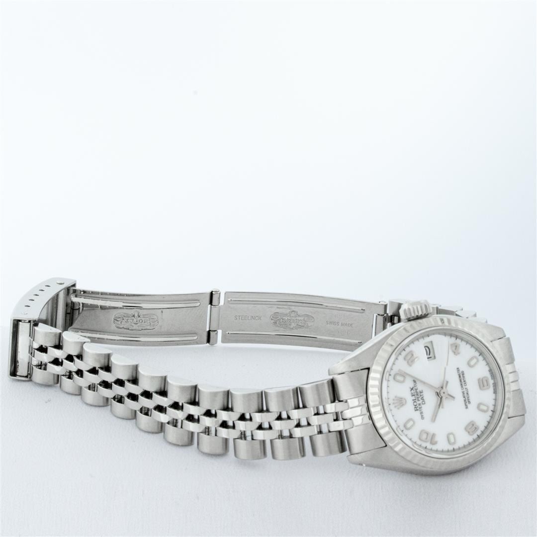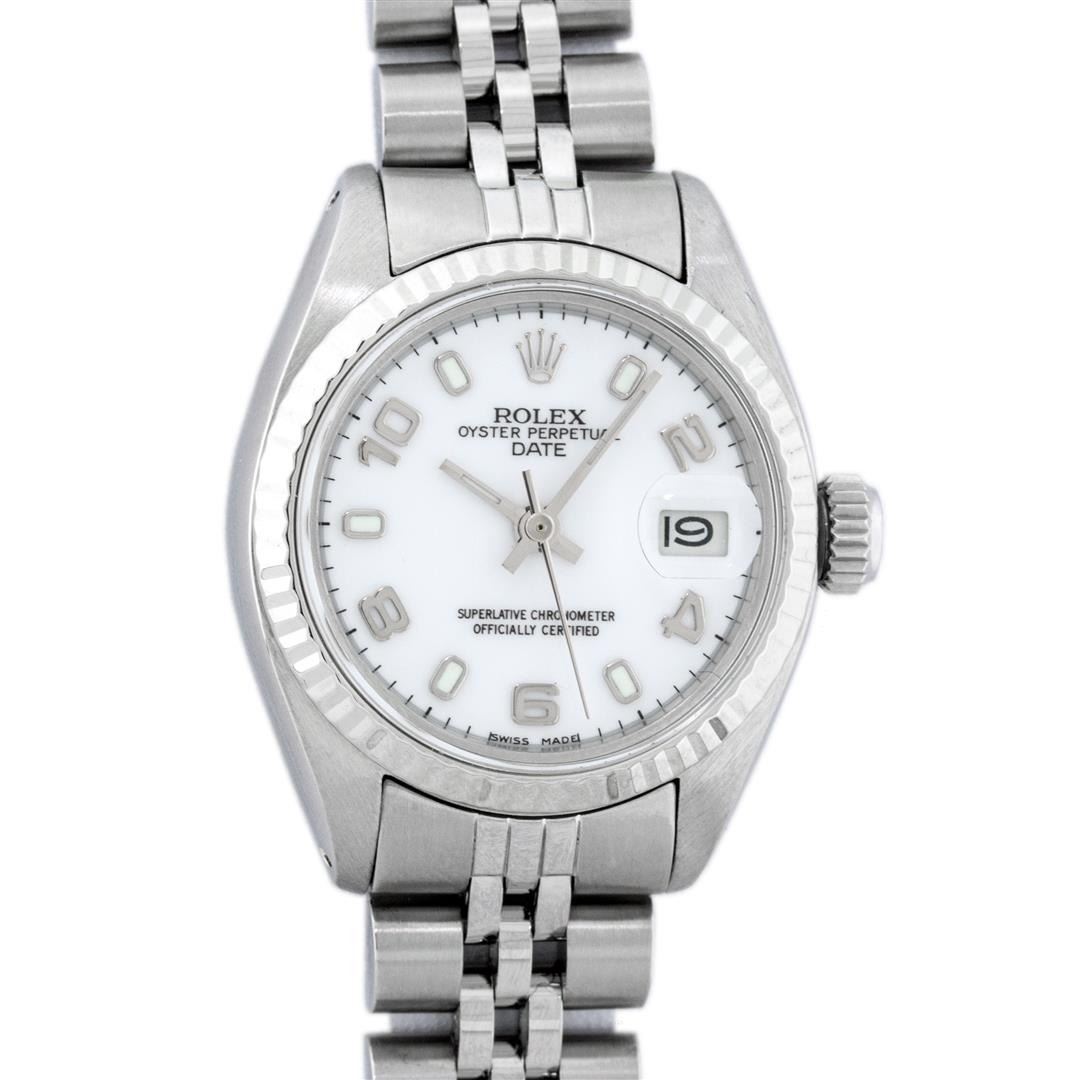 One Ladies Pre Owned Stainless Steel Rolex Polished Bright with Satin Finish, Serviced & Electronically Tested, Rolex Stainless Steel Case: 26mm, Rolex Stainless Steel Crown, Rolex Bezel: 14K White Gold Fluted Bezel. Custom Crystal: New With Magnified Date Window. Custom Hands: New Luminescent Hands. Rolex Movement: Automatic Winding Movement. Rolex Dial: White Arabic Dial With Dash Track, Date Window: 3 O'Clock Position Date Display, Model: Datejust. Condition: G-6 Extra Fine. Rolex Bracelet: Stainless Steel Jubilee Band. Bright Polish & Satin Finish. 6.0 Inch Length, Adjustable. Standard Clasp, With Rolex Logo. This Watch Has Been Serviced Time Tested And Is In Excellent Condition It Is Free Of All Scratches And Dents.