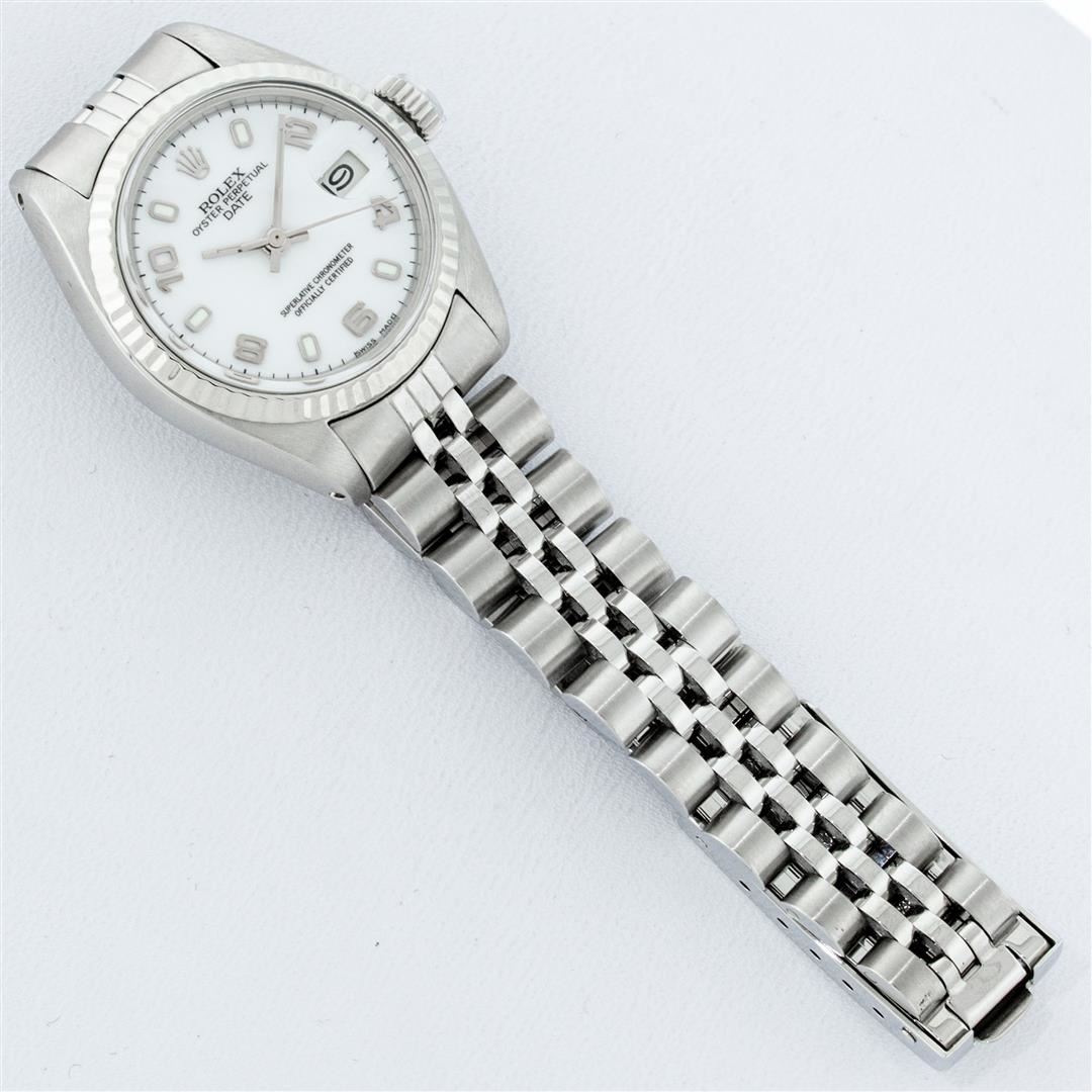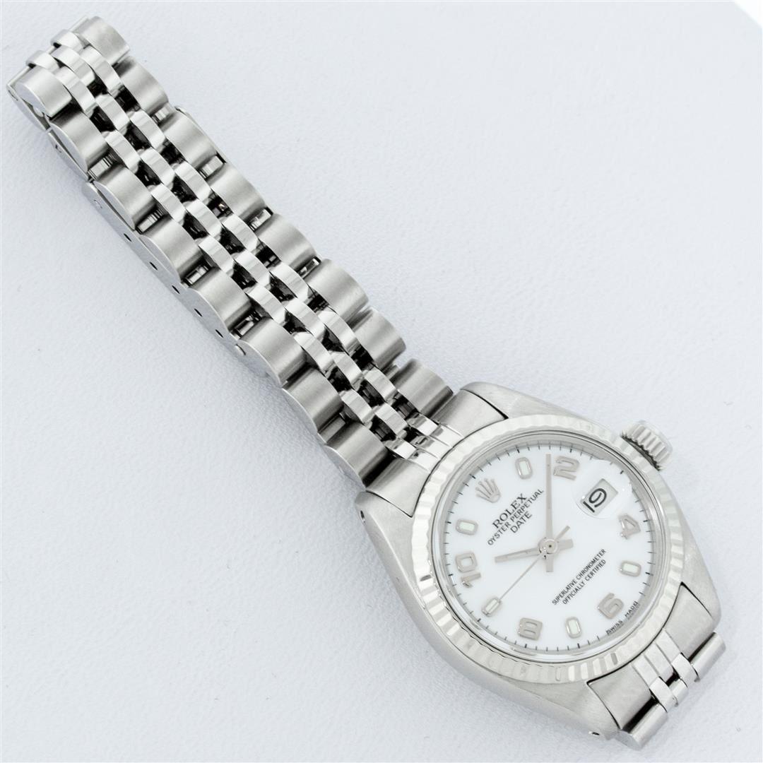 One Ladies Pre Owned Stainless Steel Rolex Polished Bright with Satin Finish, Serviced & Electronically Tested, Rolex Stainless Steel Case: 26mm, Rolex Stainless Steel Crown, Rolex Bezel: 14K White Gold Fluted Bezel. Custom Crystal: New With Magnified Date Window. Custom Hands: New Luminescent Hands. Rolex Movement: Automatic Winding Movement. Rolex Dial: White Arabic Dial With Dash Track, Date Window: 3 O'Clock Position Date Display, Model: Datejust. Condition: G-6 Extra Fine. Rolex Bracelet: Stainless Steel Jubilee Band. Bright Polish & Satin Finish. 6.0 Inch Length, Adjustable. Standard Clasp, With Rolex Logo. This Watch Has Been Serviced Time Tested And Is In Excellent Condition It Is Free Of All Scratches And Dents.
